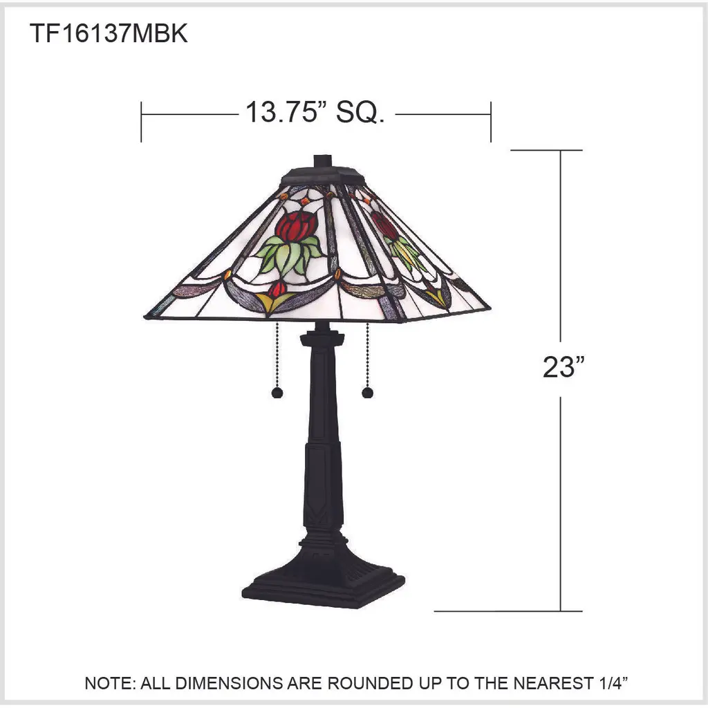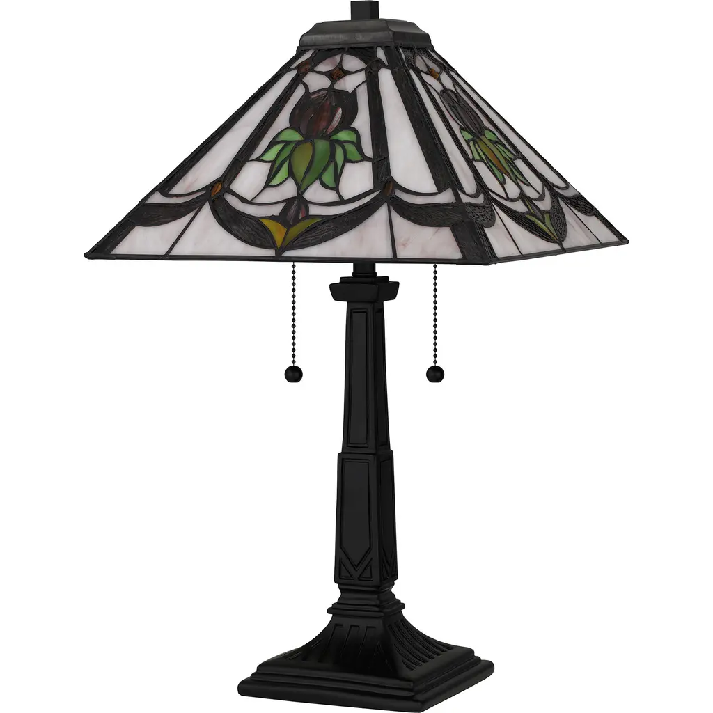 Collingwood's delicate, rose motif makes a pretty statement with multicolor art glass. The table lamp includes two pull chains and a classic, simple base Finish ed in matte black. The Tiffany glass shade is hand crafted and hand assembled, creating a one-of-a-kind piece that is perfect for a bedroom, kitchen, or home office.