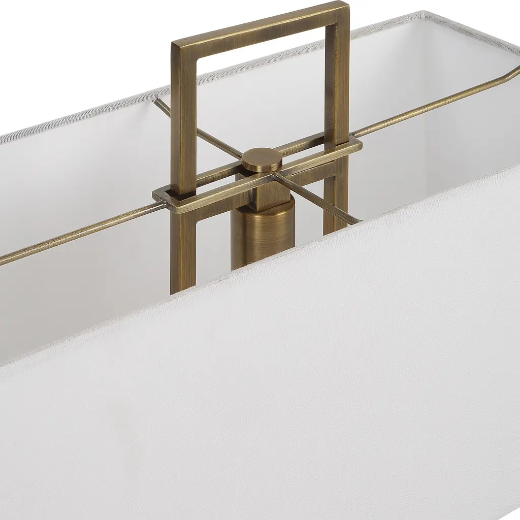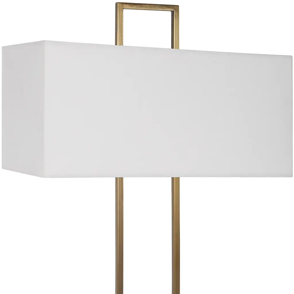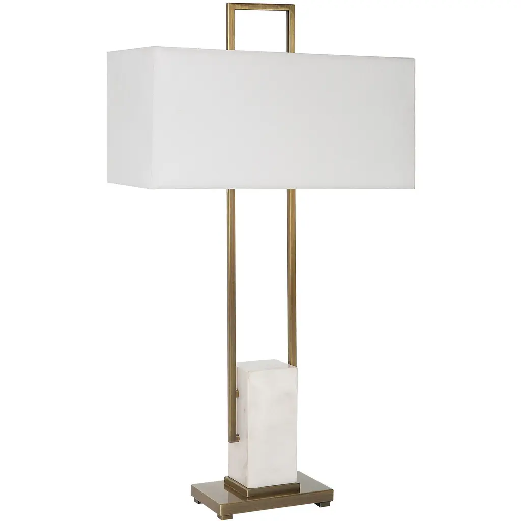 The Column Lamp Displays A Modern Look With Square Steel Bars Finished In Plated Brass And Matching Continuation Finial, Accented With A White Marble Pillar. The Rectangular Hardback Shade Is Covered In A White Linen Fabric.