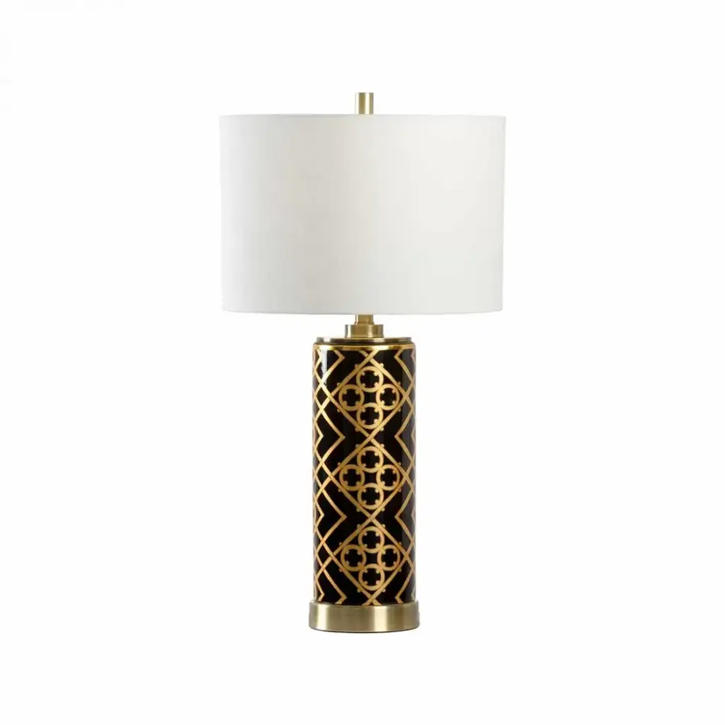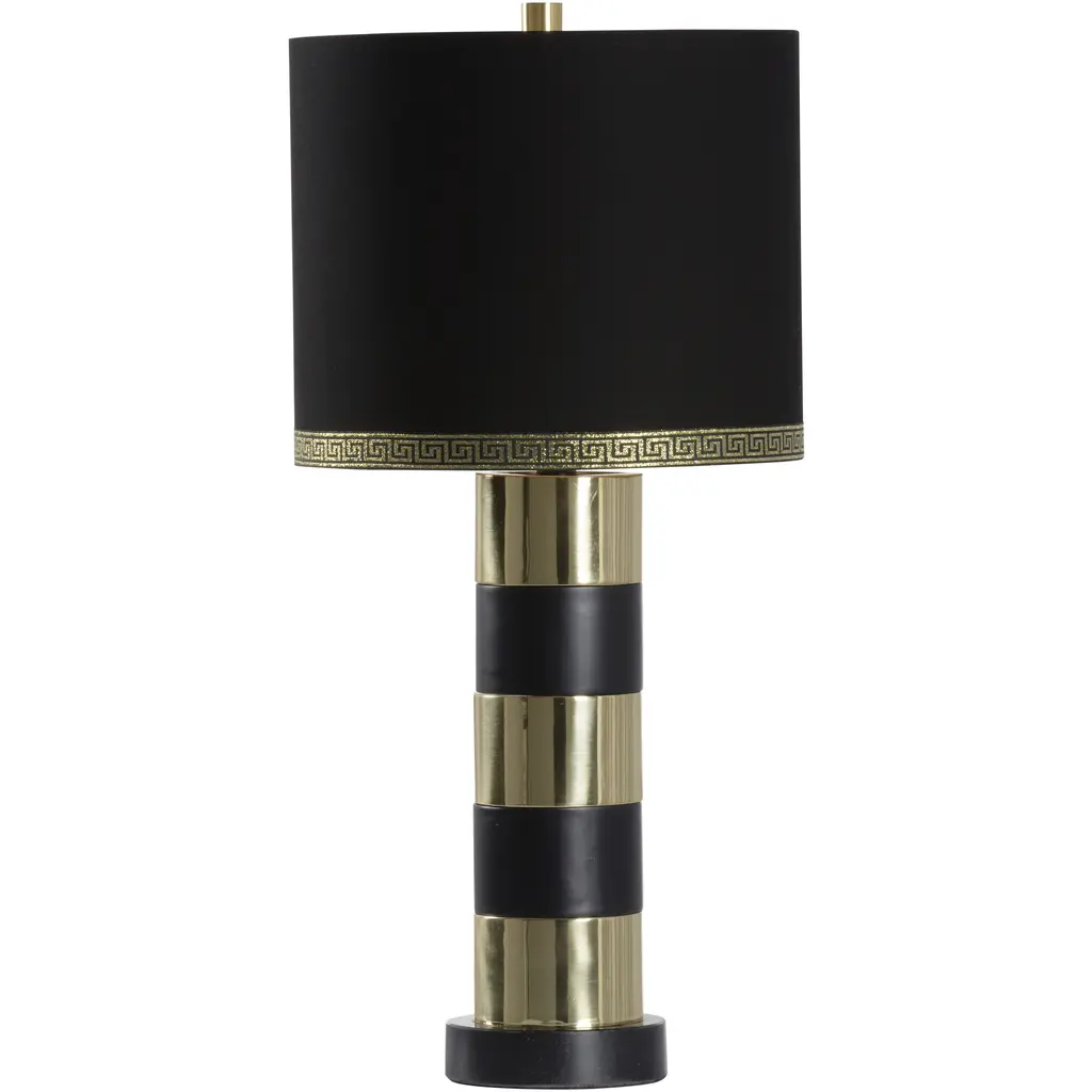 POLISHED BRASS AND BLACK METAL STACK UP THIS CYLINDRICAL COLUMN CREATING A MODERN TABLE LAMP. A BLACK DRUM SHADE WITH GOLD GREEK KEY TRIM ADDS COHESIVENESS AND VISUAL INTEREST TO THE DESIGN.