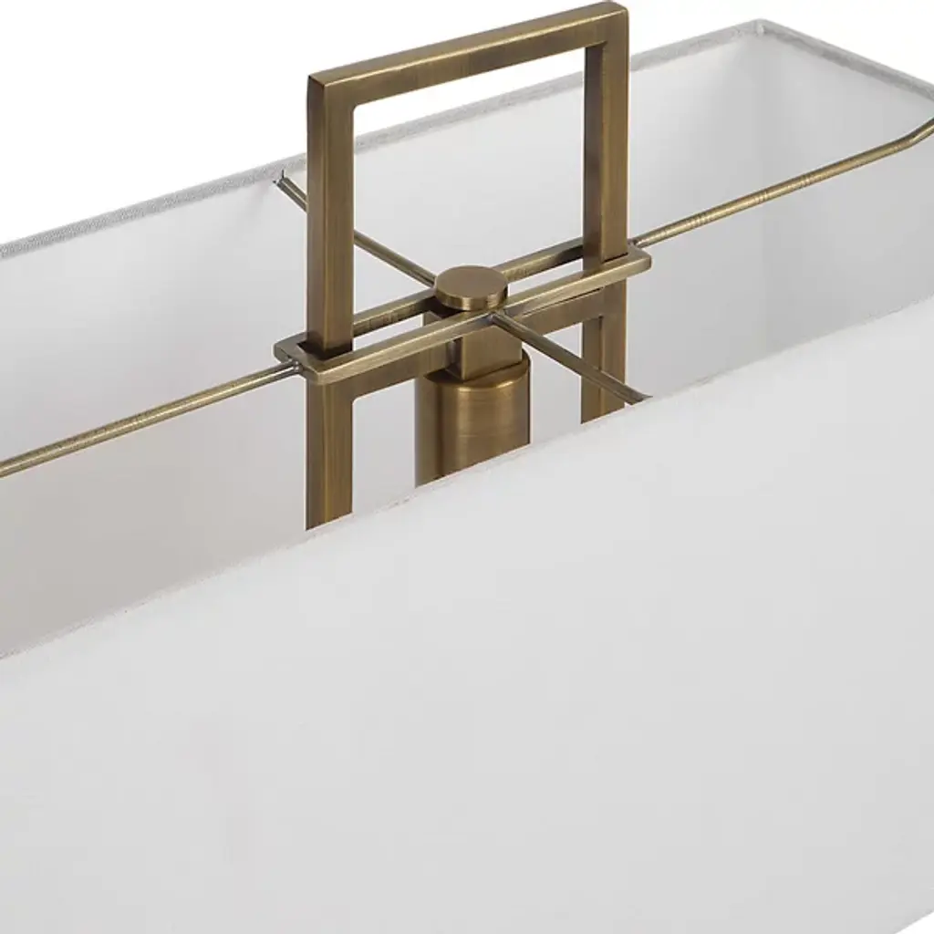 The Column Table Lamp from Uttermost creates a modern aesthetic with angular steel bars with a plated brass finish, complemented by a matching finial. Designed by Jim Parsons, the construction is accented with a white marble rectangular pillar for added elegance. A rectangular hardback shade in white linen fabric surrounds the lamp, adding classic appeal elements to the more intricate design. The steel and marble construction creates durability and refinement, creating a refined look suitable for flat interior surfaces.