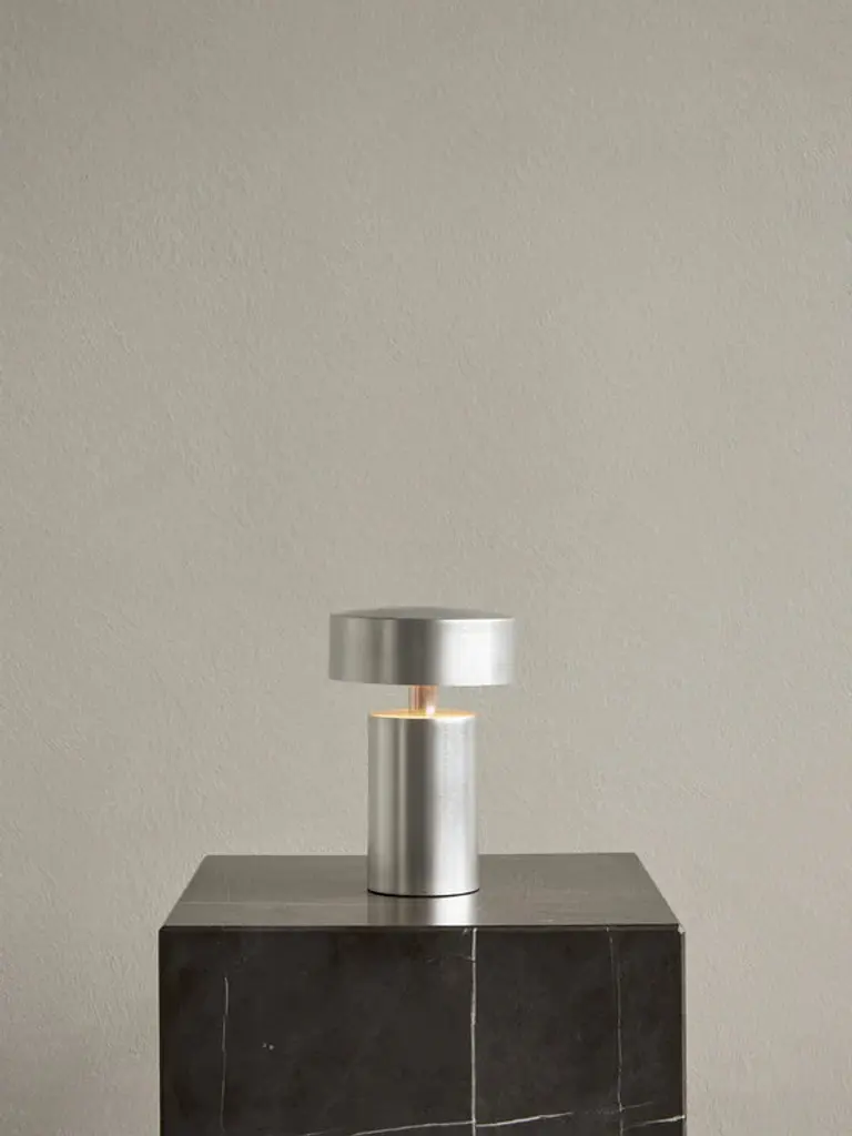 With a shape inspired by the bollards used to secure vessels to a jetty, the portable Column Table Lamp combines technology and mood-setting style in a striking mushroom shape. Powered by battery for the ultimate in freedom and flexibility, the small-scale lamp delivers an inviting glow – adjustable to three settings – to spaces indoors and out. The cordless design charges via a concealed USB socket at its base and is also compatible with Audo’s Charging Board, which reanimates multiple devices in a single sitting. Lightweight and durable, with a beautiful finish in either anodized or brushed aluminum, it is a design you will want to use in all your favorite spots. To preserve battery life, switch the lamp off when charging and do not leave plugged in while in use.