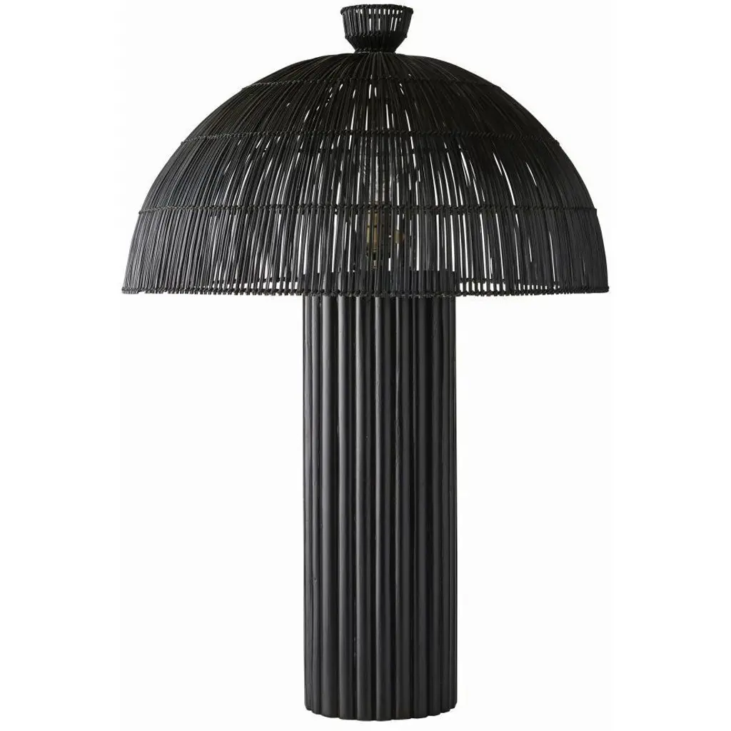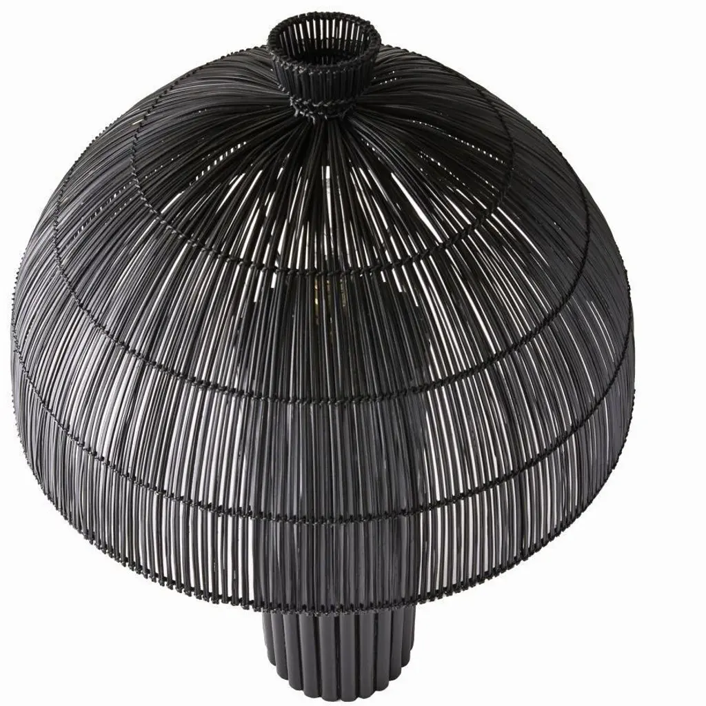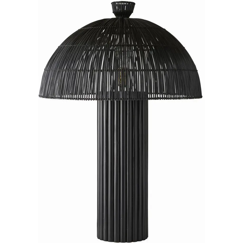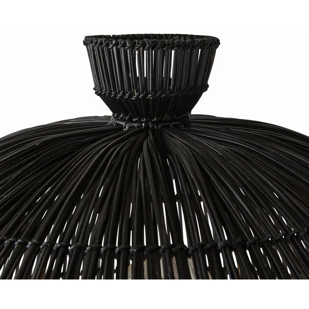 Our black wicker rattan Como offers a monochromatic mix of natural and tactile materials. Designed so the dome shade seems to seamlessly blend into its column basethe slight transparency of the woven reeds allows alluring light to peek through. Antique brass hardware. Finish will vary.