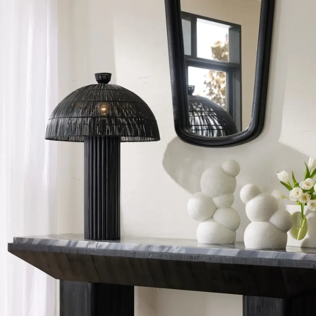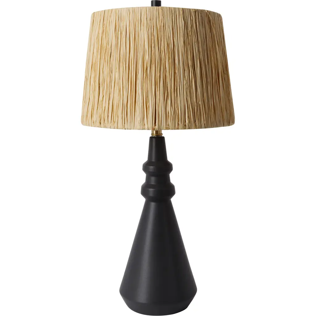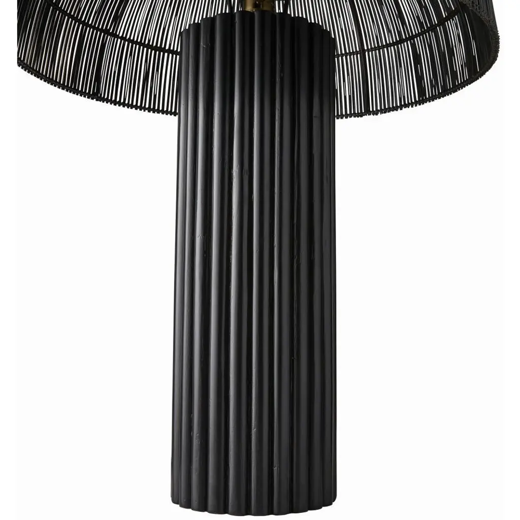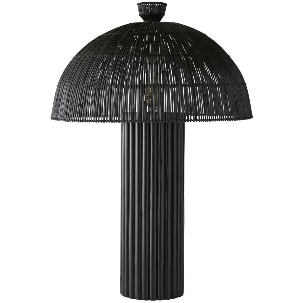Our black wicker rattan Como offers a monochromatic mix of natural and tactile materials. Designed so the dome shade seems to seamlessly blend into its column basethe slight transparency of the woven reeds allows alluring light to peek through. Antique brass hardware. Finish will vary.