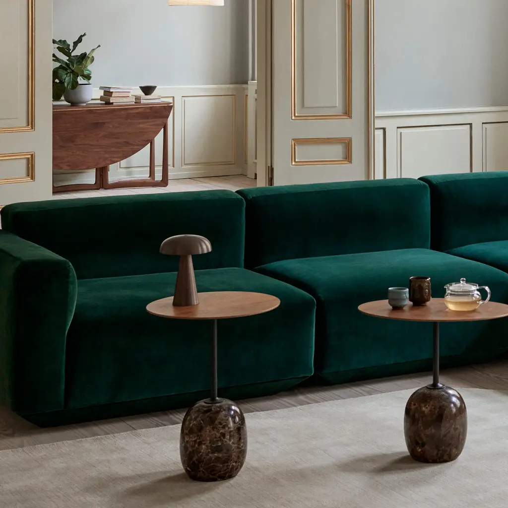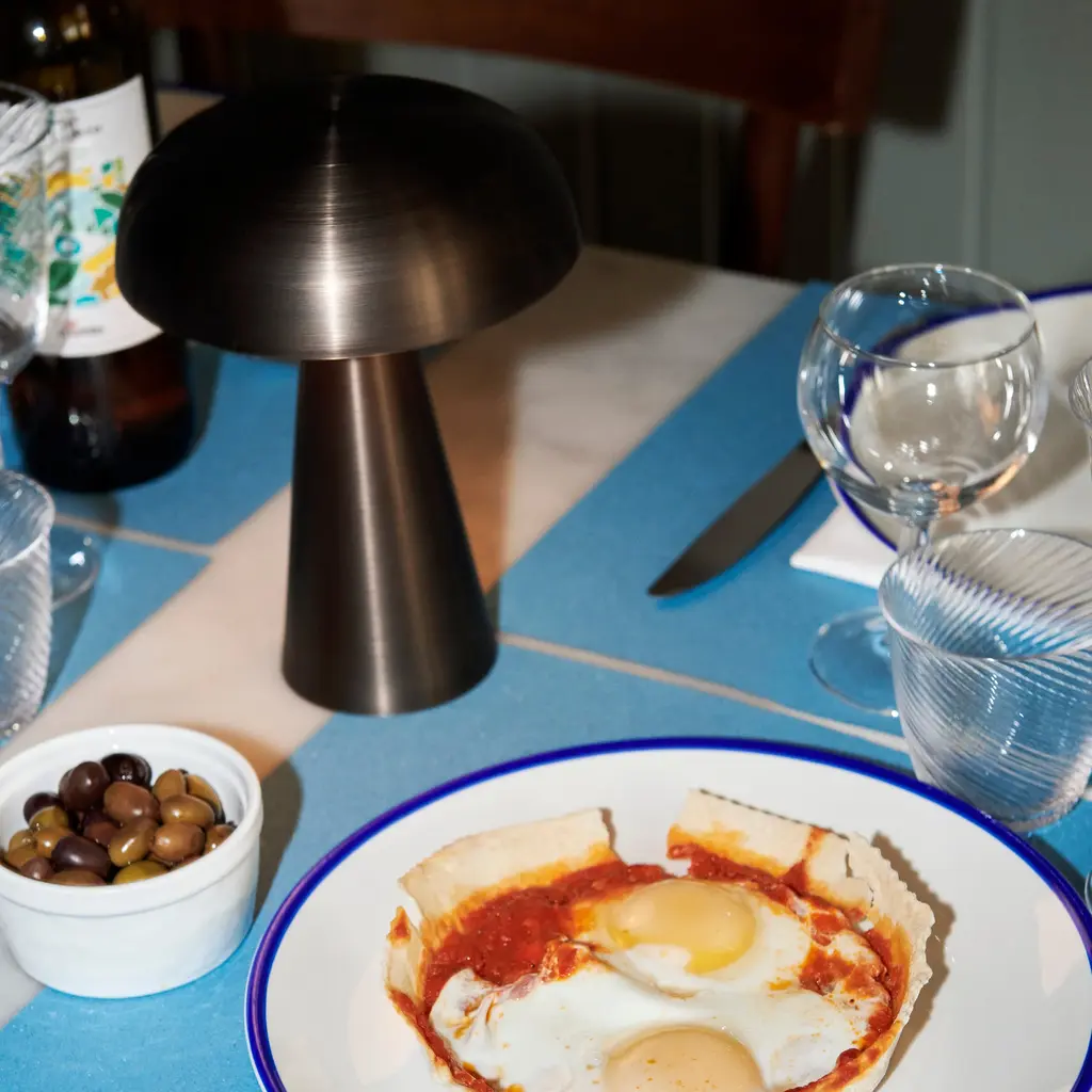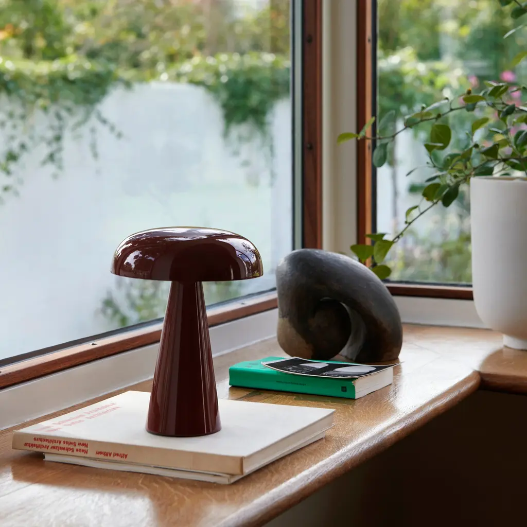 It might take a second look to realize that the elegant bronze-brass Como is actually a portable table lamp. Crafted from anodized aluminum, Space Copenhagen essays a sturdy tapering base topped with a softy curved, mushroom-shaped shade. With a 3-stage dimmable LED, the battery-powered lamp is good for 11 hours at the highest setting, with an extra battery option for additional operating time. SC53 is readily recharged with a magnetic USB cable or a charging tray.