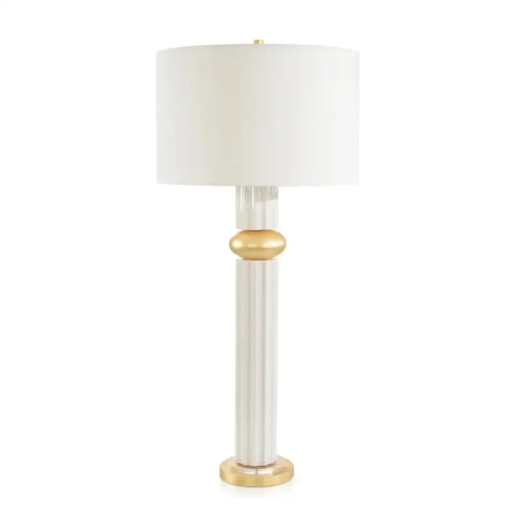 The Compressa Buffet Lamp showcases a modern, fluted cylindrical form crafted of fine Italian crackled ceramic. The column-like body of the piece is interrupted by a gorgeous ovate shape of sparkling gold ceramic and matched by a circular base with acrylic trim, contributing stunning visual interplay in form and texture. Deceptively simple, the Compressa features an ovate finial, matching the golden accents throughout the piece to complete the look. This artistic statement piece creates a sculptural focal point into a wide range of interior décors.