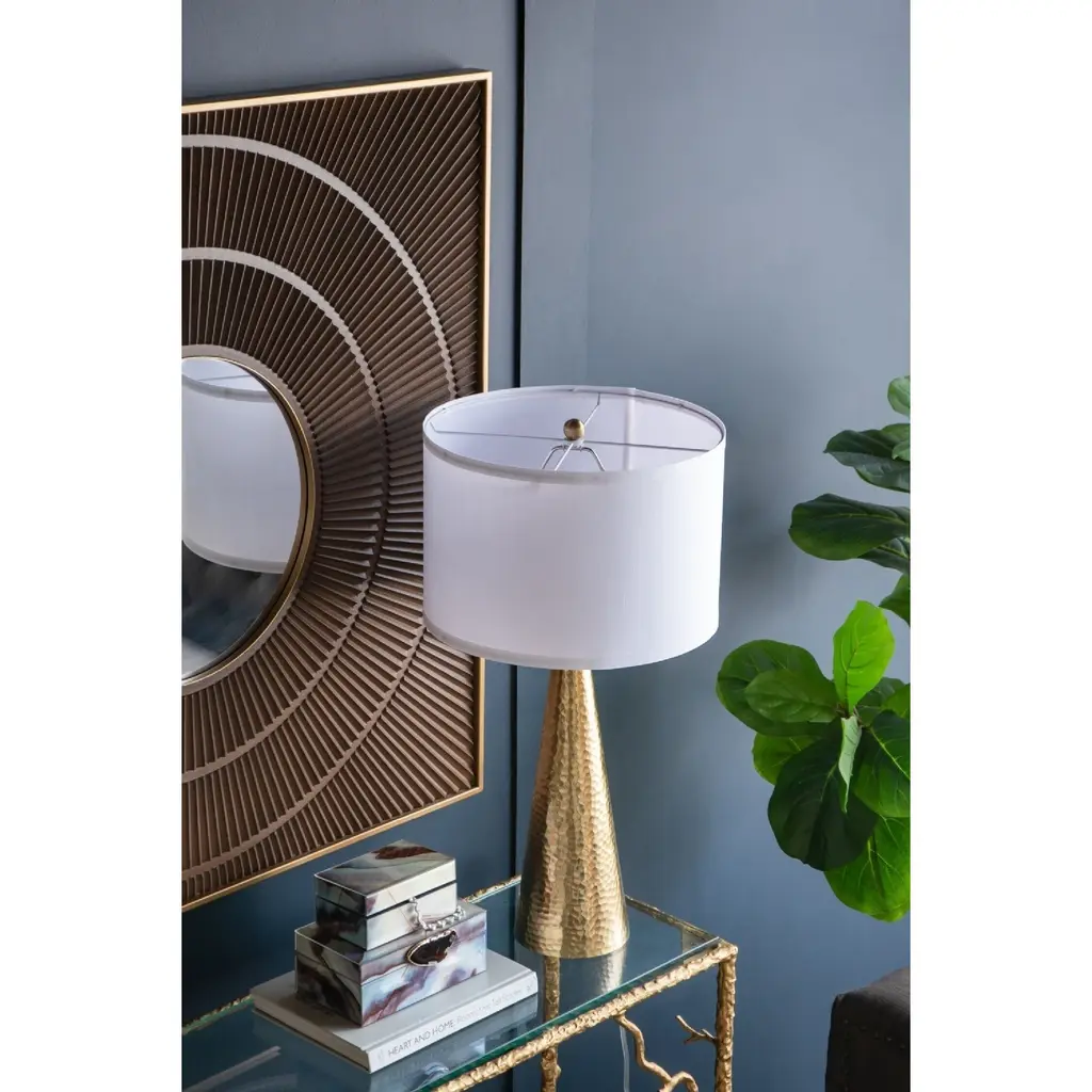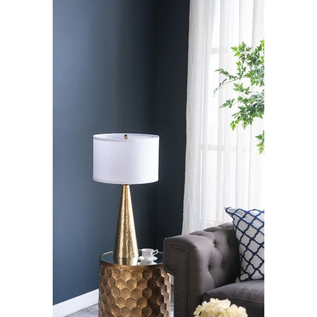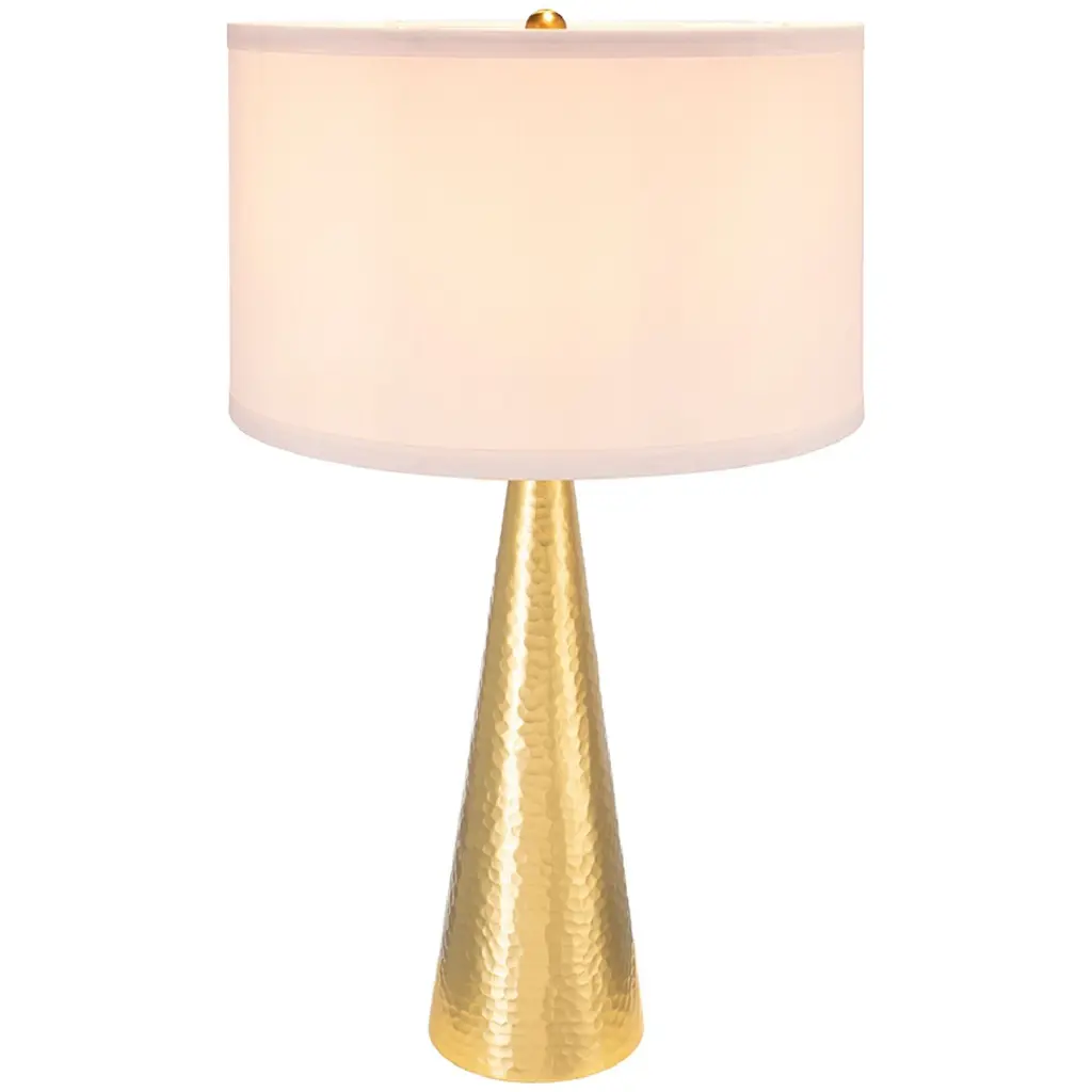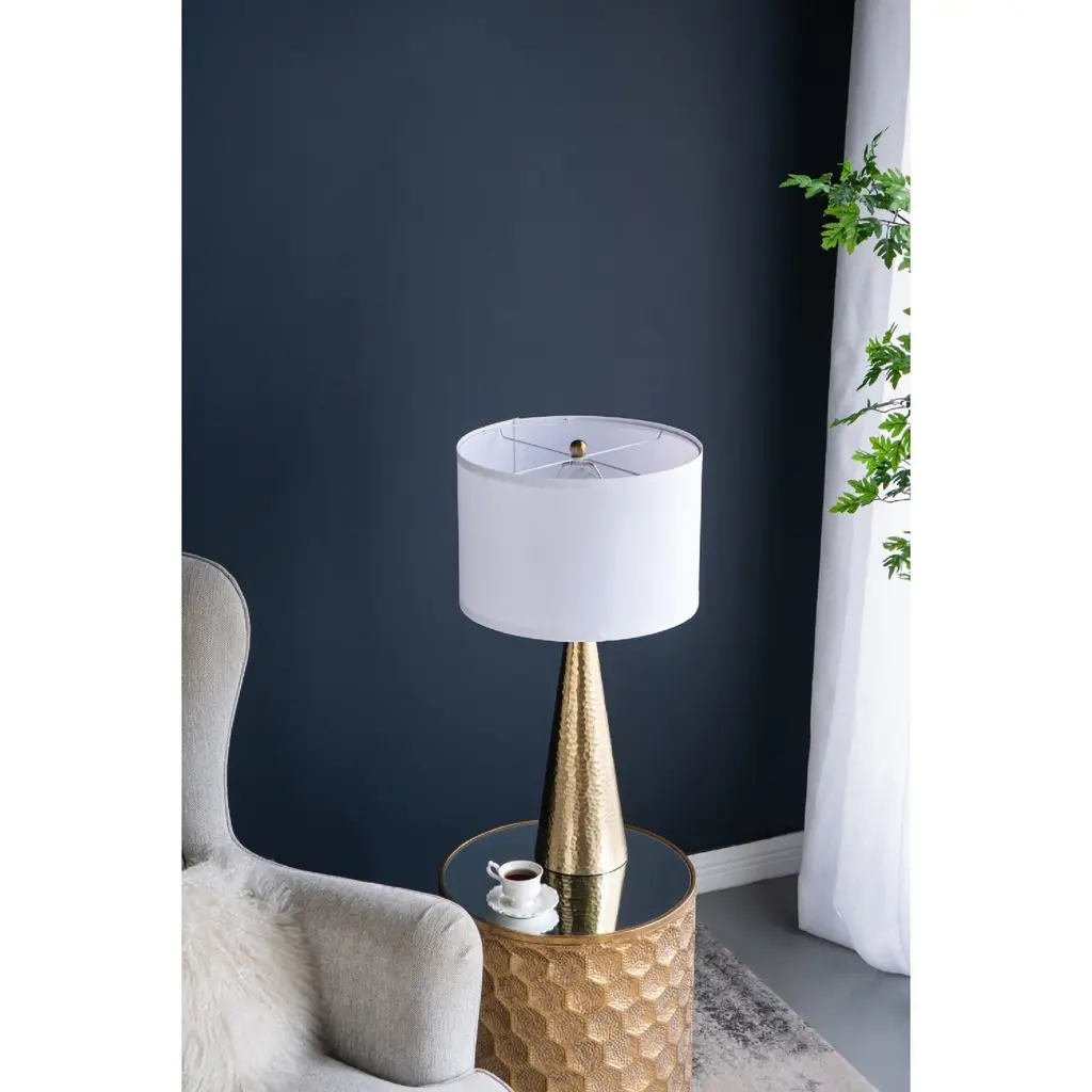 Infusing an architectural minimalist silhouette with a timeless style, this table lamp showcases a gold aluminum cone-shaped body beneath a classic white fabric shade. Measuring 28.5H x 15D x 15W, it is an ideal size for your bedside table, a desk in your study, or an end table anywhere in your house. Minimal assembly is required for the collapsible drum shade.
