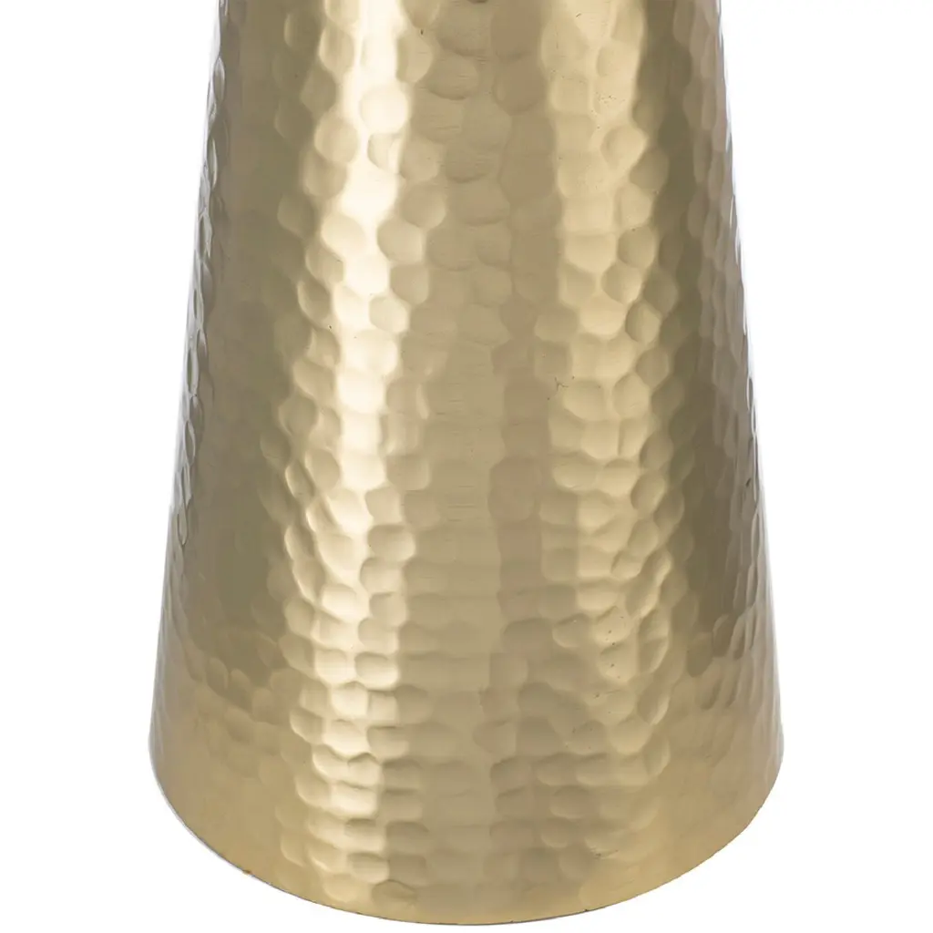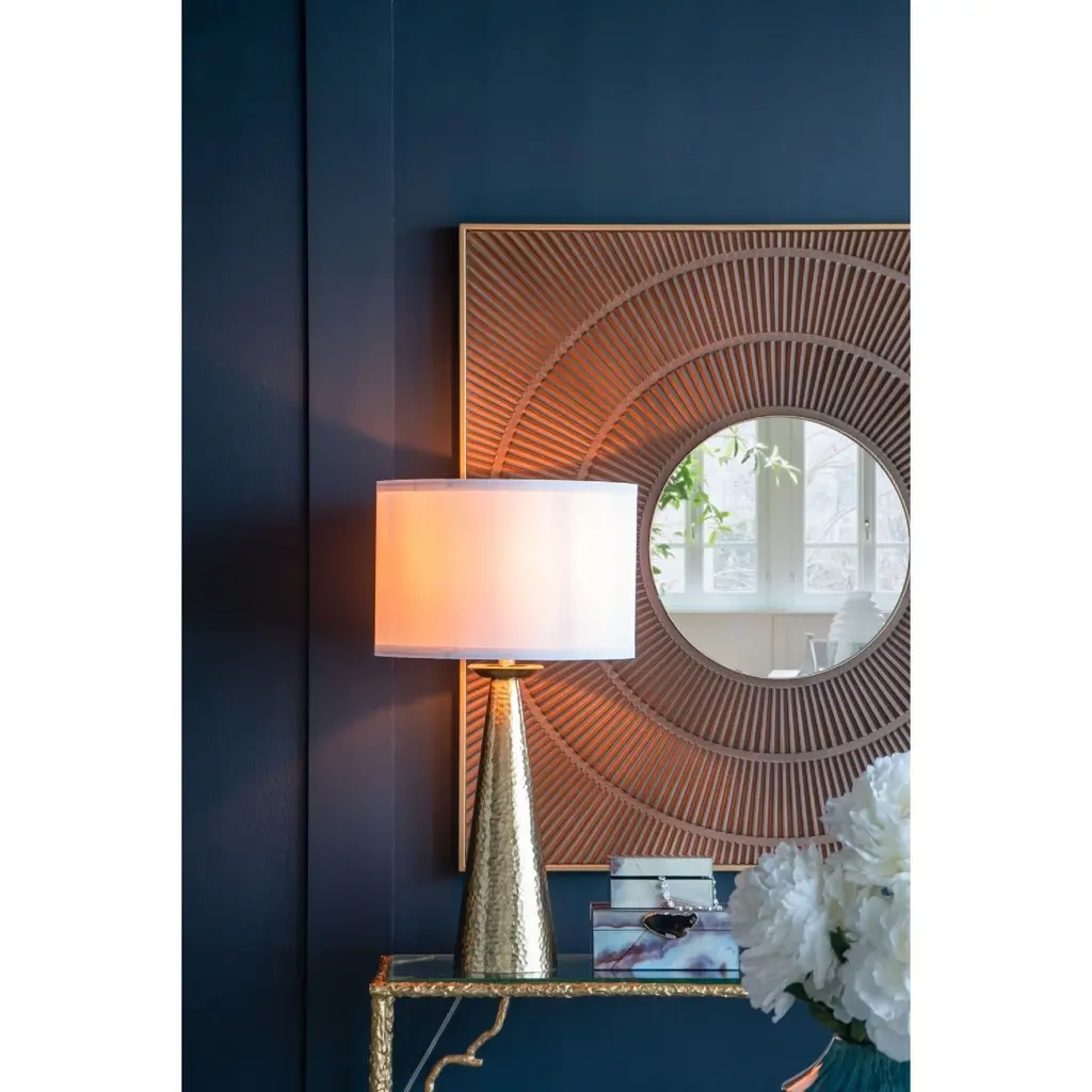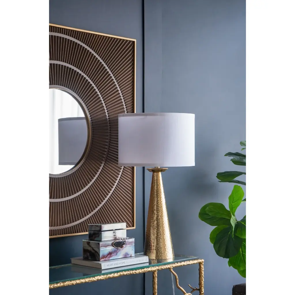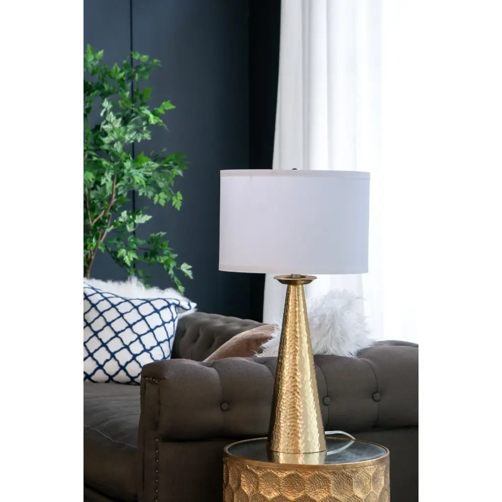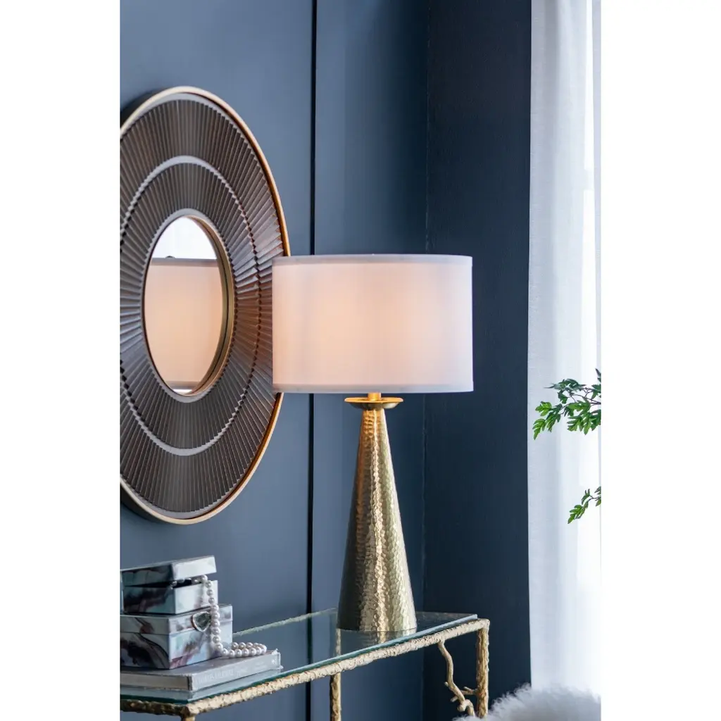 Infusing an architectural minimalist silhouette with a timeless style, this table lamp showcases a gold aluminum cone-shaped body beneath a classic white fabric shade. Measuring 28.5H x 15D x 15W, it is an ideal size for your bedside table, a desk in your study, or an end table anywhere in your house. Minimal assembly is required for the collapsible drum shade.