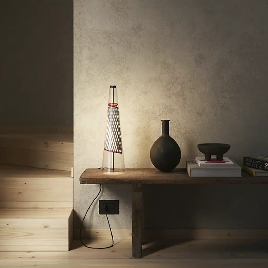 The Cono di Luce LED Table Lamp from Lodes brings accessible, efficient artistry to contemporary interiors. This Italian-made lamp is a collaboration between Lodes and renowned artist and designer Ron Arad, blending high-tech expertise with soulful creativity. Energy Star compliant, it features a conical Pyrex glass shade with a curled, flexible printed circuit board with LED lamping. The minimalist frame supports the layered design as it rests on flat surfaces, creating stylish shadows, while the swirling circuit board proudly displays the fixture’s name on its lower edge.