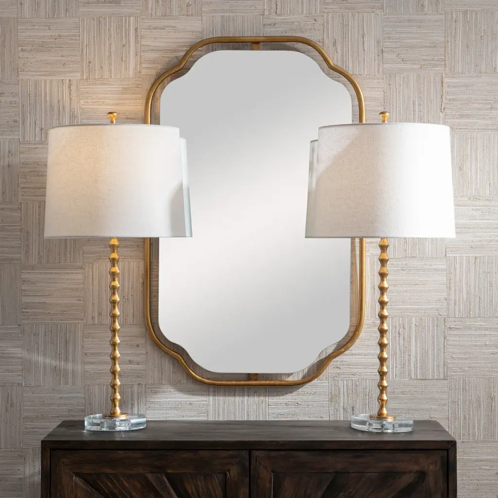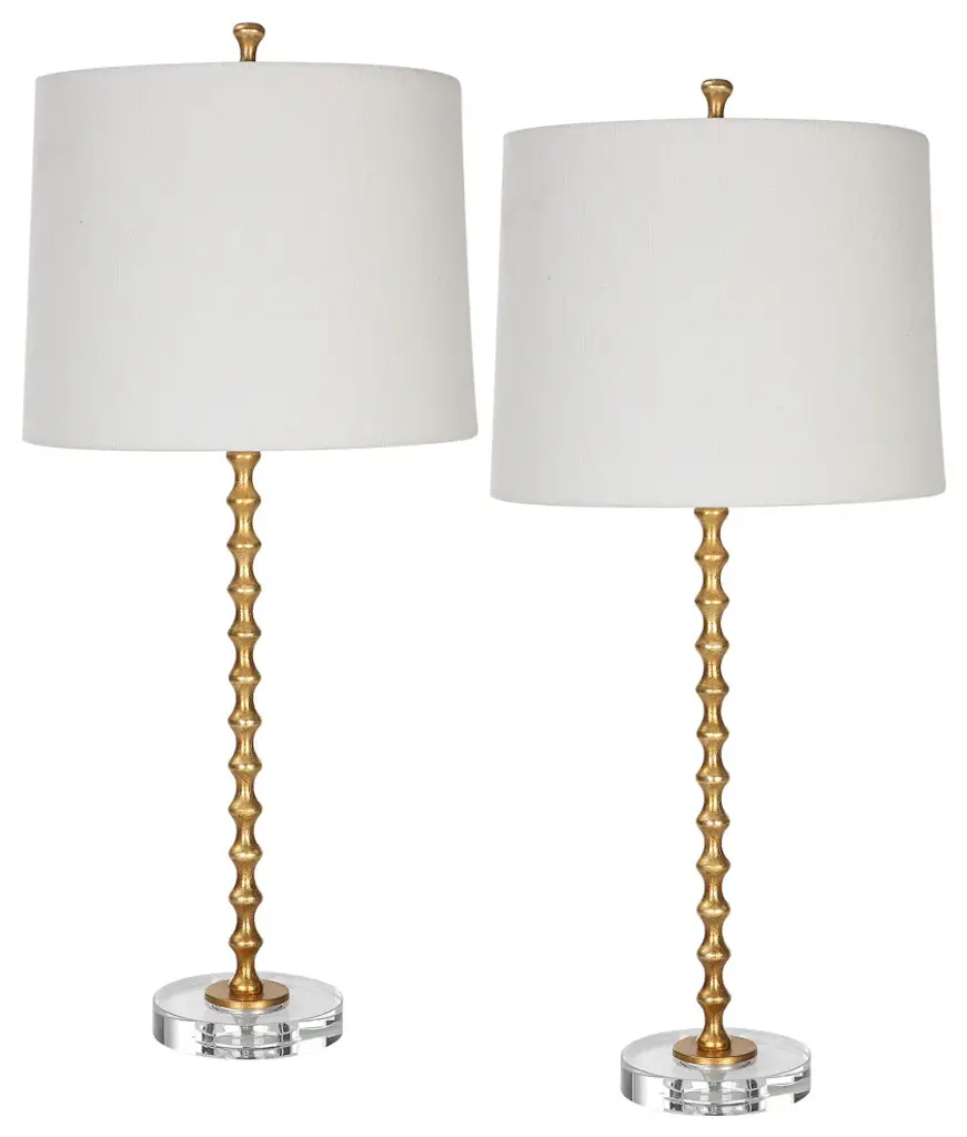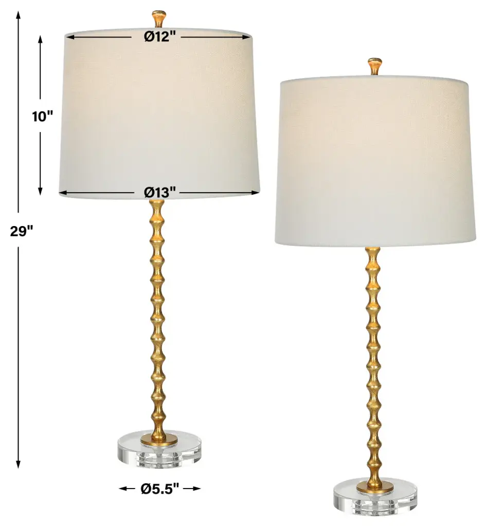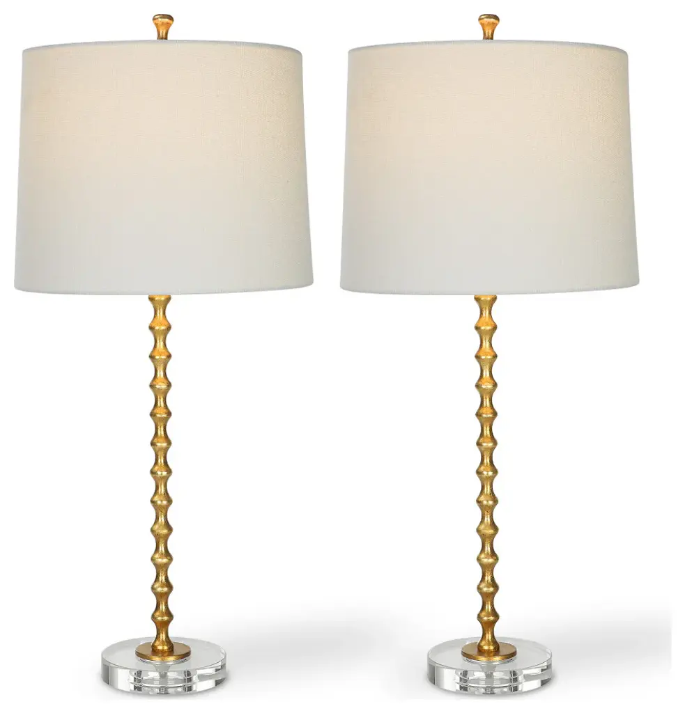 A vibrant gold leaf finish accentuates the stacked miniature hourglasses which form this simple, yet elegant table lamp. The metal body sits atop a beautiful round crystal base. The slightly tapered shade, with its rolled edge, is an ivory linen fabric. This lamp is sold as a set of two.