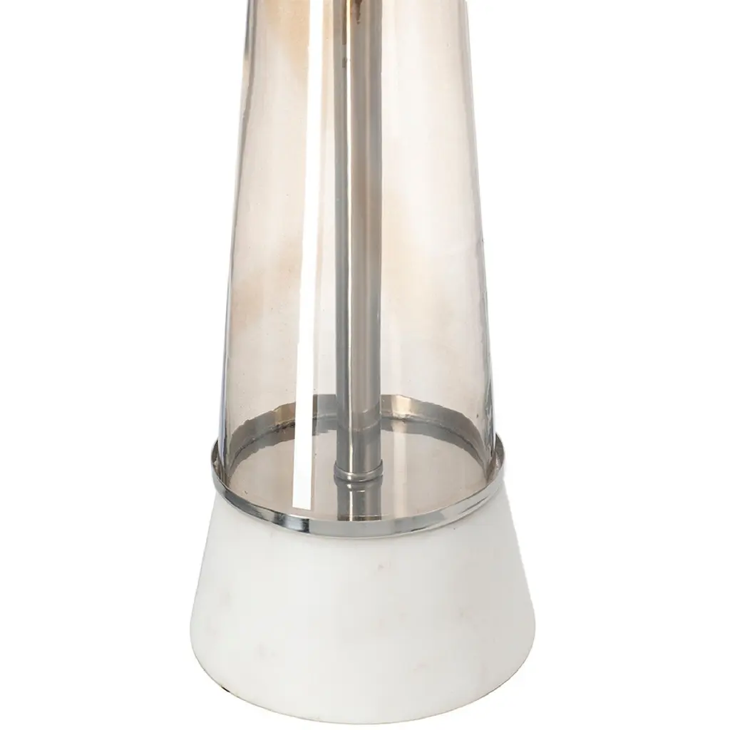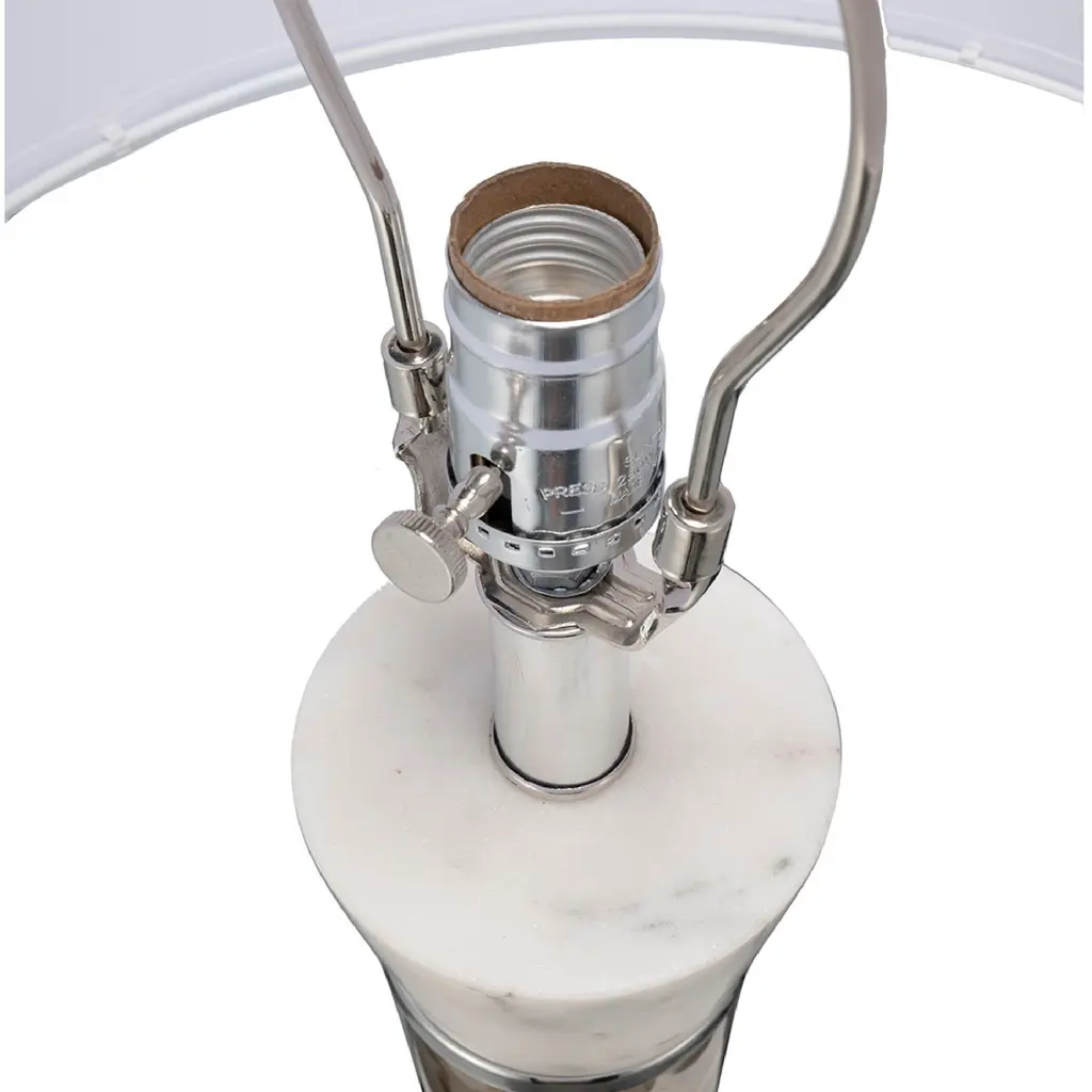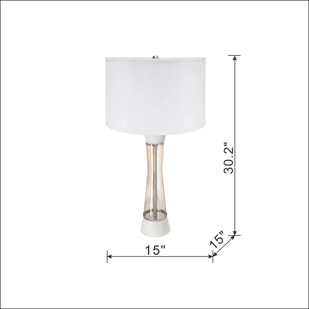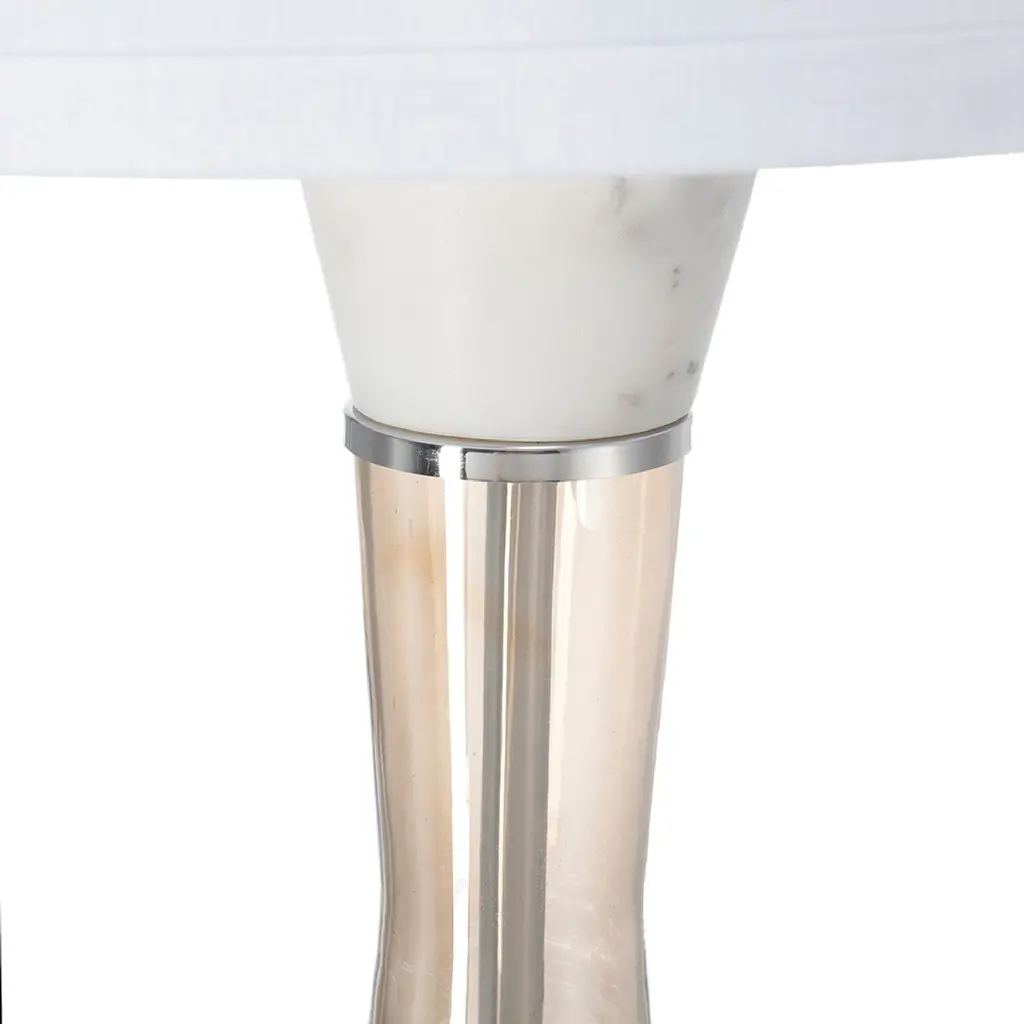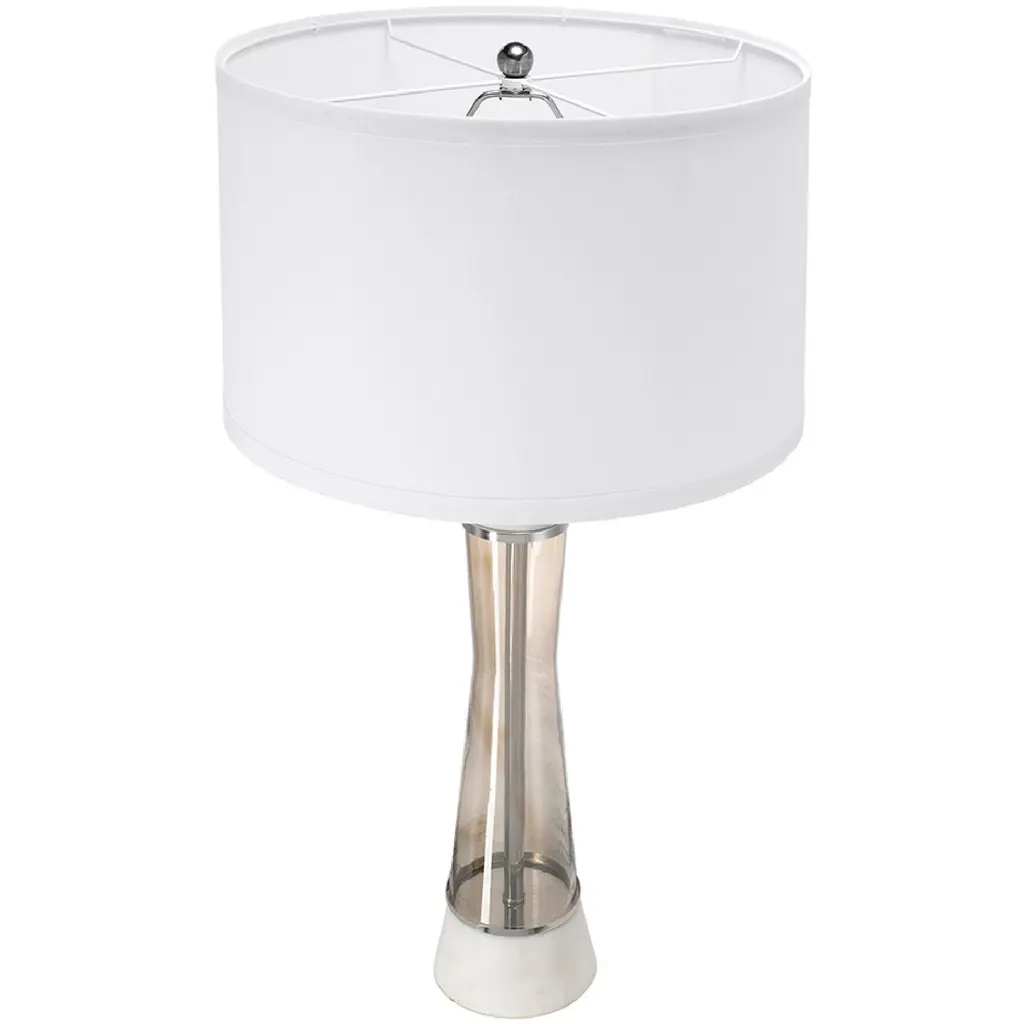 Crafted from an alluring combination of durable, natural white marble and glass, this contemporary table lamp features a round pedestal base, a white drum shade, and a thin body that is coated by a transparent layer of glass. An ideal size for your bedside table, a desk in your study, or a living room end table, it will catch the eye of your guests from any location.