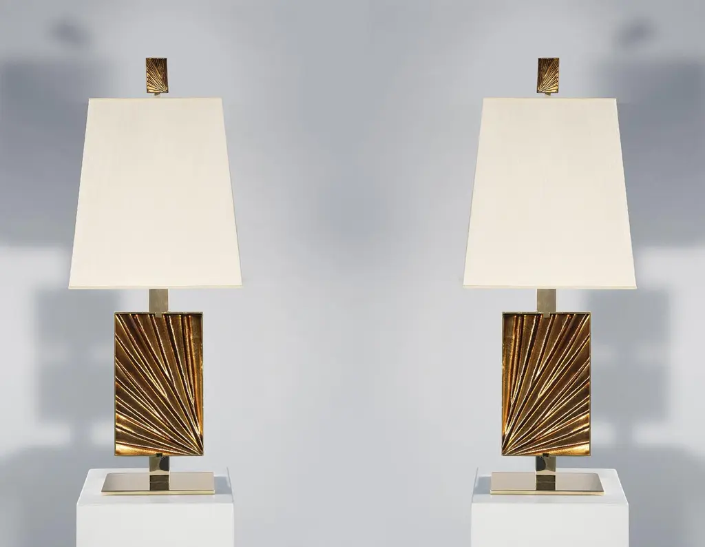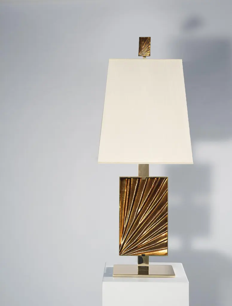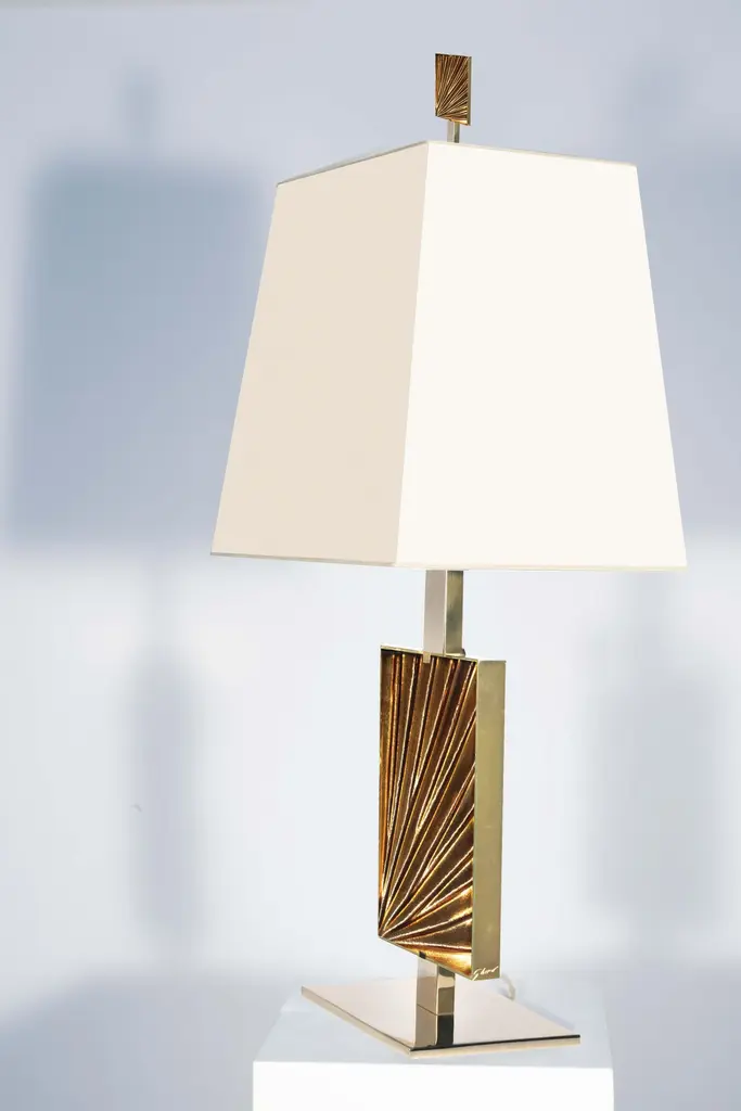 2021 'Ambra' Collection of table lamps by Ghirò Studio (Milan).The 'Ambra' lamp is not just a table lamp. It’s an object of pure art and design. Sober, fine and elegant even when off, it is ideal to give a touch of color and elegance to the bedroom or any other environment.The structure is entirely made with 24 Carate gold-plated brass and ends with a cream silk lampshade and a small amber crystal.By hand engraving crystal the artist has creates deep lines. The finish is an amber color with intense golden reflections. This lamp is new and in excellent condition.Every imperfection is to be considered a value and not a defect, a guarantee of the extreme naturalness and craftsmanship of our product.These items are handmade and will not be all exactly the same.