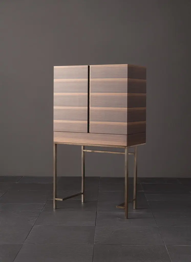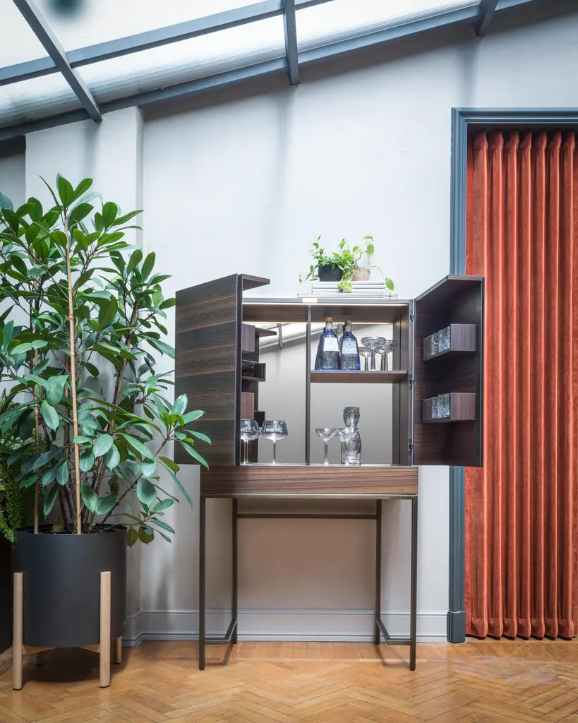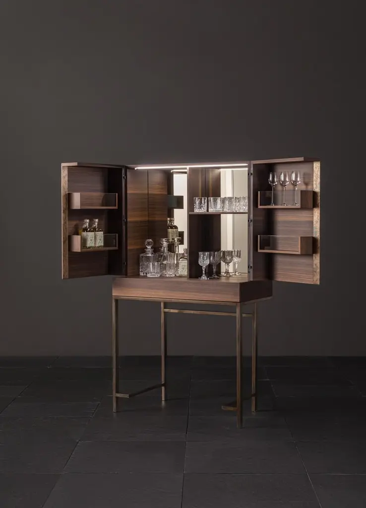 Surprisingly functional, its simple lines and high-quality details make it a unique, elegant and timeless piece. Ready to take centre stage in any setting.Drinks cabinet in 113 Smoked Eucalyptus wood grain, with metal details in 086 Mottled Weathering Steel (artisanal finishing work, for a unique, one-of-a-kind product). Led lamp as standard with motion sensor (no switch). Pull-out tray detail with small compartments at the sides.