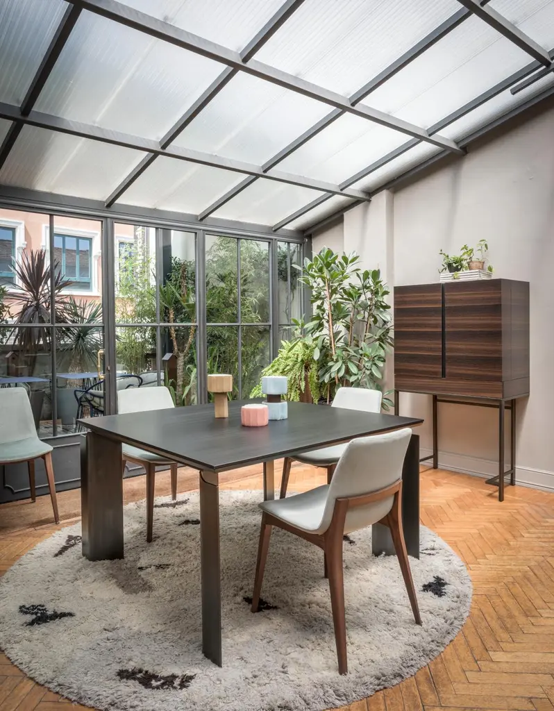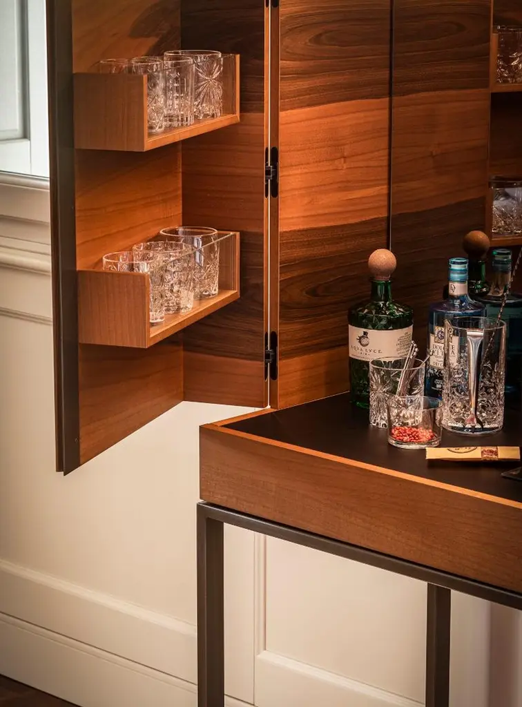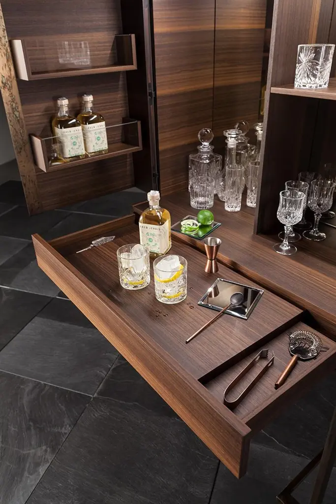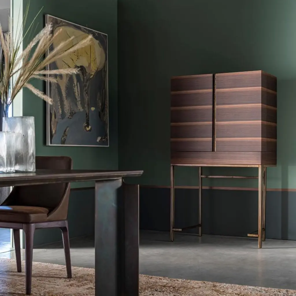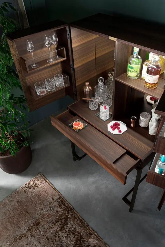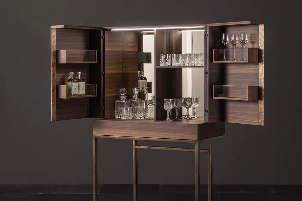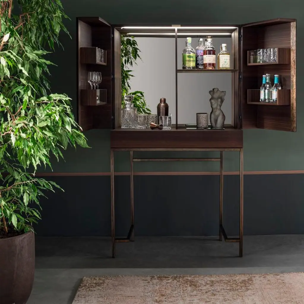 Surprisingly functional, its simple lines and high-quality details make it a unique, elegant and timeless piece. Ready to take centre stage in any setting.Drinks cabinet in 113 Smoked Eucalyptus wood grain, with metal details in 086 Mottled Weathering Steel (artisanal finishing work, for a unique, one-of-a-kind product). Led lamp as standard with motion sensor (no switch). Pull-out tray detail with small compartments at the sides.