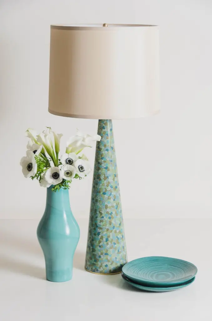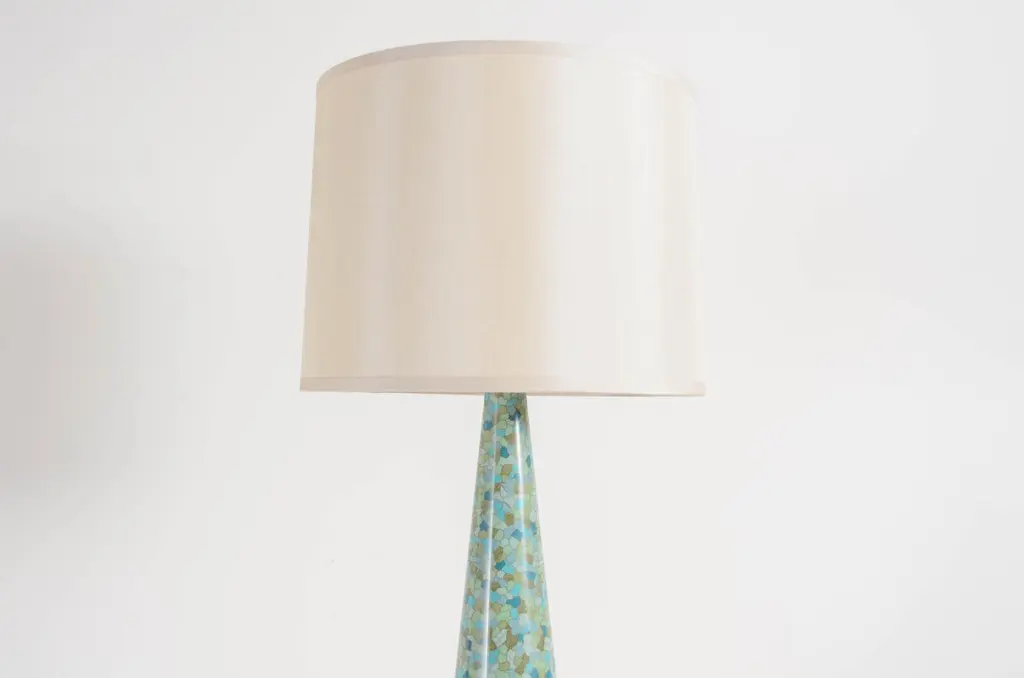 Conical table lampAzure designTurquoise and blueCloisonnéHand madeSilk shadeLimited editionThe cloisonné technique is an enameling on metal technique that dates back to the Byzantine Empire. The technique reached China around the 12th-13th century. In the 1980s, Robert Kuo began his repertoire with cloisonné and introduced flowing designs without compromising on the technical quality. He also created new matte cloisonné colors that are patented. He took a break from cloisonné to explore the repoussé technique and now returns to designing cloisonné but in non-monochrome colors, patterns and larger pieces.