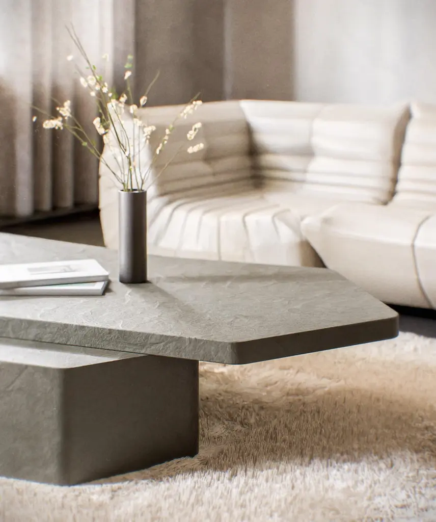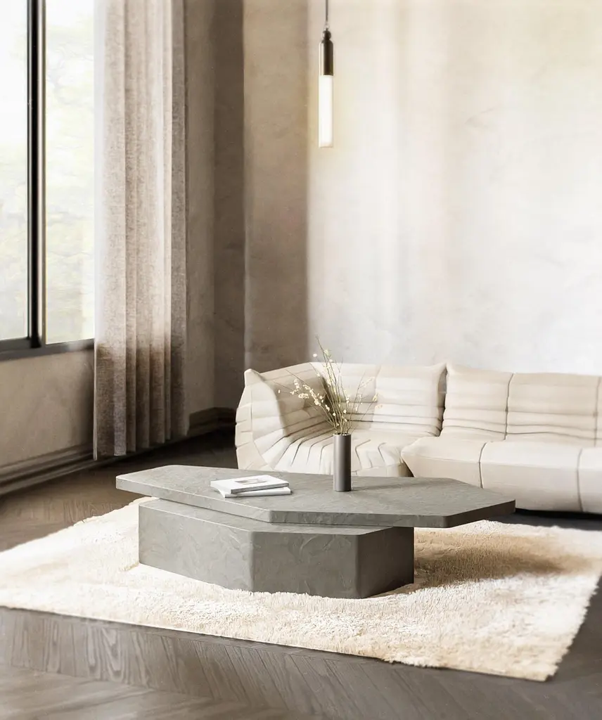 The Diane collection introduces a more brutalistic and robust collection with straight edges. Drawing inspiration from fracture lines and with a nod to their favorite Belgian architect Juliaan Lampens. Starting from a base of plywood, layers of Mortex© are added to create the table. Mortex© is a decorative technique based on lime, acrylic and pigment. This technique is added manually which gives an imperfectly perfect result and gives each table a unique appearance with color nuances, imperfections and small irregularities. These form the character of the product and the technique. The appearance of the furniture is partly determined by the degree of polishing and the final finishing layer. Each piece of furniture or object is completely unique and handmade in our own workshop. Matt finish by means of a water-based PU lacquer. The colors are manually composed of natural pigments.Only for indoor use. Material: Ply wood, Mortex© (decorative technique based on lime and pigment) Armand & Francine (A&F) is a creative duo comprised of Gert Hellebaut and Cathy Poppe, based in Ghent, Belgium. Driven by a desire for creative freedom, they embarked on a journey as self-taught designers which led them to establish their studio where they handcraft solid, unique furniture and objects for interiors. A&F combine traditional craftsmanship with organic and flowing lines, reflecting their love for textures, materials, asymmetry, and imperfect beauty. Cathy's creative instincts and Gert's technical skills complement each other, resulting in their distinctive and refined designs. A&F believes that furniture should not only be visually appealing but also serve as functional and emotional objects that can be cherished for generations. The design process of A&F involves experimentation and refinement, always researching new techniques, structures and materials. Armand & Francine believe in a local approach and prioritize quality and craftmanship, personally handling every aspect of the production process in favor of maintaining control over the final product.