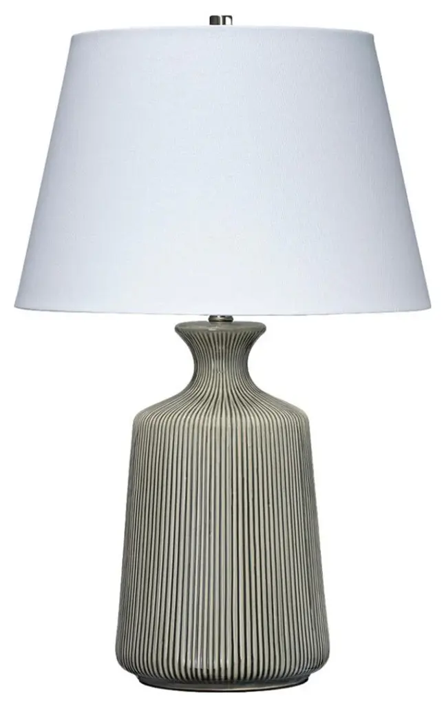 This menswear inspired look is ideal for today�s casual, comfortable decors. The handcrafted ceramic base features a dimensional pin stripe, with alternating stripes in light and dark gray. Jamie tops it with the home d�cor equivalent of the perfect white shirt, a tapered white linen shade with a rolled edge. The look is accessorized with a silver spider and finial.18"L x 18"W x 30"H. Weighs 8 lbs.Hand Finished Ceramic. Linen Fabric ShadeUL listed. Uses one max 150W Type A bulb (not included). 3 way socket switch.Heirloom Quality - Expertly hand crafted and hand finished. Due to the hand crafted nature of this piece, each piece may have subtle differences.