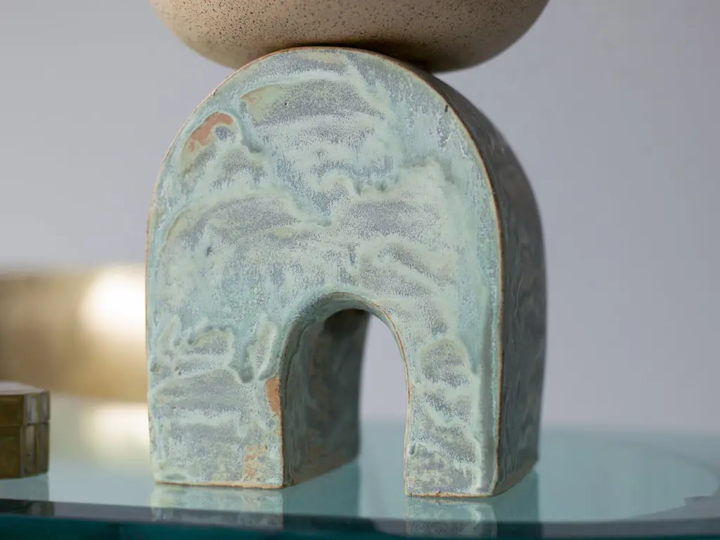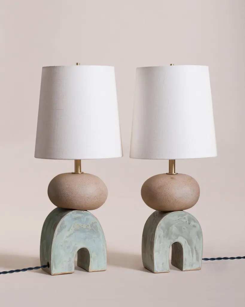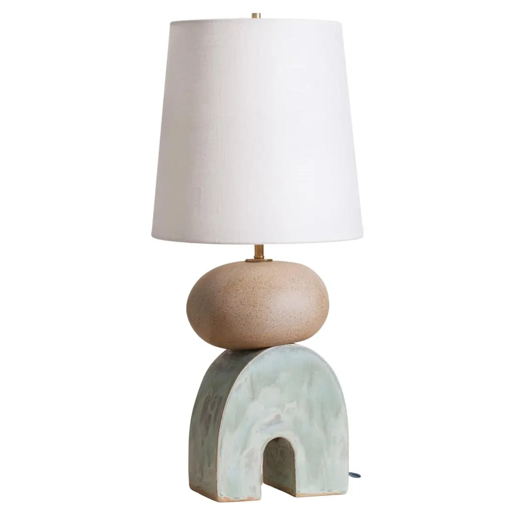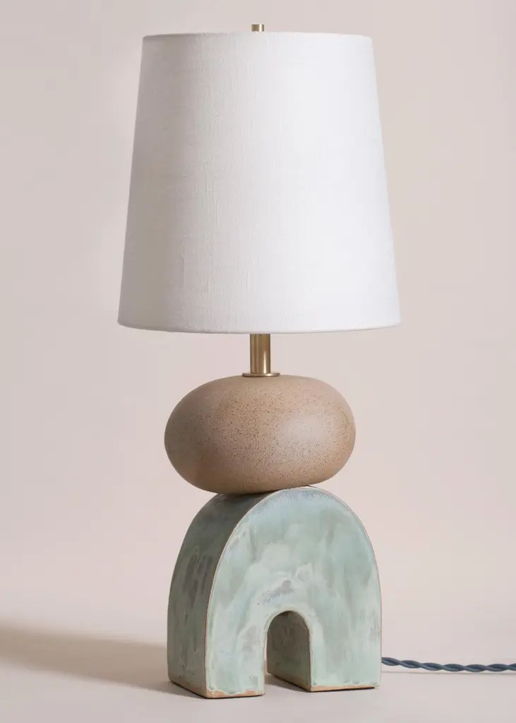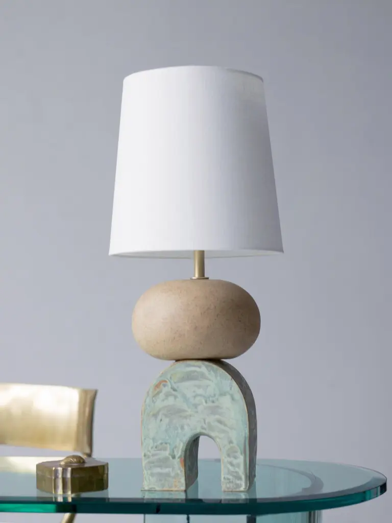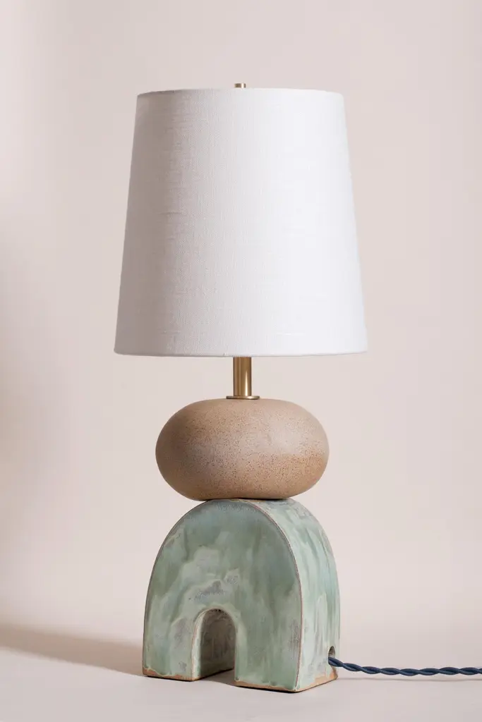 One of a kind ceramic lamp, thrown on the potters wheel and assembled by hand. The lamp base is comprised of two different clay bodies and features a raw, unglazed ceramic surface to highlight the texture of natural clay contrasted with a coppery green glazed bottom. This piece was inspired by seashells and smooth stones collected from the beach on trips to New England.About 22 inches tall with linen shade, unfinished and brushed brass hardware, with a blue braided cord. Ships in 6-10 weeksDetails:Lamp plugs into 120v outletMaximum 60-wattsRecommended to use with GE Soft LED series bulbsE-26 Medium base socket, 3 way turn keyDimmer available upon requestUL Listing available upon request at extra costStamped by Michelle McLaughlin of Calyer CeramicsDimensions:Base Height: 11.0"Base Diameter: 6x4.5”Shade Diameter Bottom: 10.0"Shade Diameter Top: 8.0"Shade Side Height: 10.0"Cord Length: 10'Overall Height: 22.0"