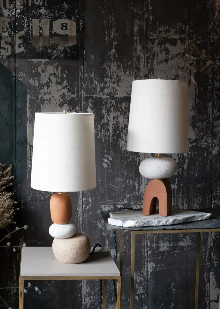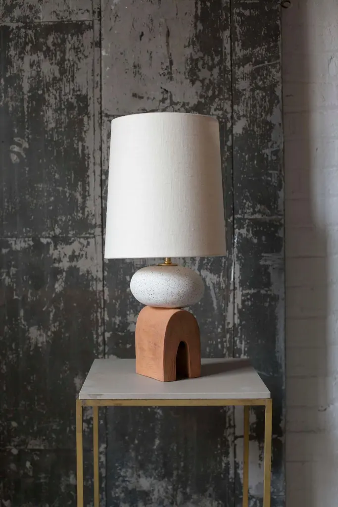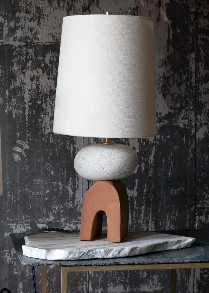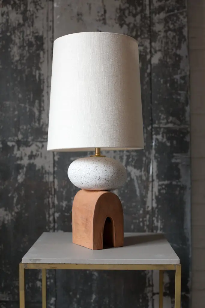 One of a kind ceramic lamp, thrown on the potters wheel and assembled by hand. The lamp base is comprised of two different clay bodies that celebrate the texture of unglazed ceramic. This piece was inspired by seashells and smooth stones collected from the beach on trips to New England.About 17 inches tall with linen shade, unfinished and brushed brass hardware, with a blue braided cord. Lamp measures 8 x 6 x 6” (without shade harp)Shade measures 8 x 9”UK plug available on request.