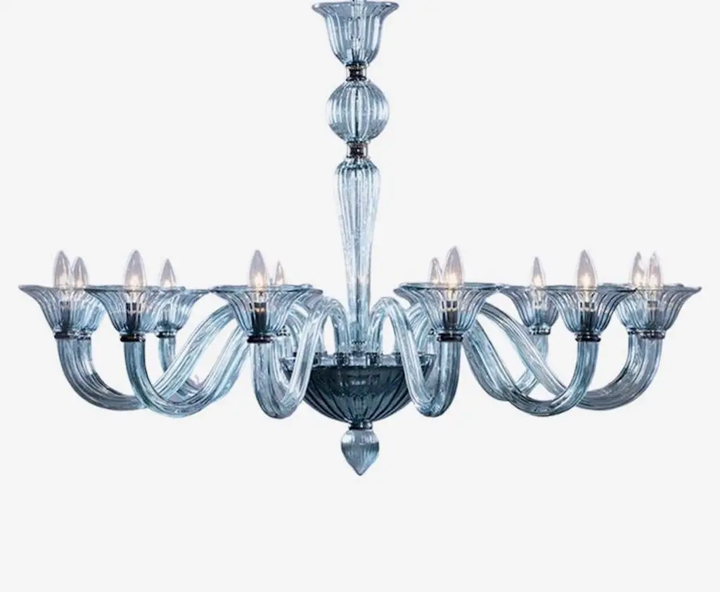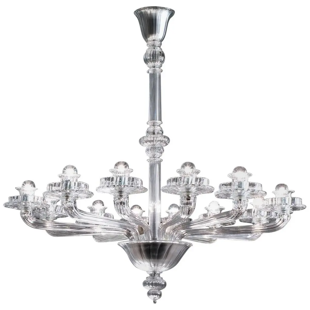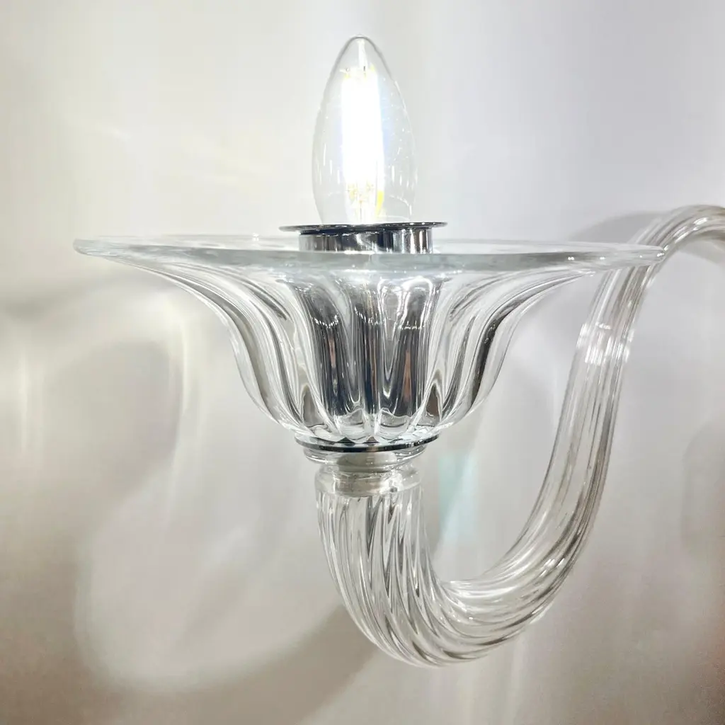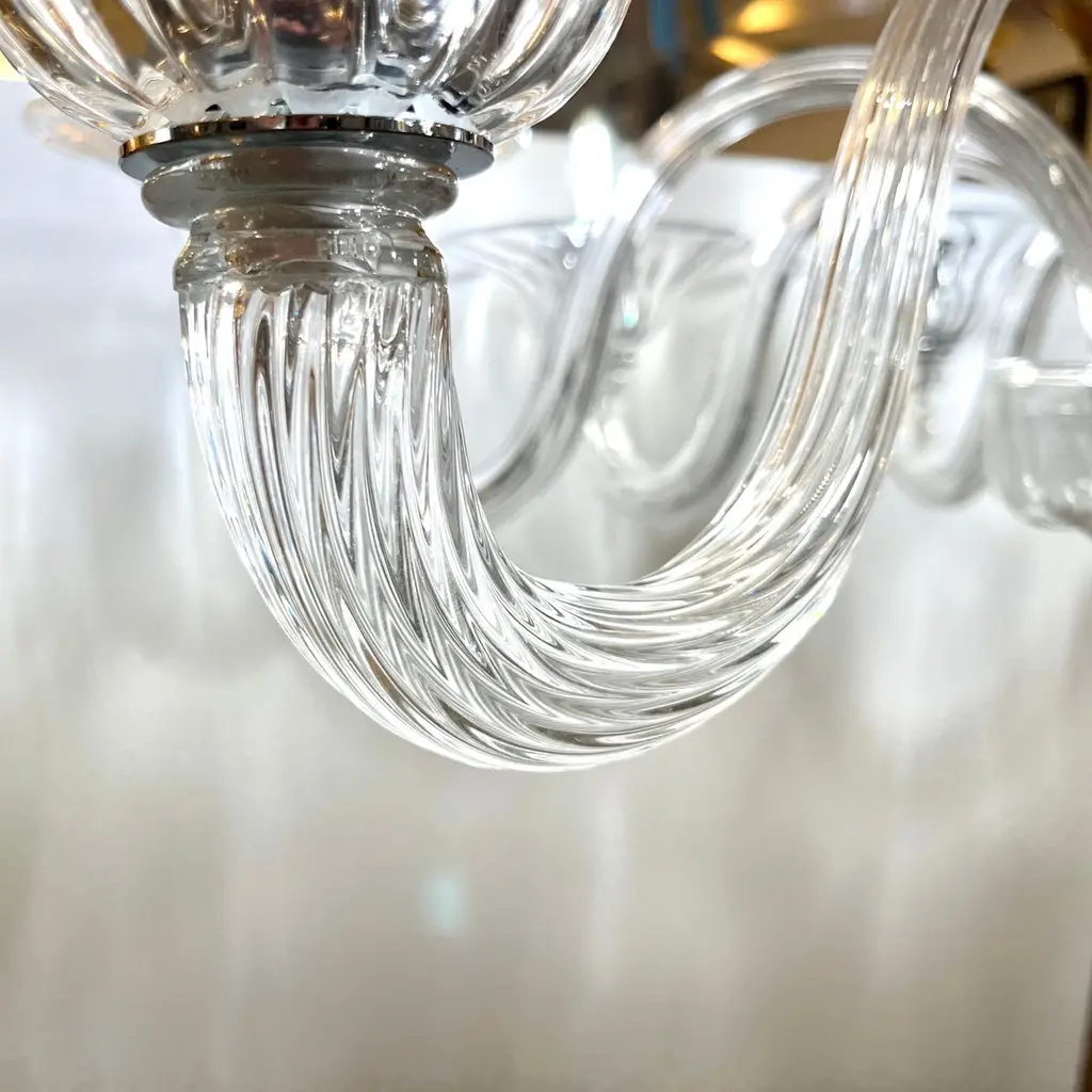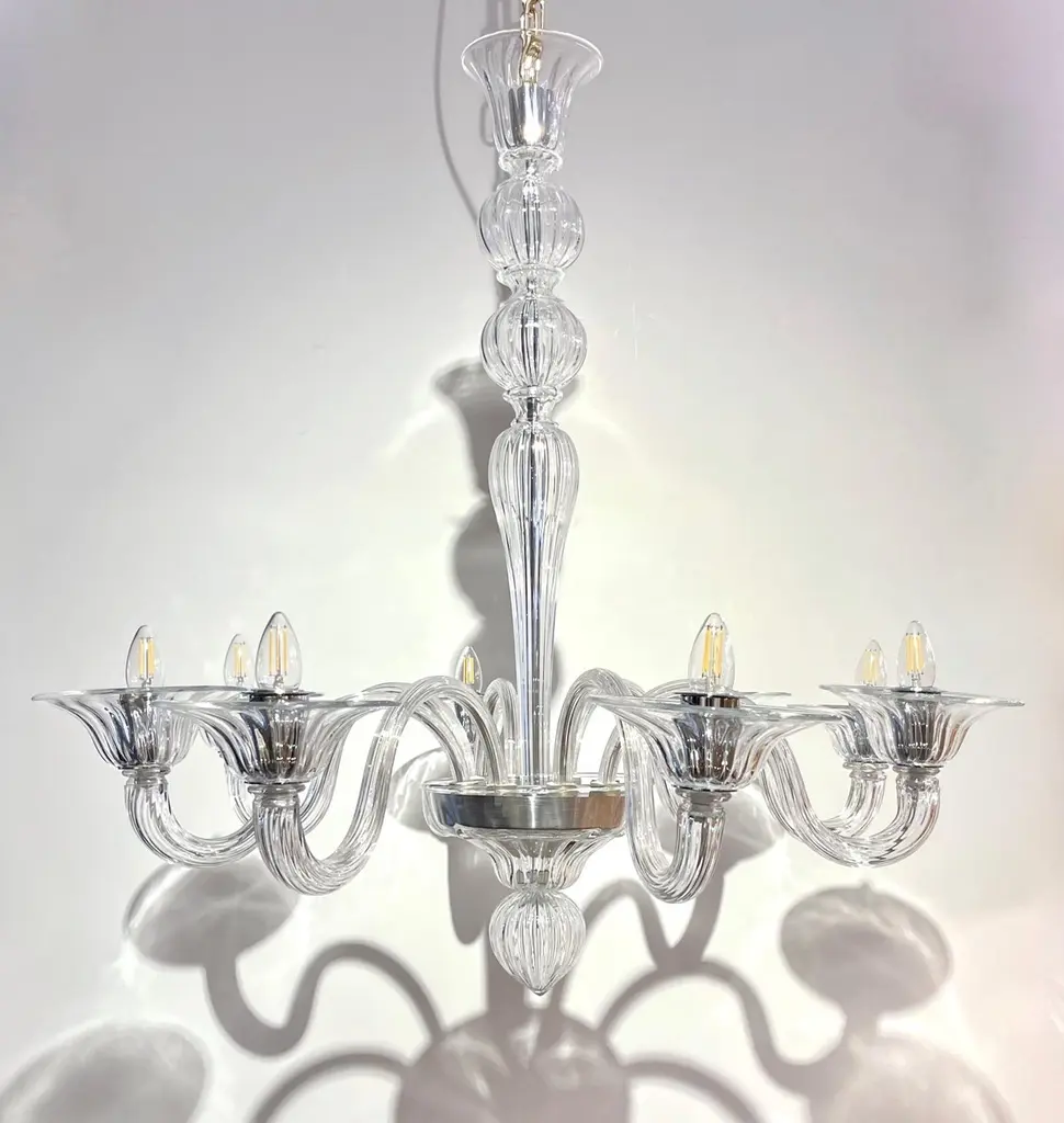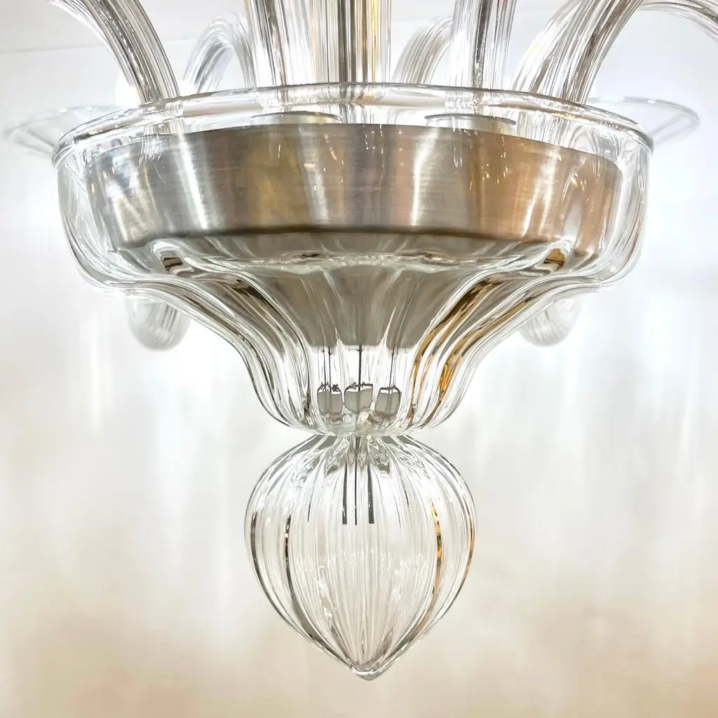Minimalist modern creation of the traditional Venetian Chandelier, 8 lights, in artistic blown crystal Murano glass, entirely hand-crafted in Italy.This lighting fixture in Murano glass is characterized by superb sinuous simplicity. It is inspired by the classic Murano chandeliers and re-elaborated with a contemporary, fresh and airy feel. The 8 reeded arms jutting out of a bowl support high quality cups each with an exquisite border, containing a candelabra socket covered in nickel as is the central structure decorated with blown glass elements in different shapes.Made using high quality selected materials and finishing, perfect to decorate both classic, modern or eclectic spaces, this design is customizable on demand and comes in a wide variety of different models, sizes, colors and finishing including other styles of chandeliers, table lamps and wall lights, please contact us with your needs.
