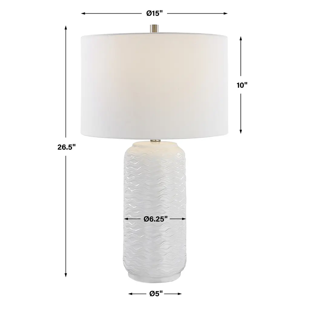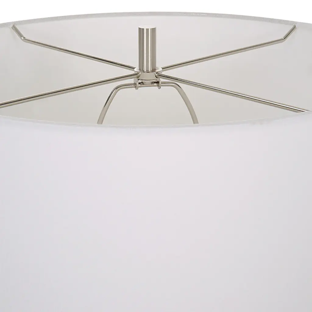 Crafted from man-made white stone that accurately replicate the look of Thassos marble, this lamp doubles as lighting and a modern work of art. The hardback drum shade is covered in white linen fabric.17"L x 17"W x 32"H. Weighs 13 lbs.Hand Finished Faux Marble and Metal with Fabric ShadeUL listed. Uses one max 150W Type A bulb (not included). 3 way socket switch.Heirloom Quality - Expertly hand crafted and hand finished. Due to the hand crafted nature of this piece, each piece may have subtle differences.