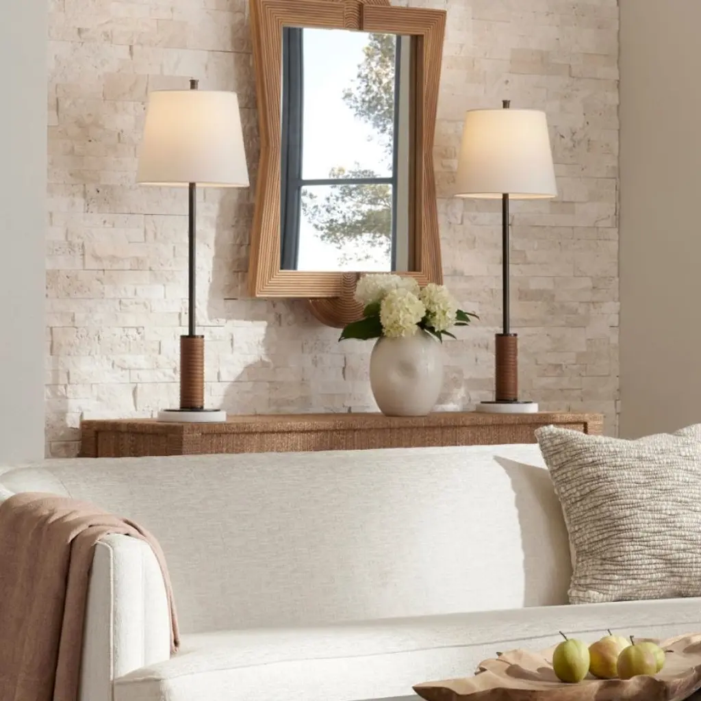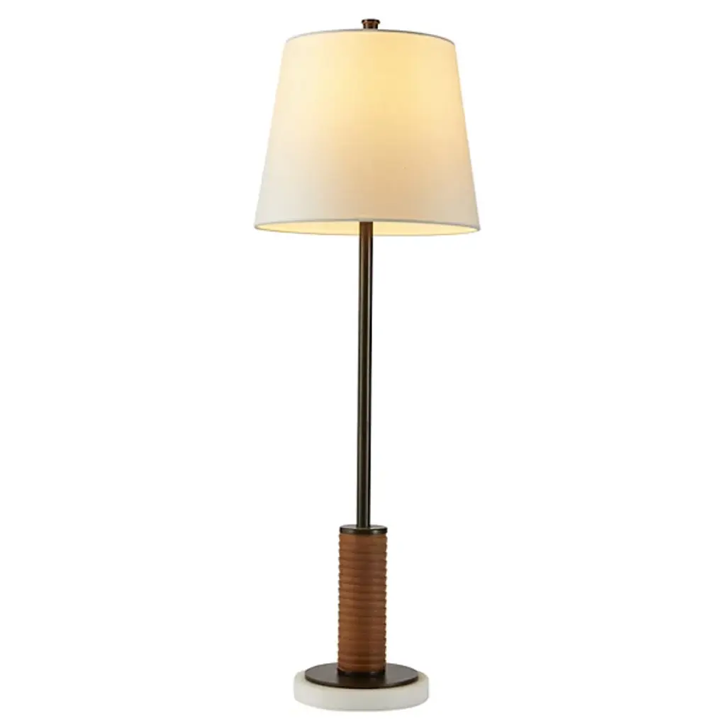 Fine cognac leatherworking and a taller silhouette makes the Conway ideal for a gentlemans lounge, console, or buffet. Both masculine and modern, this English bronze frame is anchored to a base of white marble for a sophisticated contrast. White linen drum shade and taupe cloth cord.