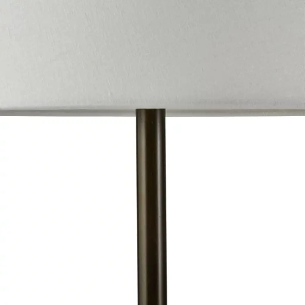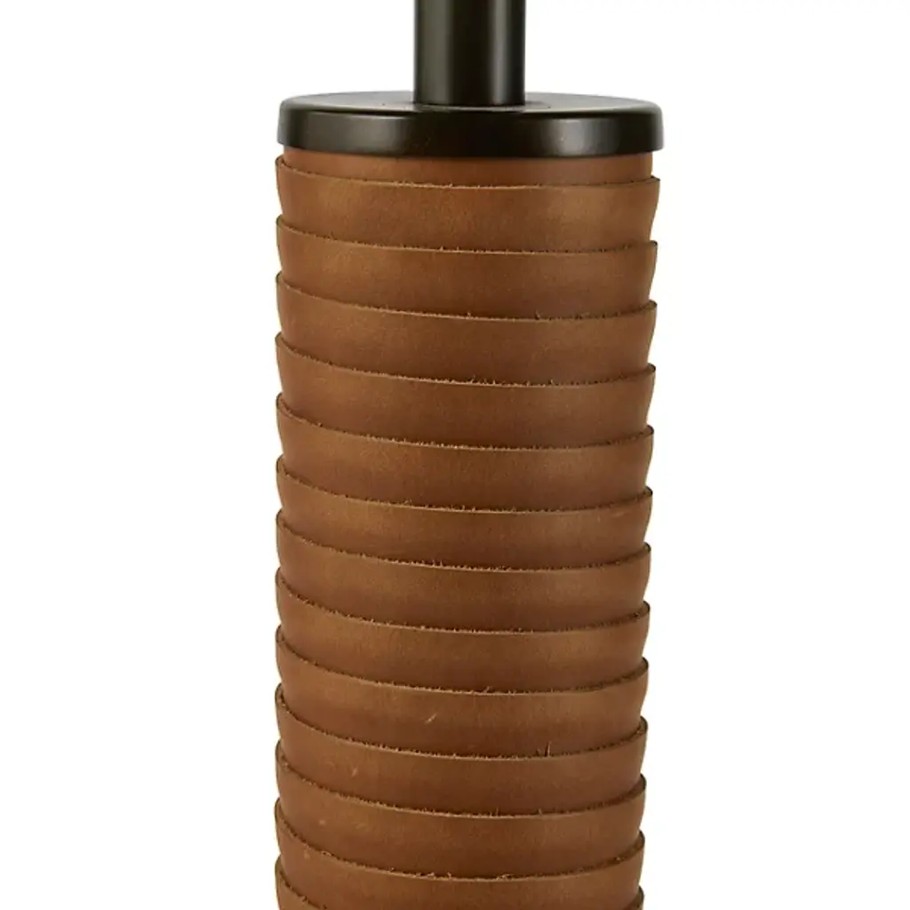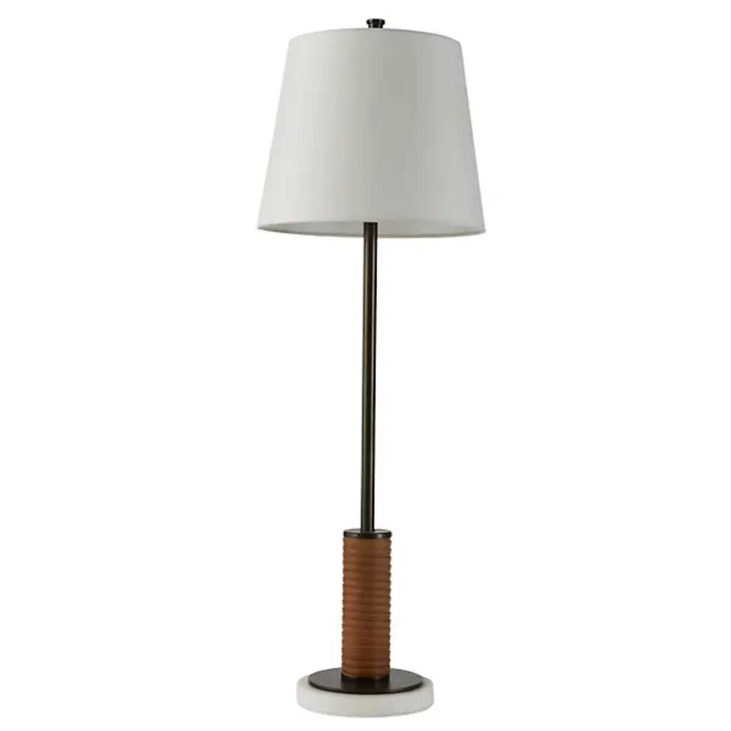 The Conway Table Lamp from Arteriors expresses a refined, transitional style with its fine cognac leatherworking and commanding silhouette, making it perfect for a lounge, console table, or other side table. A fusion of rustic masculine and refined modern elements, the English bronze-finished frame is elegantly anchored to a white marble disc base, creating a sophisticated contrast with the contoured leather. It features a white linen drum shade and a taupe cloth cord, adding to its luxurious appeal.