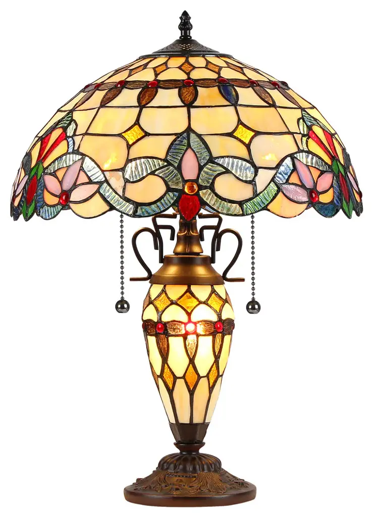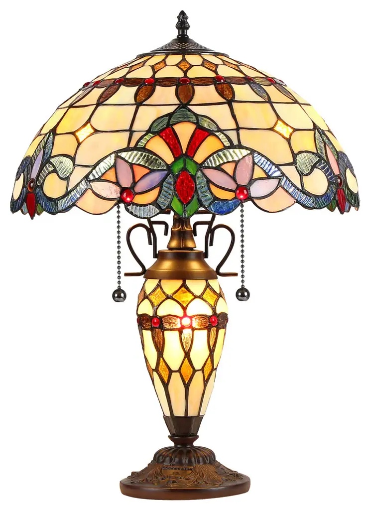 This Tiffany-style Victorian design 3-light double lit table lamp features a dark bronze finish and a lighted base that will complement many decors throughout your home. Hand crafted from individually hand cut pieces of art glass that will add color and beauty to any space.Main colors are beige and blue.(2) 60 Watt max E26 Type A Bulb + 1-Max 25 Watt E12 Type C Bulb (Type A bulb not included) Pull chain & on-cord rotary switch393pcs glass cut, 36 beadsDownlightIndoor SettingGlass &/or Fabric Color: Multi-coloredShape: RoundBulb Type: Incandescent; LED; Compact Fluorescent (CFL)Max Wattage: 60;25Bulb Base: E26 Medium;E12/CandelabraBulb Shape: A19; C10Additional Warning or Disclaimers: Since these are hand crafted products, the exact color of glass pieces may vary. Colors of the glass will appear darker and less vibrant when not illuminated. Handmade glass will vary from one piece to the other; glass made at different times will also vary. Light bulbs used in lamps or ambient lighting may affect the appearance of the products. Stained glass product has been protected with mineral oil as part of the finishing process. Please use a soft dry cloth to remove any excess oil.UL Certification #: E345256