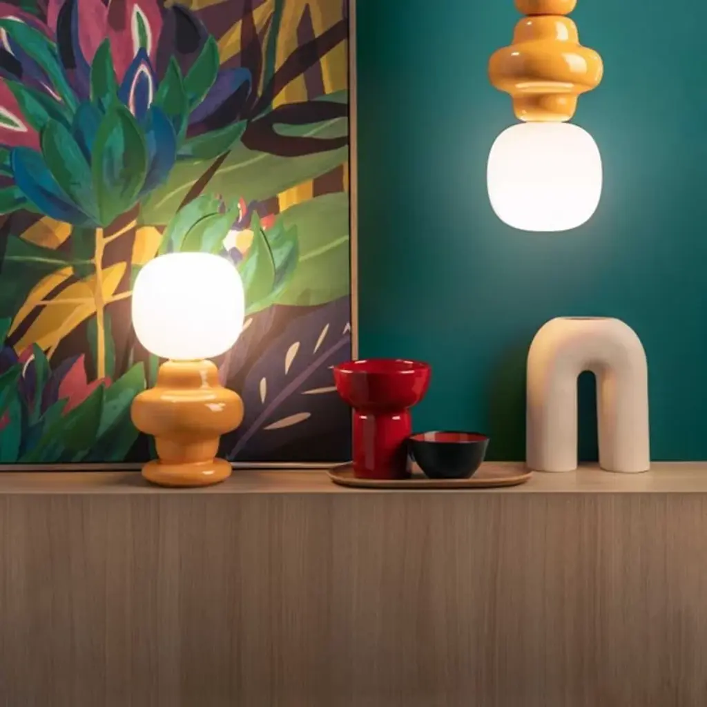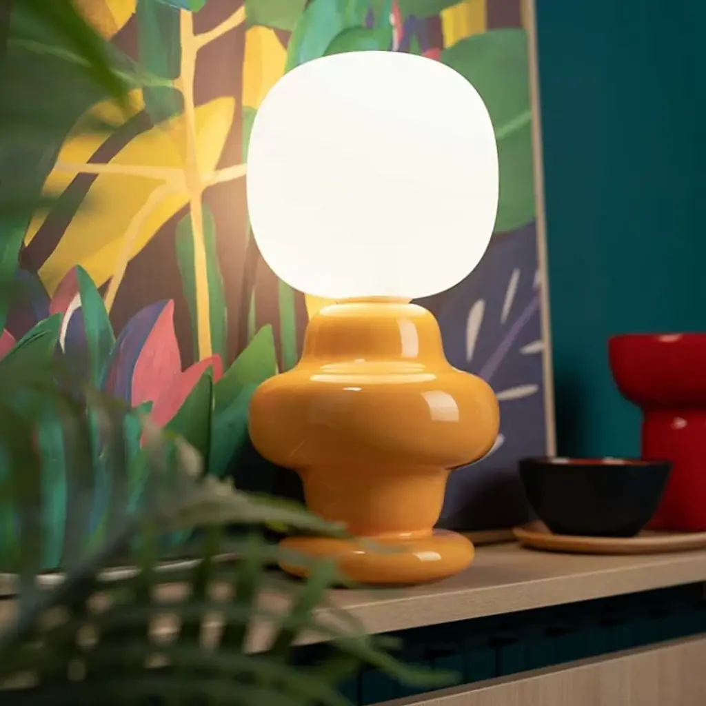 Enhance open spaces and flat surfaces with the Copacabana Table Lamp from Ferroluce. A marvelous modernist design ascending from a circular ceramic base, its contoured body supports strong lamping beneath a rounded shade of satin glass. The translucent material cuts bright glare to the sides, transforming it into a warm glow that washes out around the fixture, gleaming off the smooth lamp body with an articulate and elegant character.