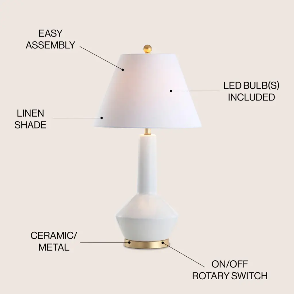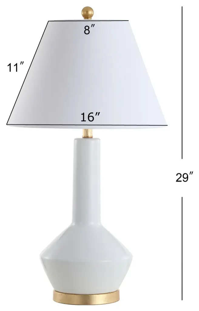 A modern update to the ubiquitous midcentury gourd lamps, this glossy ceramic silhouette adds intrigue to any decor. We love the brushed brass pedestal, and how the angles of the base are mirrored in the tapered linen empire shade. The designer elements extend to the plug, with a 60" silk-wrapped cord. Features:• The classic gourd gets a modern update in this geometric design • 100% cotton hardback empire shade• Beautiful to display or easy to conceal: the 60" cord is silk-wrapped• On-off rotary switch on socket• Eco-friendly 9W LED bulb included• Takes one bulb and compatible with any 12W LED 100W TYPE "A" 23W CFL• UL Listed • Color: White/Brass with white shade• Body Material: Ceramic/Metal• Base Material: Metal• Finial Material: Plastic• Finial Color: Gold Leaf• Harp Color: Gold• Includes: One (1) lamp(s)• Minor Assembly RequiredDimensions:• Lamp: 29 inches high x 16 inches wide x 16 inches deep• Shade: 11 inches high x 16 inches wide x 16 inches deepAbout us:You see a lamp.We see a decorative work of art.A perfectly curved shade casts a dramatic shadow on a floor. A silk cord you never want to hide. LED lightbulbs: as easy on the environment as they are on the eyes. The JONATHAN Y Lighting collection considers every detail from impeccably sourced materials to designer styling. And our prices are so attractive, we''ve transformed a functional necessity into a fashion accessory.JONATHAN Y Lighting - a fashion revolution in home decor.