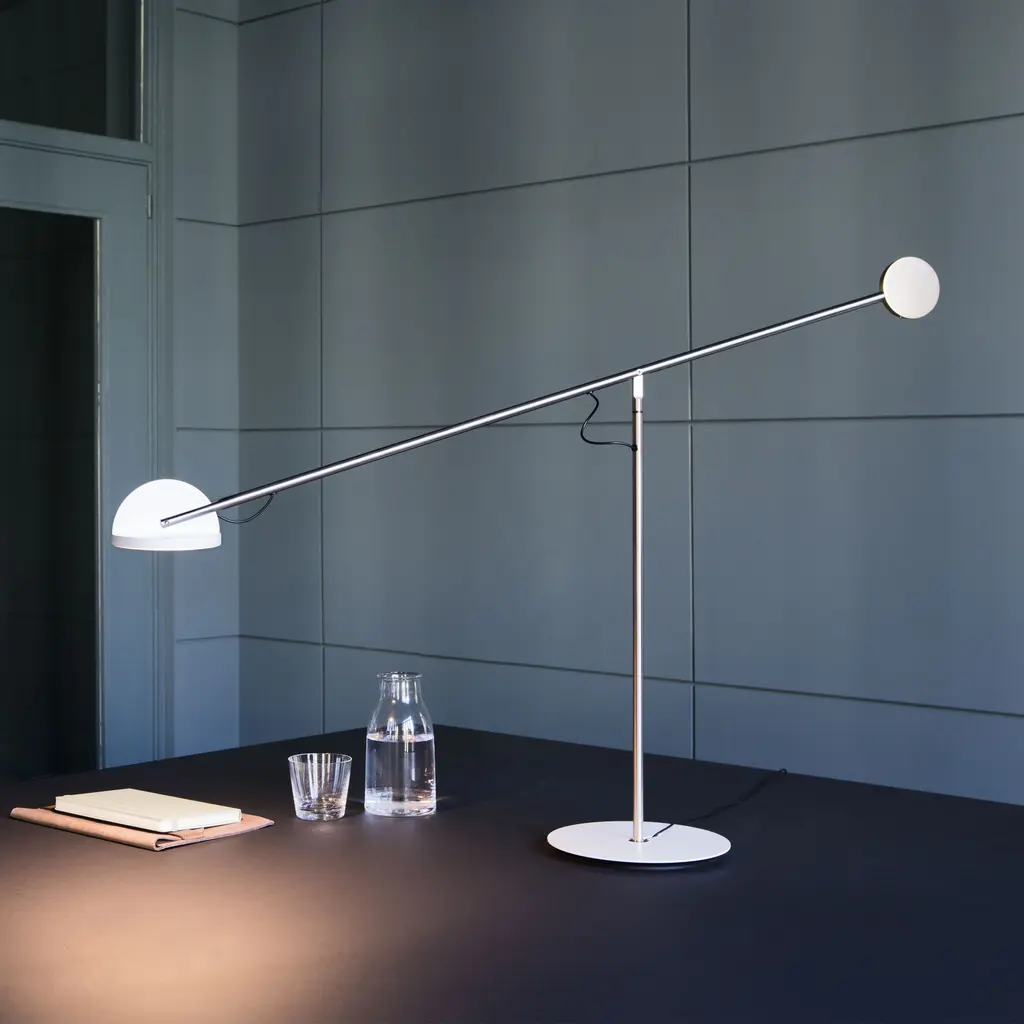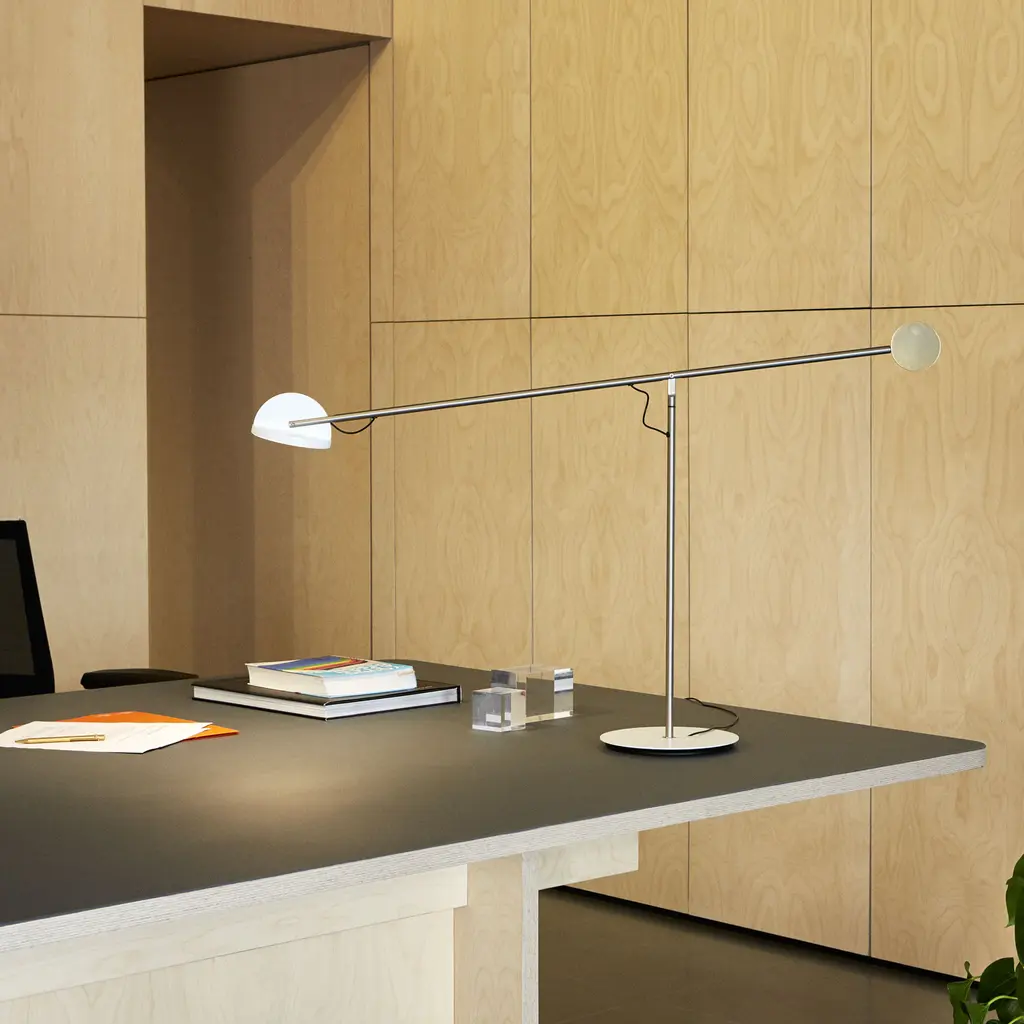 Graceful and seemingly weightless, the Copérnica Lamp designed by Ramírez i Carrillo for Marset almost seems to levitate above the table. Using different types of materials, weights, and geometric shapes, the designer created a versatile lamp that adapts to the needs of the user. The light moves through space as needed, whether you want to bring it forward to focus on your work or push it backwards to illuminate the room. A minimalist light sculpture, the lamp combines pure lines and elegant circle, semicircle, and tubular shapes in a crane-like silhouette. Copérnica is crafted from steel and aluminum. Perfect for living spaces and offices in equal measure.