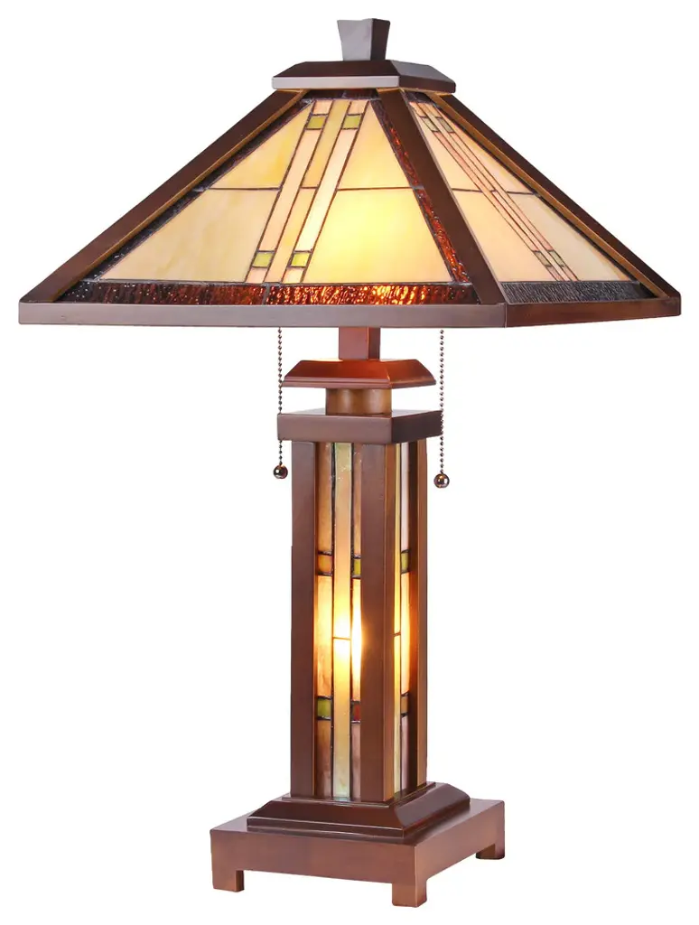 This arts and crafts style features a pyramid shade with a stepped border for added visual interest. The classic geometric design includes art glass in shades of amber, cream and tan, accented with glass pieces in sapphire blue and rich green. The linear geometric details on the bronzed base makes it a perfect complement to the shade. Setting: IndoorFixture finish: BronzeNumber of lights: Two (2)Requires two (2) 75-watt medium base bulbs (not included)Pull chainDimensions: 25 inches high x 16 inches wide x 16 inches deepAssembly required.