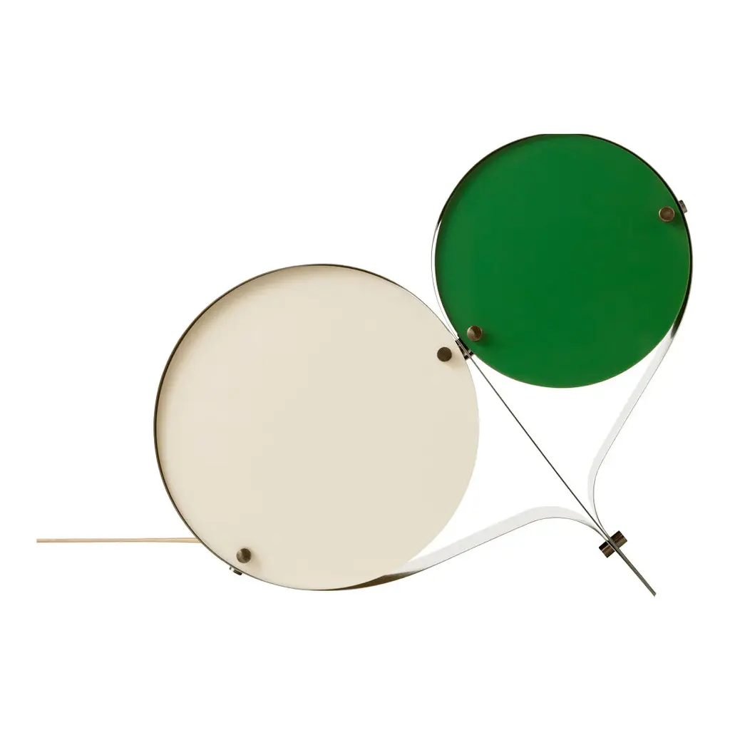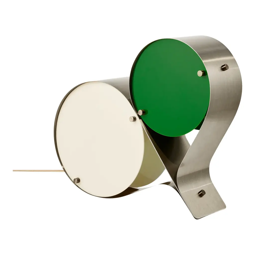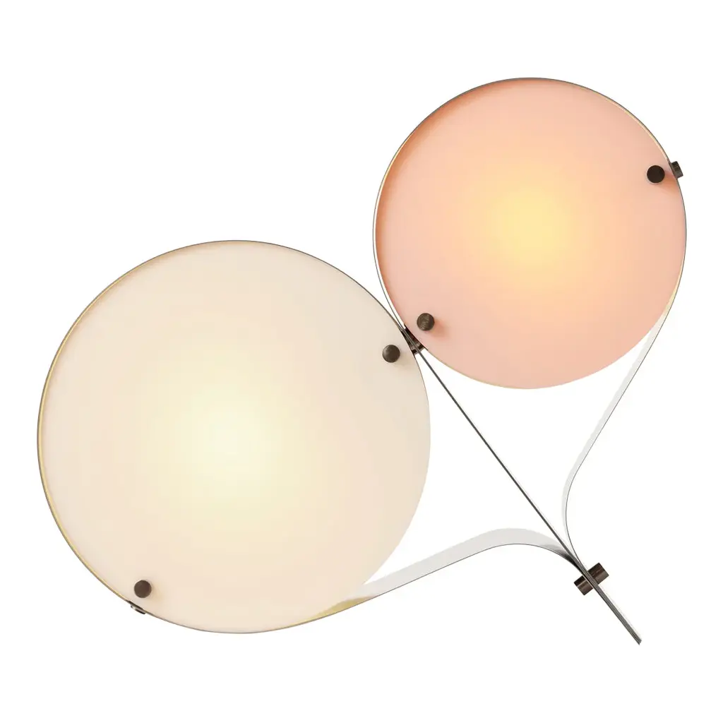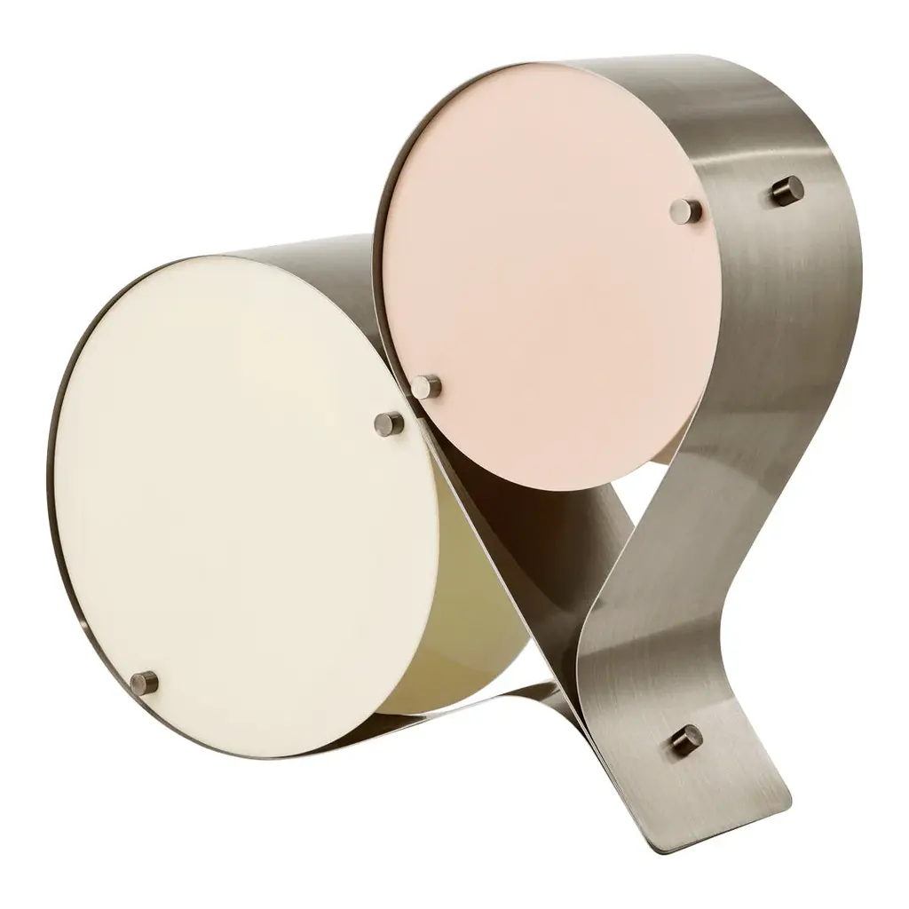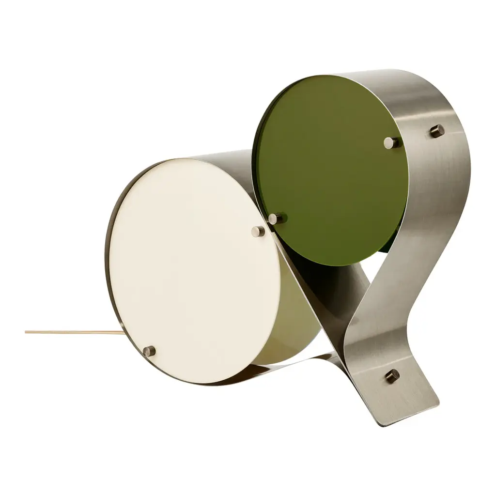 The Coppia Table Lamp is a new sculptural twin-bulb table lamp designed for GUBI by Vibeke Fonnesberg Schmidt. Featuring two discs of Fonnesberg Schmidtâ€s signature plexiglass housed in a curving metal case, the elegantly industrial design represents both a new material and a new designer for GUBI. The fluid yet geometric design is sturdy enough to be used as either a table or floor lamp, moving easily from desktop to bedside, shelf to windowsill as desired. Coppia is available in tempered, brushed stainless steel, its bronze glow contrasting with a choice of three nature-inspired plexiglass colorways: Ivory/Blush, Ivory/Olive, and Ivory/Clover. Named for the Italian word for ‘couple,†the Coppia Table Lamp by Vibeke Fonnesberg Schmidt walks the line between design and sculpture – a characteristic of much of her work as a lighting designer. Coppia sits at the intersection of art, design, and craft, finding beauty by playing with geometry. True to its name, Coppia is a design that celebrates pairings, meetings, and dualities. In Coppia, Fonnesberg Schmidt brings together two materials – stainless steel and plexiglass – in a double-shaded table lamp. Elegantly contoured, the lamp is formed from two sets of plexiglass discs in different sizes, pinned in place within a band of curved stainless steel, thus maintaining the shape of the lamp. In Coppia, the discs soften and diffuse the light from the central bulbs, creating a beautiful reflection on the surface of the steel. Openings in the structure where the folded metal joins invite the gaze to explore the interior of the light and fully appreciate the depth of the design. In this coming together of light, form, and material, Coppia is elevated to the status of sculpture, influencing the ambiance with color and shape. Coppia marks the first use of a new material for GUBI – plexiglass, or acrylic, which has become Fonnesberg Schmidtâ€s signature as a lighting designer. Lighter than glass, the material can be easily cut into almost any shape, as well as cast in a multitude of different colors. Simple and minimalist while also being playful and decorative, the lamp owes its distinctive character to the meeting of materials and the contrasts that result – the hard, matte surface of the brushed metal versus the colorful, high-shine finish of the plexiglass.