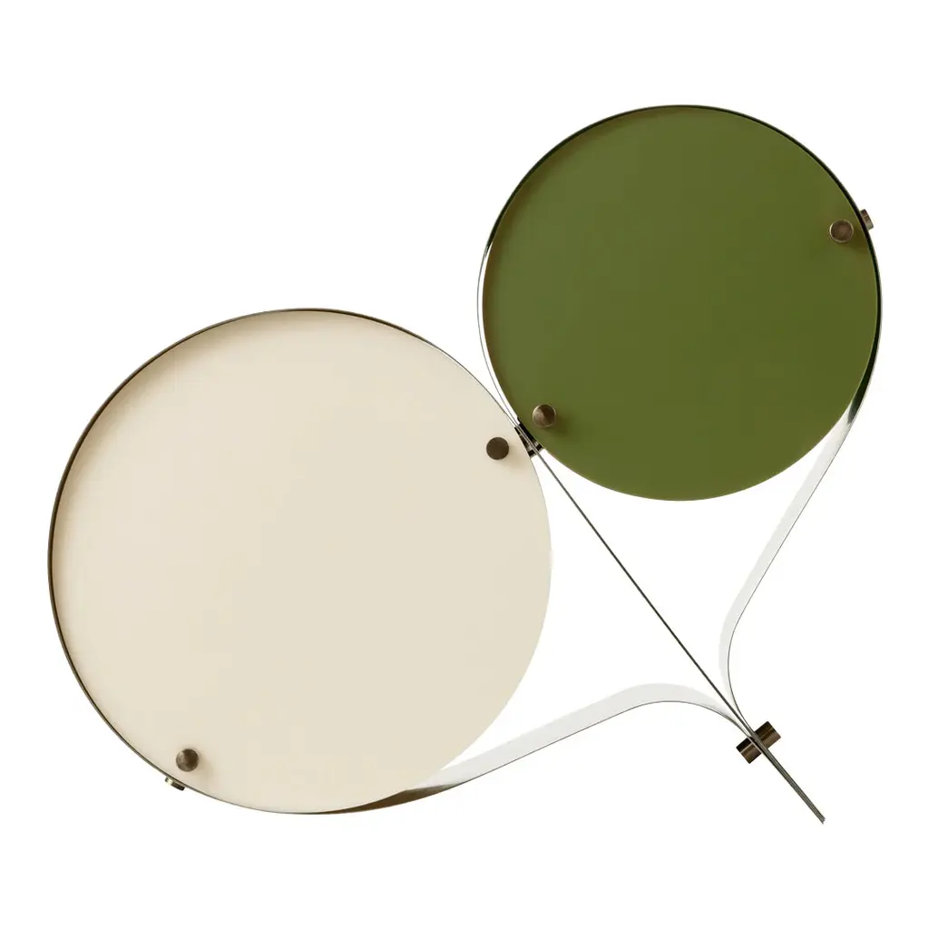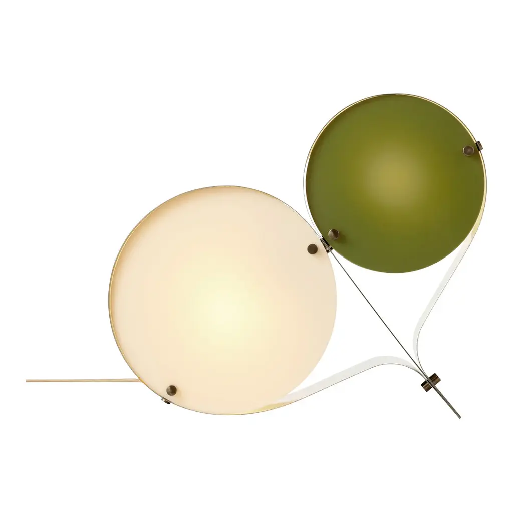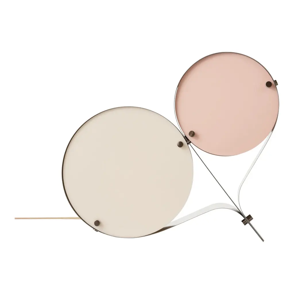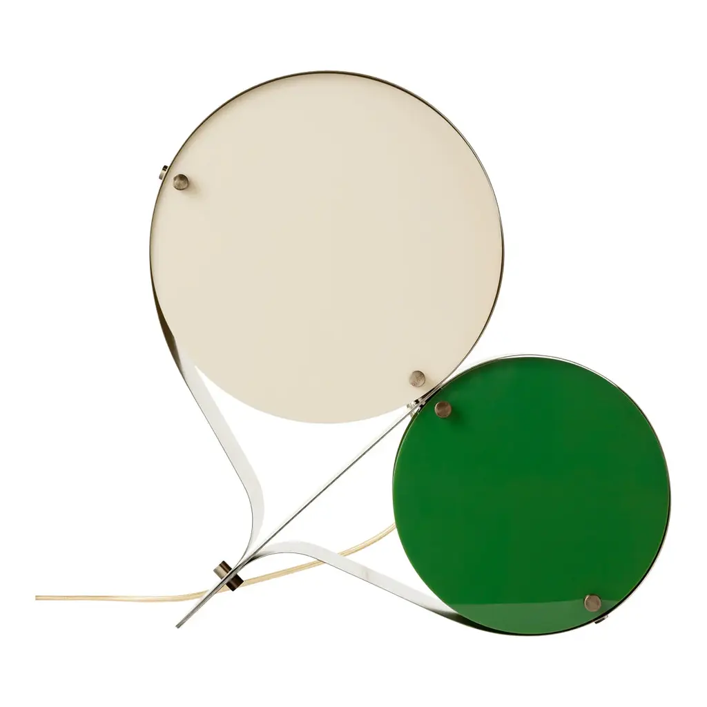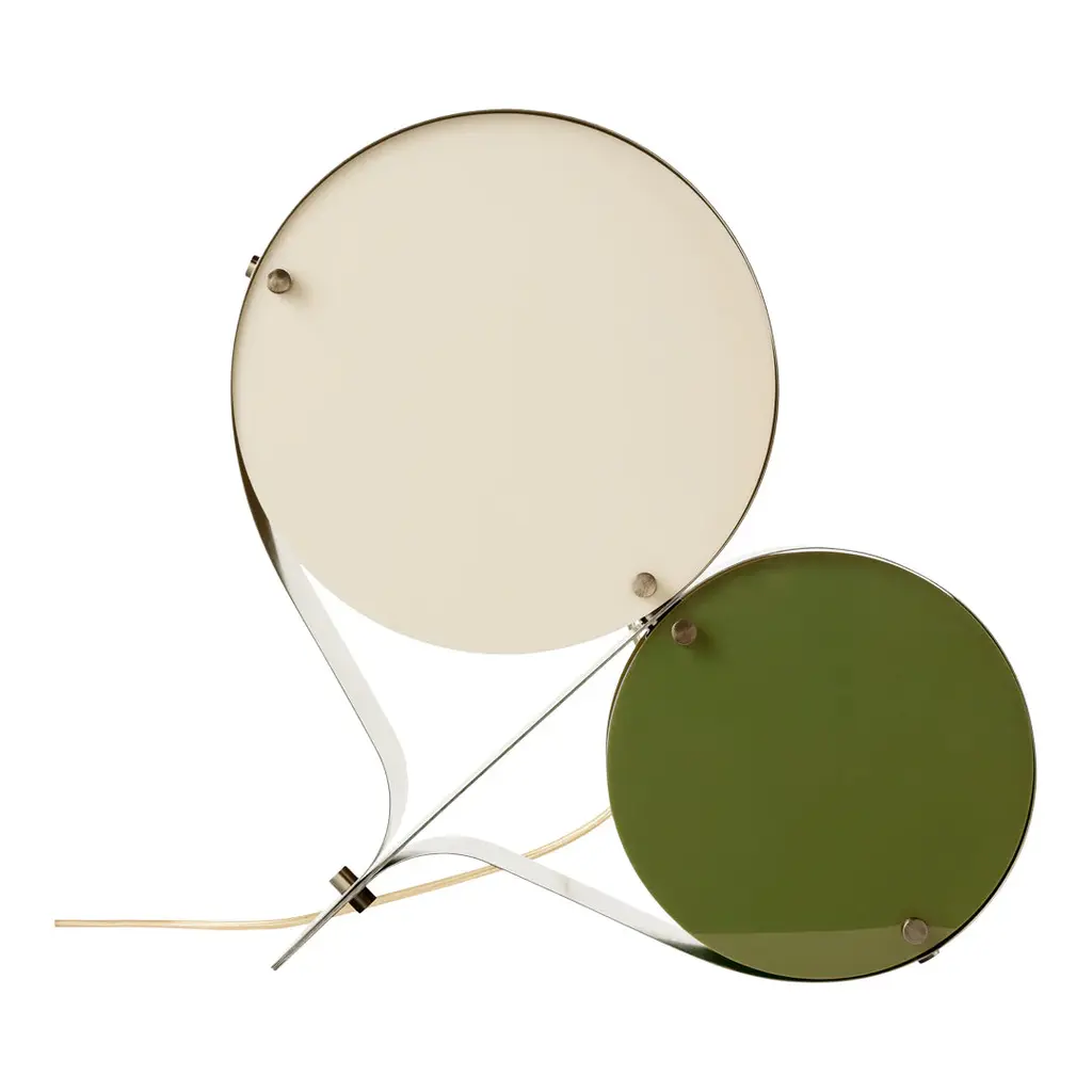 The Coppia Table Lamp is a new sculptural twin-bulb table lamp designed for GUBI by Vibeke Fonnesberg Schmidt. Featuring two discs of Fonnesberg Schmidtâ€s signature plexiglass housed in a curving metal case, the elegantly industrial design represents both a new material and a new designer for GUBI. The fluid yet geometric design is sturdy enough to be used as either a table or floor lamp, moving easily from desktop to bedside, shelf to windowsill as desired. Coppia is available in tempered, brushed stainless steel, its bronze glow contrasting with a choice of three nature-inspired plexiglass colorways: Ivory/Blush, Ivory/Olive, and Ivory/Clover. Named for the Italian word for ‘couple,†the Coppia Table Lamp by Vibeke Fonnesberg Schmidt walks the line between design and sculpture – a characteristic of much of her work as a lighting designer. Coppia sits at the intersection of art, design, and craft, finding beauty by playing with geometry. True to its name, Coppia is a design that celebrates pairings, meetings, and dualities. In Coppia, Fonnesberg Schmidt brings together two materials – stainless steel and plexiglass – in a double-shaded table lamp. Elegantly contoured, the lamp is formed from two sets of plexiglass discs in different sizes, pinned in place within a band of curved stainless steel, thus maintaining the shape of the lamp. In Coppia, the discs soften and diffuse the light from the central bulbs, creating a beautiful reflection on the surface of the steel. Openings in the structure where the folded metal joins invite the gaze to explore the interior of the light and fully appreciate the depth of the design. In this coming together of light, form, and material, Coppia is elevated to the status of sculpture, influencing the ambiance with color and shape. Coppia marks the first use of a new material for GUBI – plexiglass, or acrylic, which has become Fonnesberg Schmidtâ€s signature as a lighting designer. Lighter than glass, the material can be easily cut into almost any shape, as well as cast in a multitude of different colors. Simple and minimalist while also being playful and decorative, the lamp owes its distinctive character to the meeting of materials and the contrasts that result – the hard, matte surface of the brushed metal versus the colorful, high-shine finish of the plexiglass.