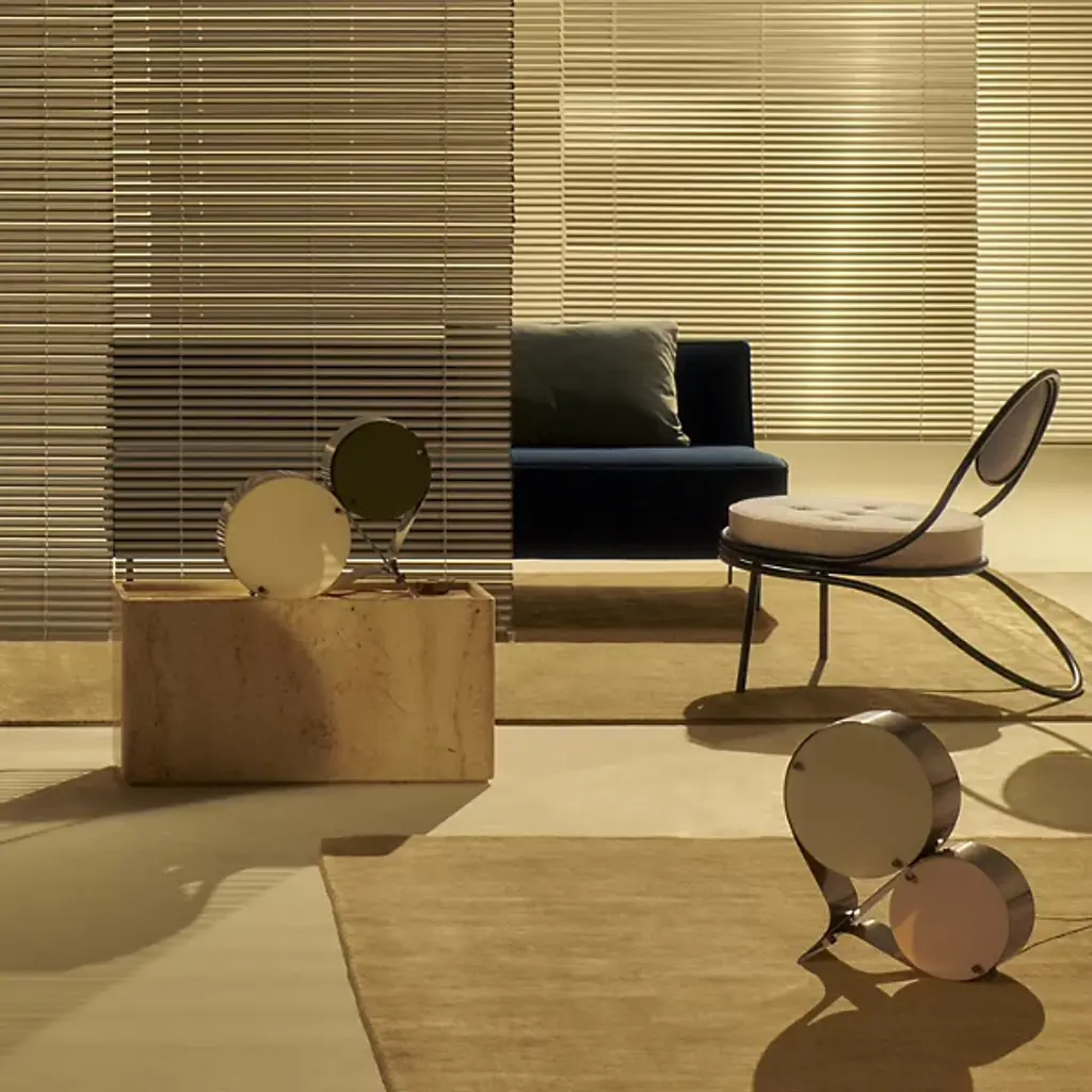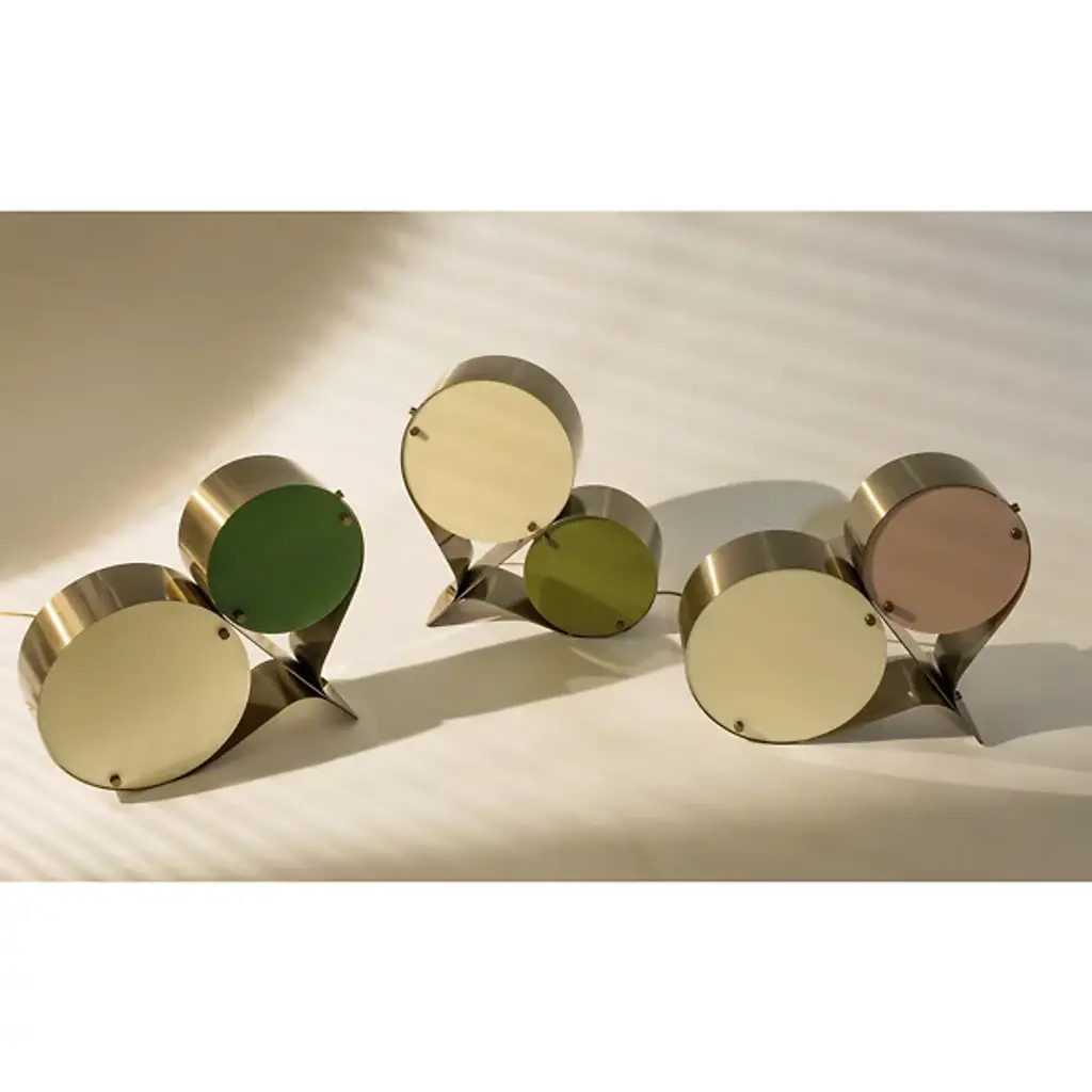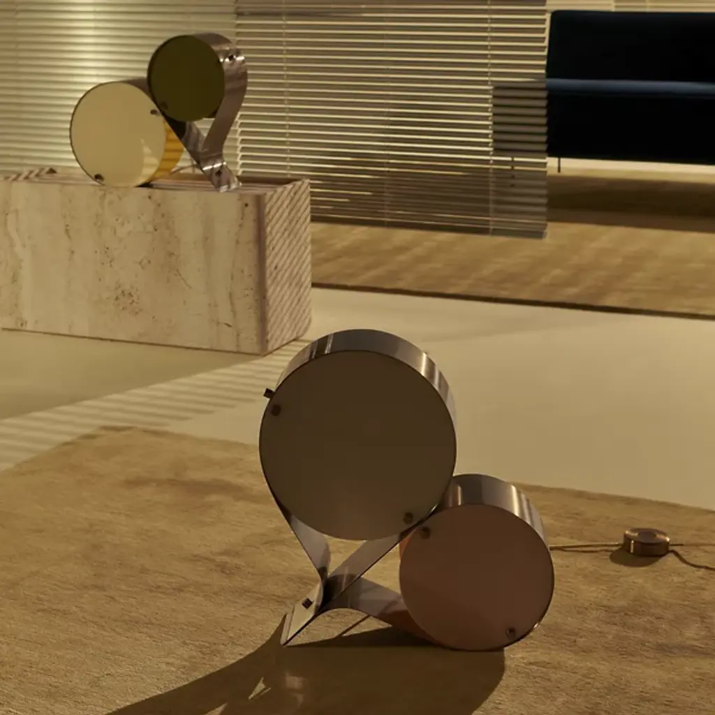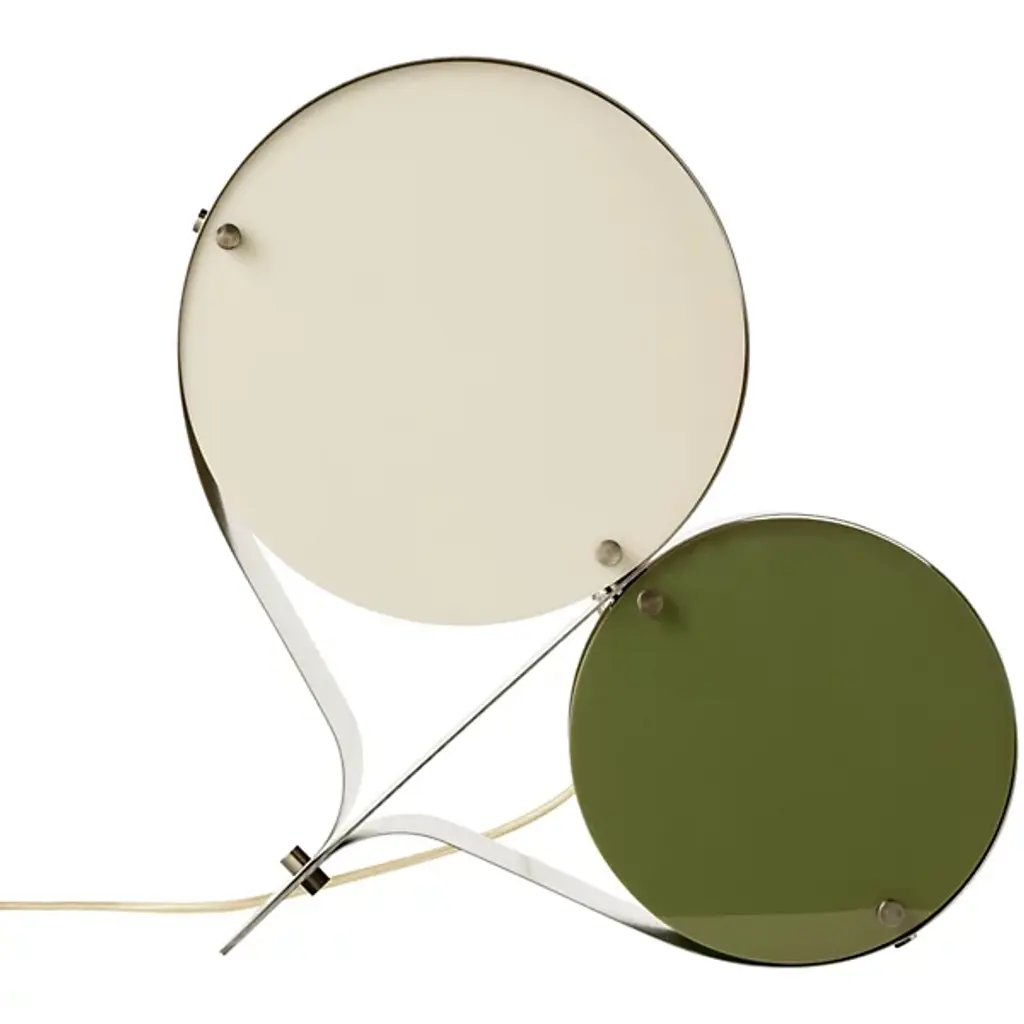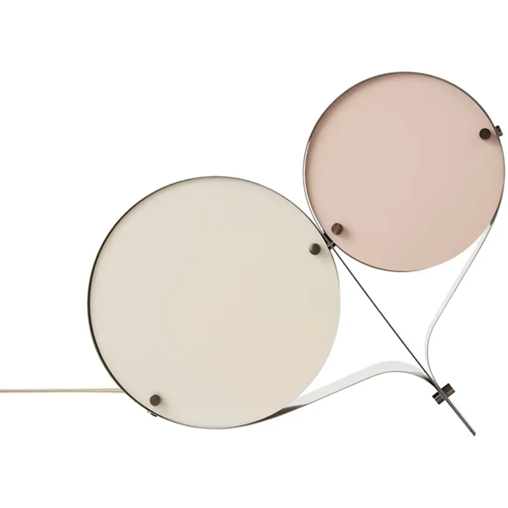 The Coppia Table Lamp from GUBI, designed by Vibeke Fonnesberg Schmidt in 2024, brings a sculptural presence with its twin-disc plexiglass diffusers encased in a curving metal frame. Blending industrial strength with fluid geometry, its tempered stainless steel structure reflects a warm glow, contrasting beautifully with the nature-inspired diffusers. Versatile in design, this lamp transitions effortlessly from tabletop to bedside or windowsill. With an inline switch for easy operation, the fixture offers a refined balance of form and function in a contemporary Scandinavian aesthetic.