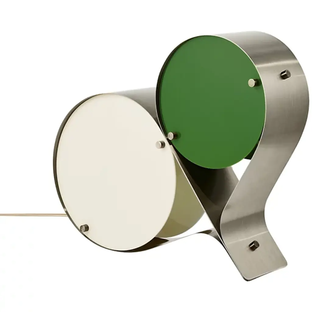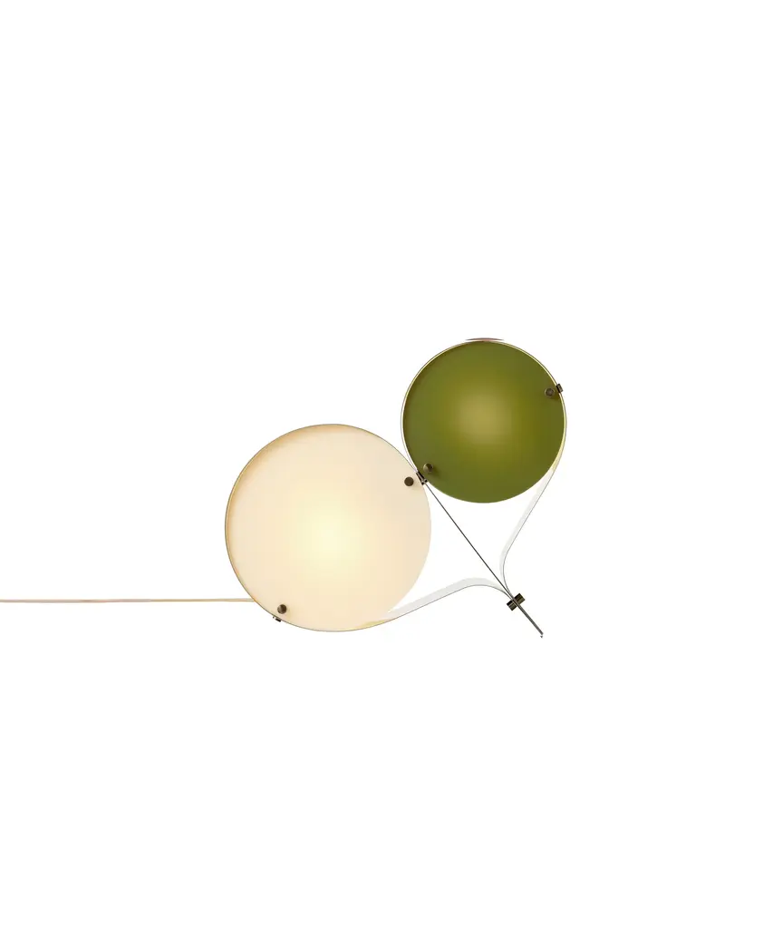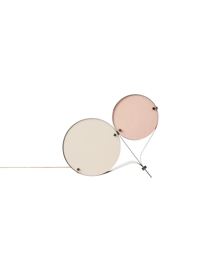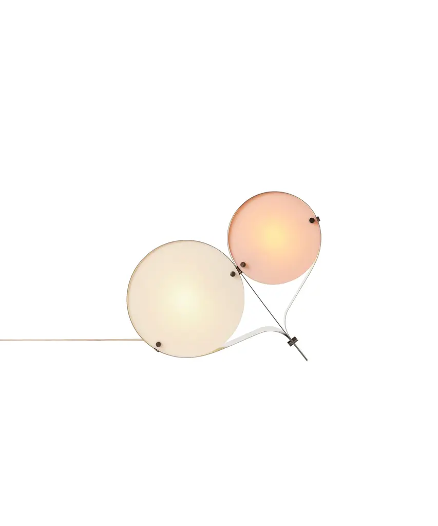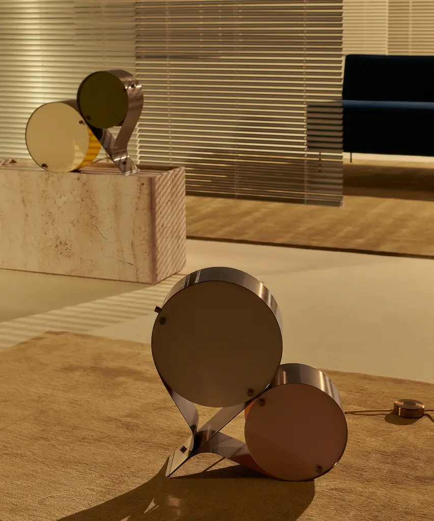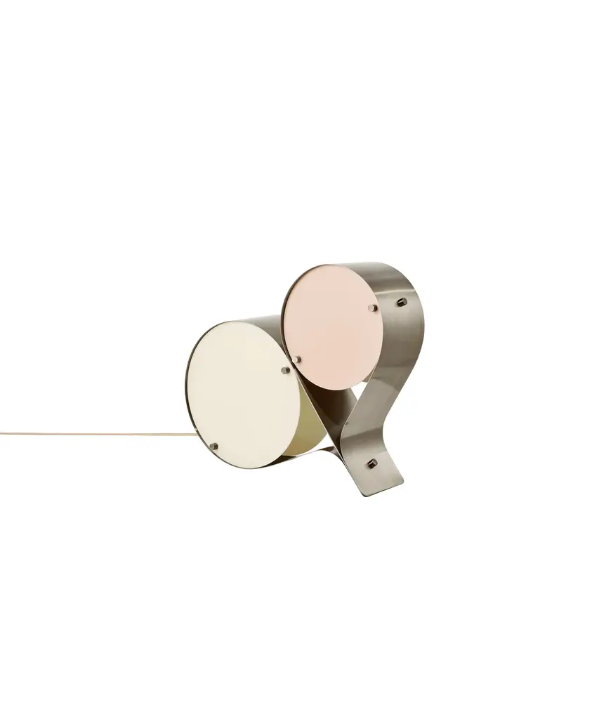 The Coppia Table Lamp is a new sculptural twin-bulb table lamp designed for GUBI by Vibeke Fonnesberg Schmidt. Featuring two discs of Fonnesberg Schmidt’s signature plexiglass housed in a curving metal case, the elegantly industrial design represents both a new material and a new designer for GUBI. The fluid yet geometric design is sturdy enough to be used as either a table or floor lamp, moving easily from desktop to bedside, shelf to windowsill as desired. Coppia is available in tempered, brushed stainless steel, its bronze glow contrasting with a choice of three nature-inspired plexiglass colorways: Ivory/Blush, Ivory/Olive, and Ivory/Clover. Produced by Danish design publisher, Gubi.