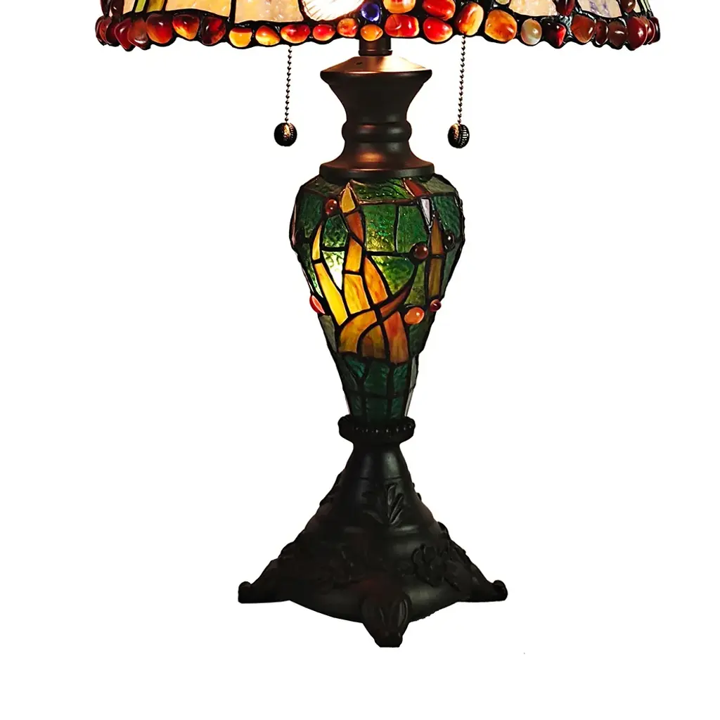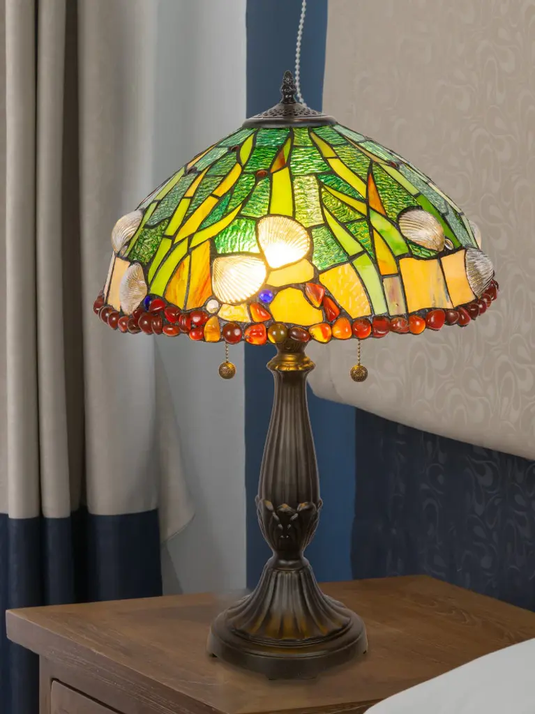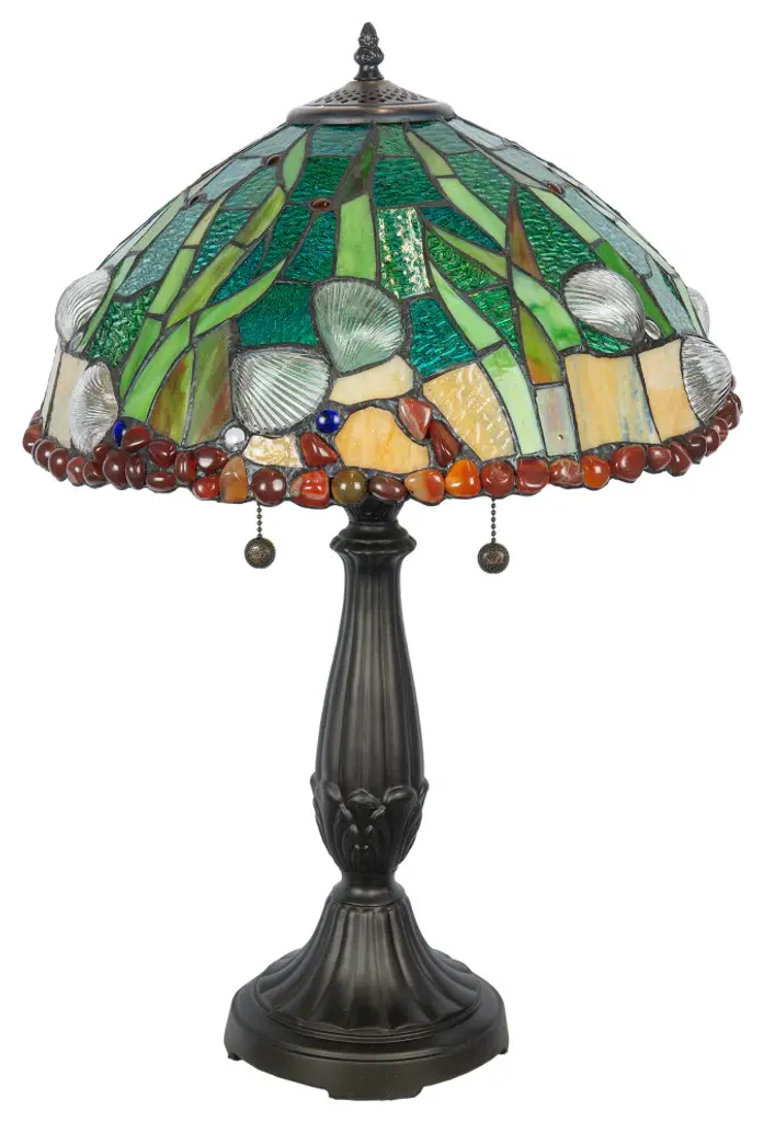 Our Coral Sea Tiffany Table Lamp is a fantastic depiction of the under-sea world you will enjoy for many years to come. The generously sized dome shade begins with a background of shimmery sea blue art glass. The bottom border features pebble stones and rocks that are interspersed with billowy amber and green sea grass. Large white art glass seashells have been placed throughout the surface for added texture and visual interest. The metal base is finished in deep Fieldstone and features a footed pedestal with reeding detail and a tapered center column with complementary accents. A matching vase cap and flame finial complete the look. An excellent choice in a den, study, office, or man cave, our Coral Sea Tiffany Table Lamp is also the ideal gift for marine enthusiasts. NOTE: Due to the nature of handmade art glass, colors, sizes and patterns may vary slightly.Socket: OnOffNumber of Bulbs: 2Bulb Type: Med Base - E26Wattage: 75WSwitch: Pull ChainBulbs Included: No