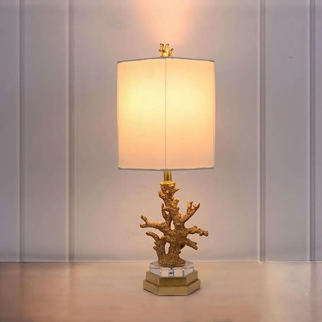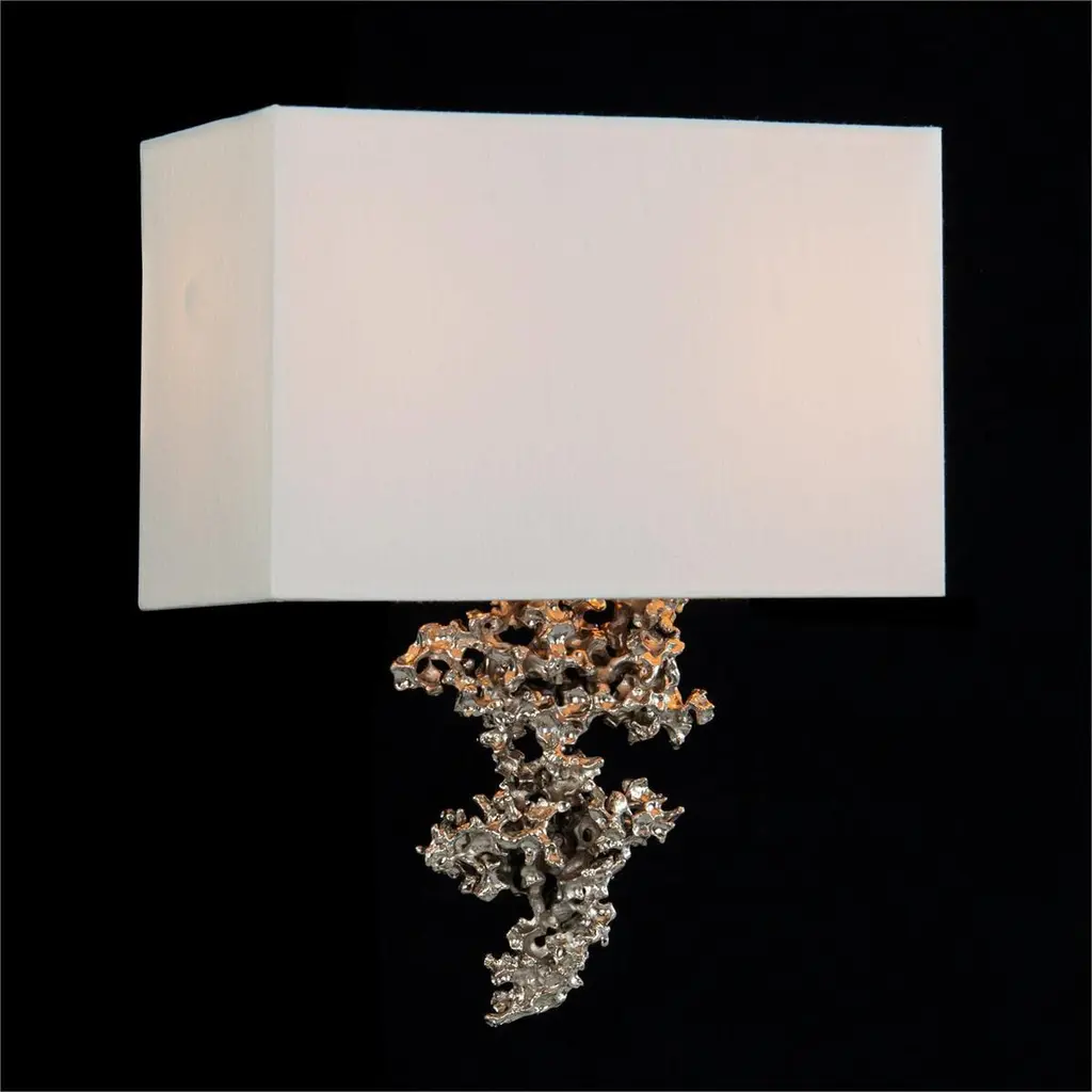 Evoking seaside days and summer nights, this fabulous sculptural table lamp creates a relaxing yet sophisticated ambiance in a living room, bedroom, or private office. The base features a superb branch of white coral mounted on a square base made of nickel-plated brass. The light is diffused through the rectangular shantung shade whose coral-red hue bounces off warm reflections on the polished surface of the frame below and enhances the details of the coral. This captivating design will dress up any coastal-inspired home with its unique style.
