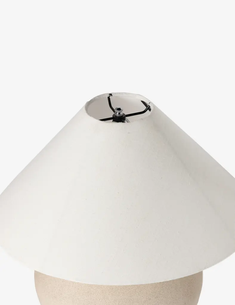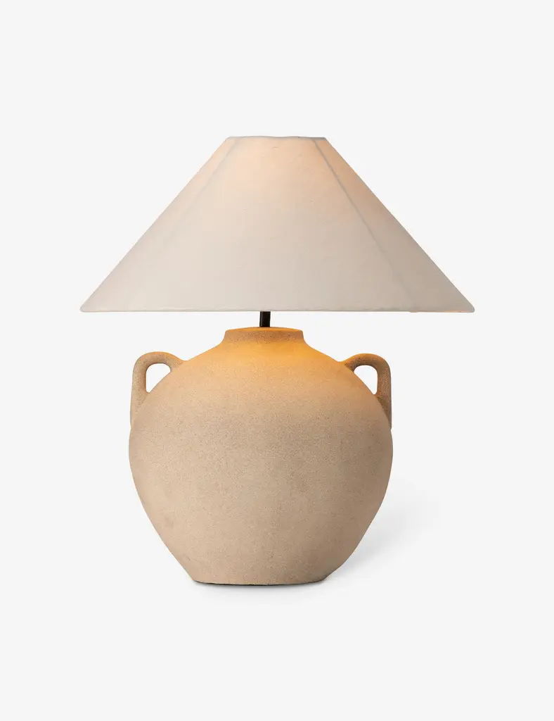 Inspired by the rustic artistry of antique clay jars, the Coralyn table lamp offers an earthy, grounded look. A rounded body with decorative handles is fashioned from Talavera and topped with a tapered linen shade fashioning this lamp for versatile appeal from the entryway to the lounge.