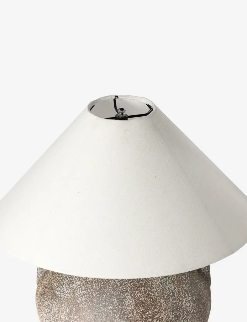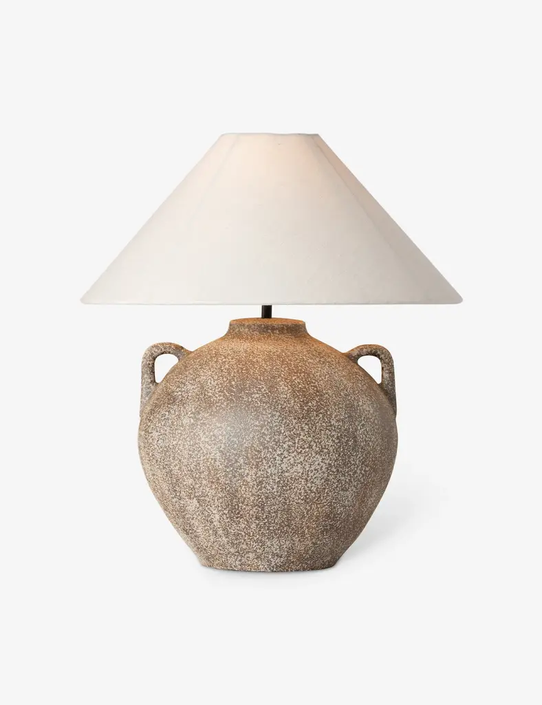 Inspired by the rustic artistry of antique clay jars, the Coralyn table lamp offers an earthy, grounded look. A rounded body with decorative handles is fashioned from Talavera and topped with a tapered linen shade fashioning this lamp for versatile appeal from the entryway to the lounge.