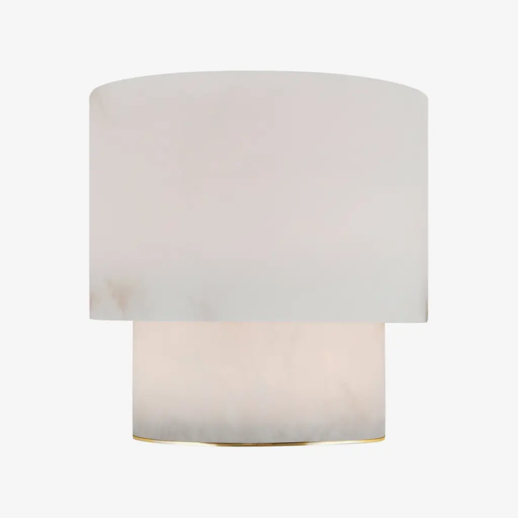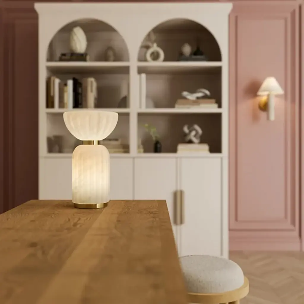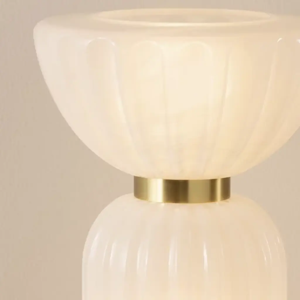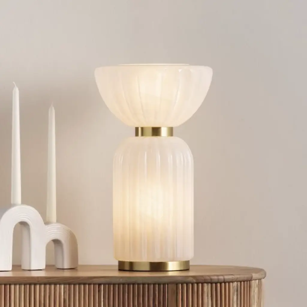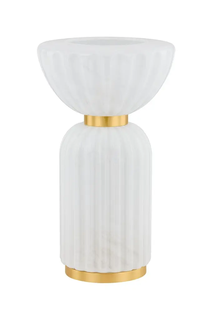 The Cordelia Table Lamp from Mitzi updates neoclassical forms through its fluted column base and inverted dome shade, both crafted from luminous cloud glass. The milky striations within the glass softly filter light, creating an all-over glow that illuminates from every surface. A precisely proportioned brass band cinches the hourglass form at its narrowest point, adding structural definition while introducing metallic warmth. The convenient cord switch enables easy operation without disrupting the lamp's clean lines. This lamp becomes the centerpiece of side tables, nightstands, or desks, where its sculptural presence provides both everyday brightness and artistic impact.