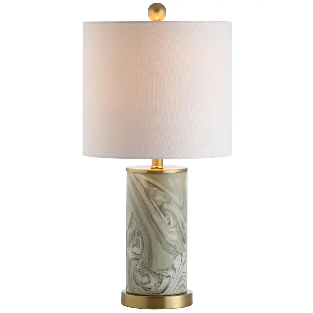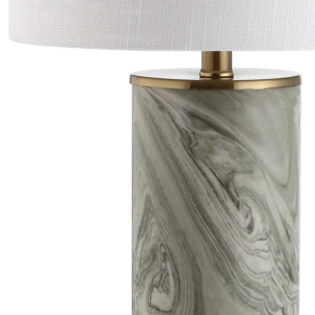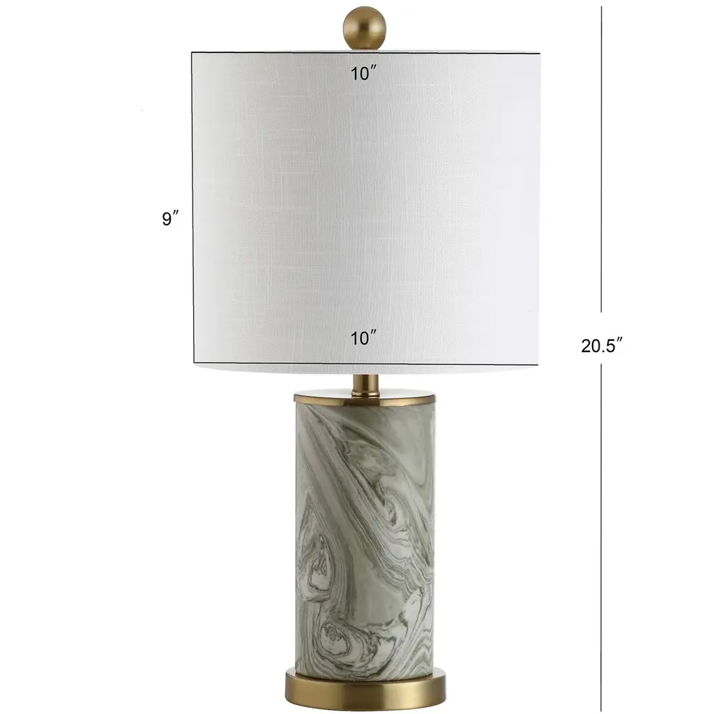 The marbleized green-and-white finish adds a dreamy luxuriousness to this cylindrical table lamp that is accentuated by the brass base and finial. The linen shade and the silk-wrapped cord are elegant finishing touches.