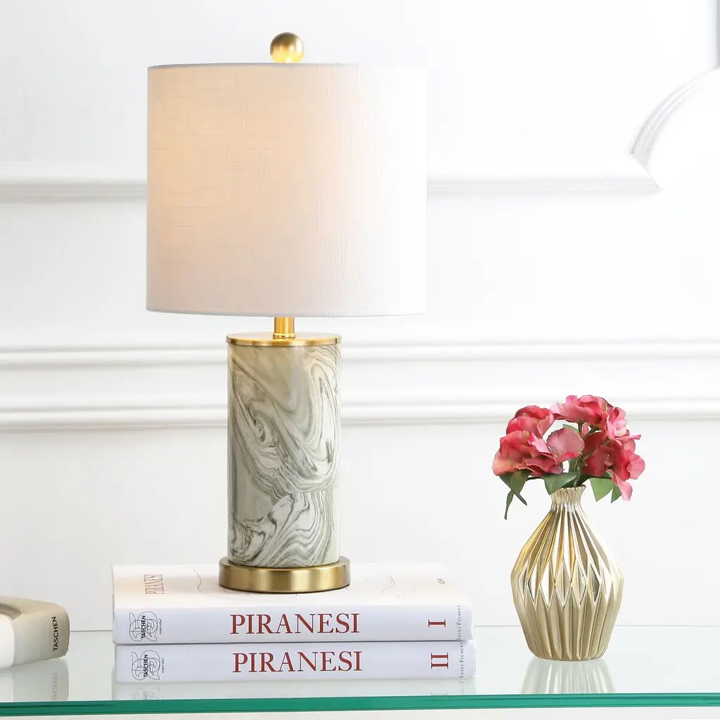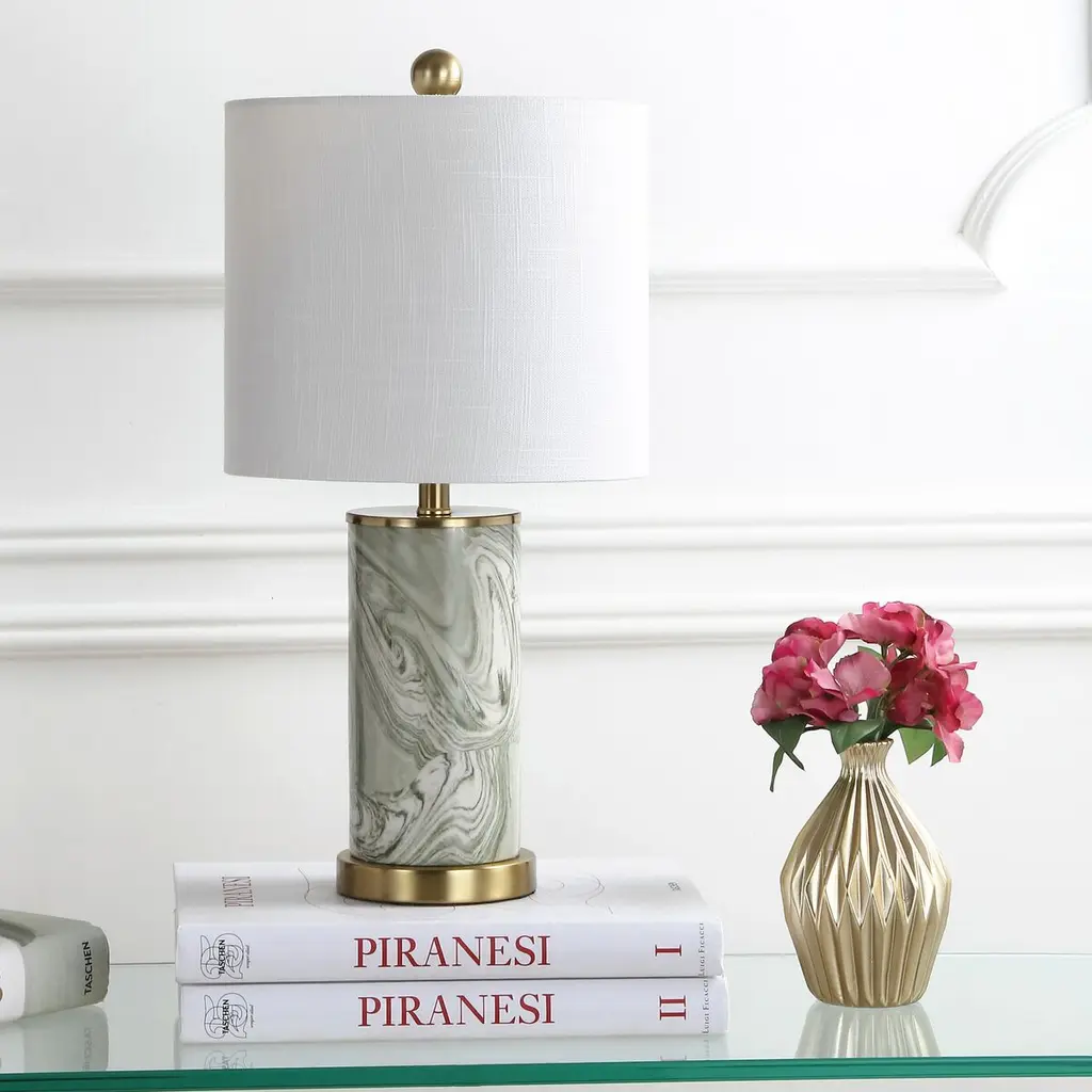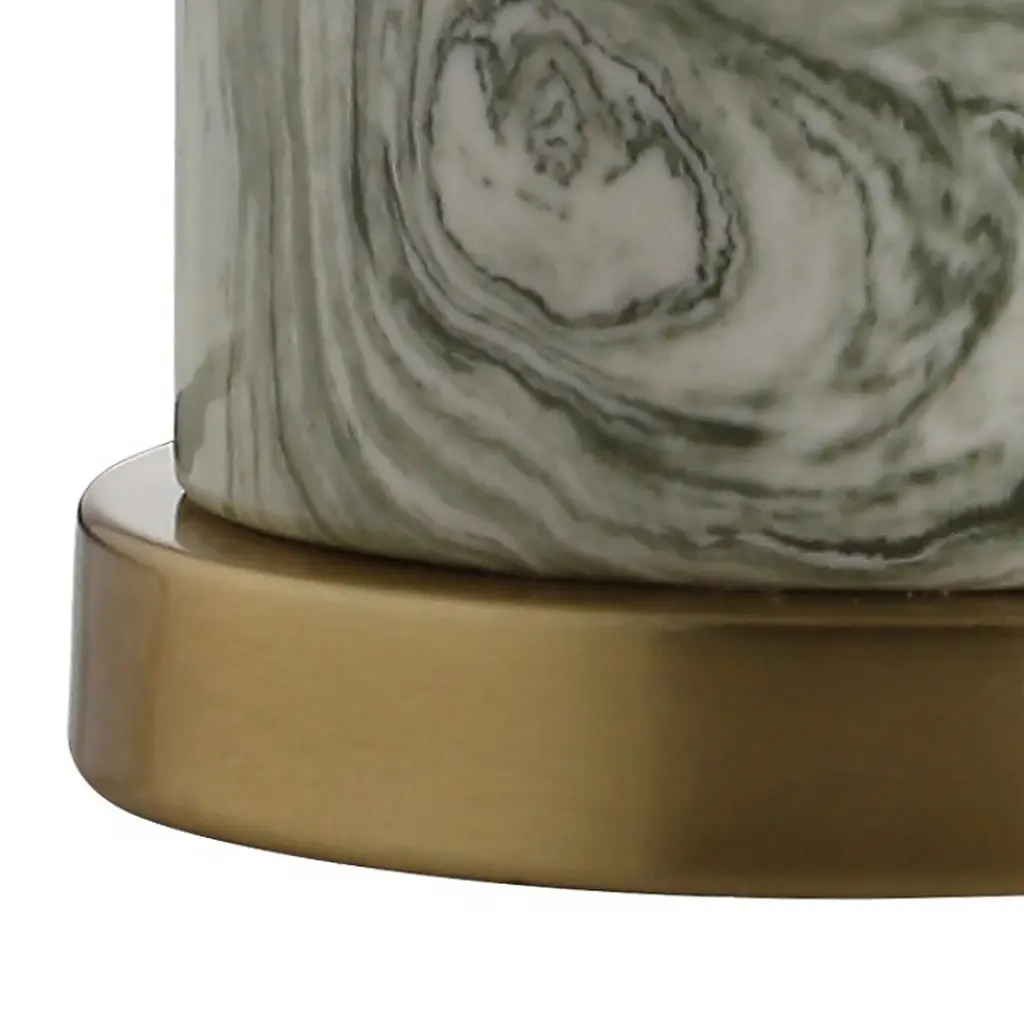 The marbleized green-and-white finish adds a dreamy luxuriousness to this cylindrical table lamp that is accentuated by the brass base and finial. The linen shade and the silk-wrapped cord are elegant finishing touches.