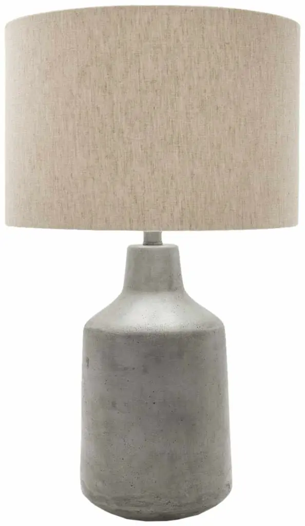 Collection: Corella Colors: Medium Gray, Taupe, White, Translucent Material: Body: Concrete,Shade (Outside): Linen,Shade (Inside): Polyester Styles: Traditional Made In: China Lighting Type: Accent Table Lighting Base: Resin Base Color: Slate Gray Shade Material: LinenPolyester Shade Color: WhiteTaupe Cord Length: 6' Switch Type: On/Off Number of Bulbs: 1 Socket Type: E-26 Bulb Wattage: 100W