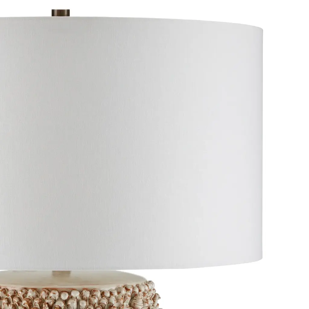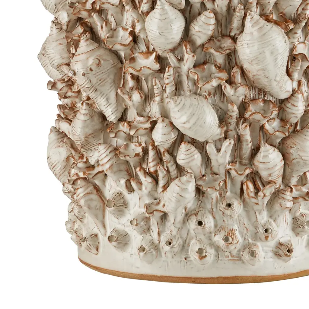 The coastal vibes of the Corfu Ivory Table Lamp are created by the tremendous amount of effort that into the surface ornamentation. Representations of whelk and snail shells are interspersed with barnacles and pieces of coral, all made of dark ceramic clay. The entire composition is covered in a milky white finish that rests in greater thickness in some spots than in others. Made by a group of women who live at the border of Burma and Thailand, the incredible ivory lamp is built by hand, layer-by-layer, one motif at a time to bring it tremendous character. In Stock Late May 2026 This image is for illustrative purposes only. The colors shown are accurate within the constraints of lighting, photography, and the color accuracy of your screen.