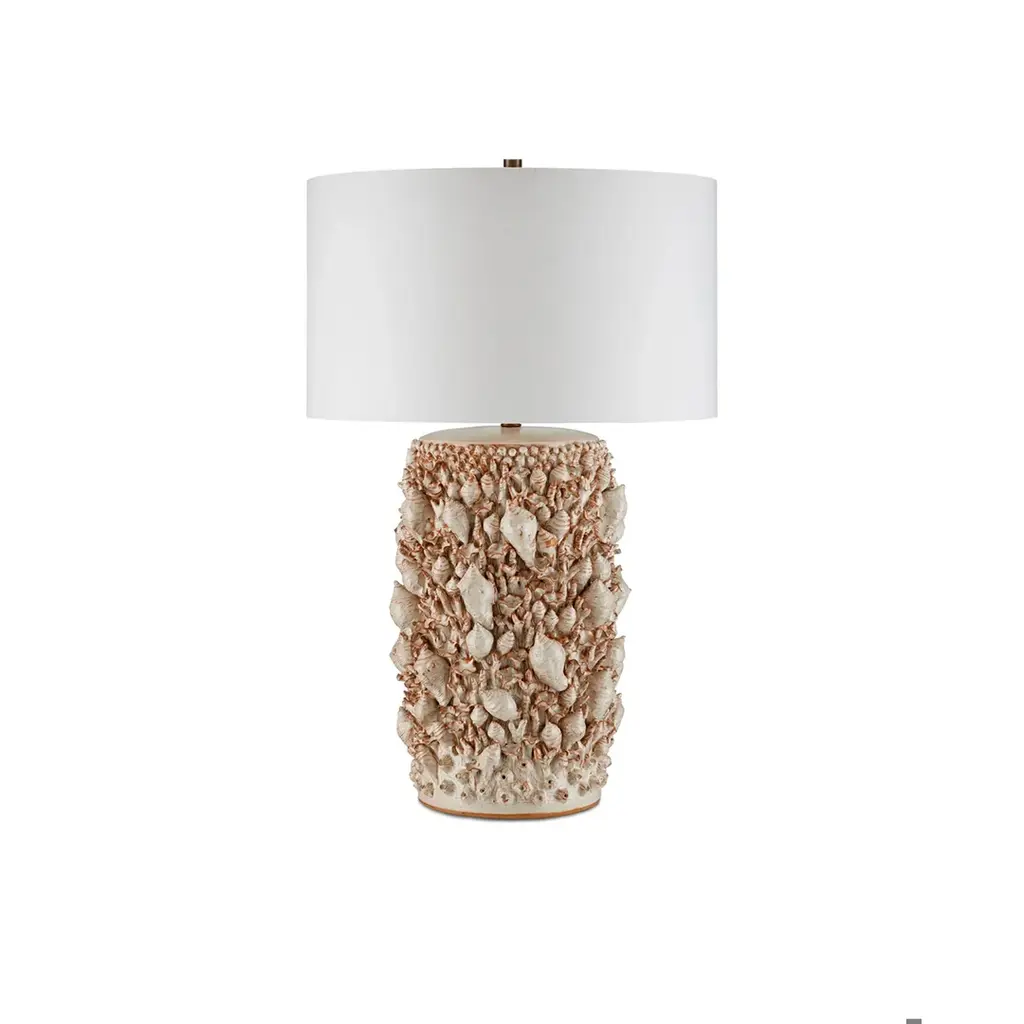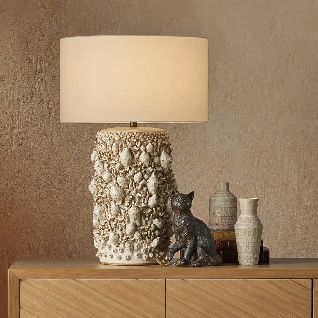 The coastal vibes of the Corfu Ivory Table Lamp are created by the tremendous amount of effort that into the surface ornamentation. Representations of whelk and snail shells are interspersed with barnacles and pieces of coral, all made of dark ceramic clay. The entire composition is covered in a milky white finish that rests in greater thickness in some spots than in others. Made by a group of women who live at the border of Burma and Thailand, the incredible ivory lamp is built by hand, layer-by-layer, one motif at a time to bring it tremendous character. In Stock Late May 2026 This image is for illustrative purposes only. The colors shown are accurate within the constraints of lighting, photography, and the color accuracy of your screen.