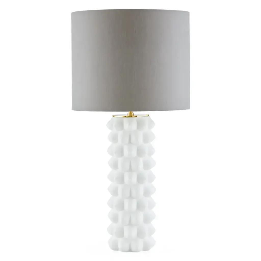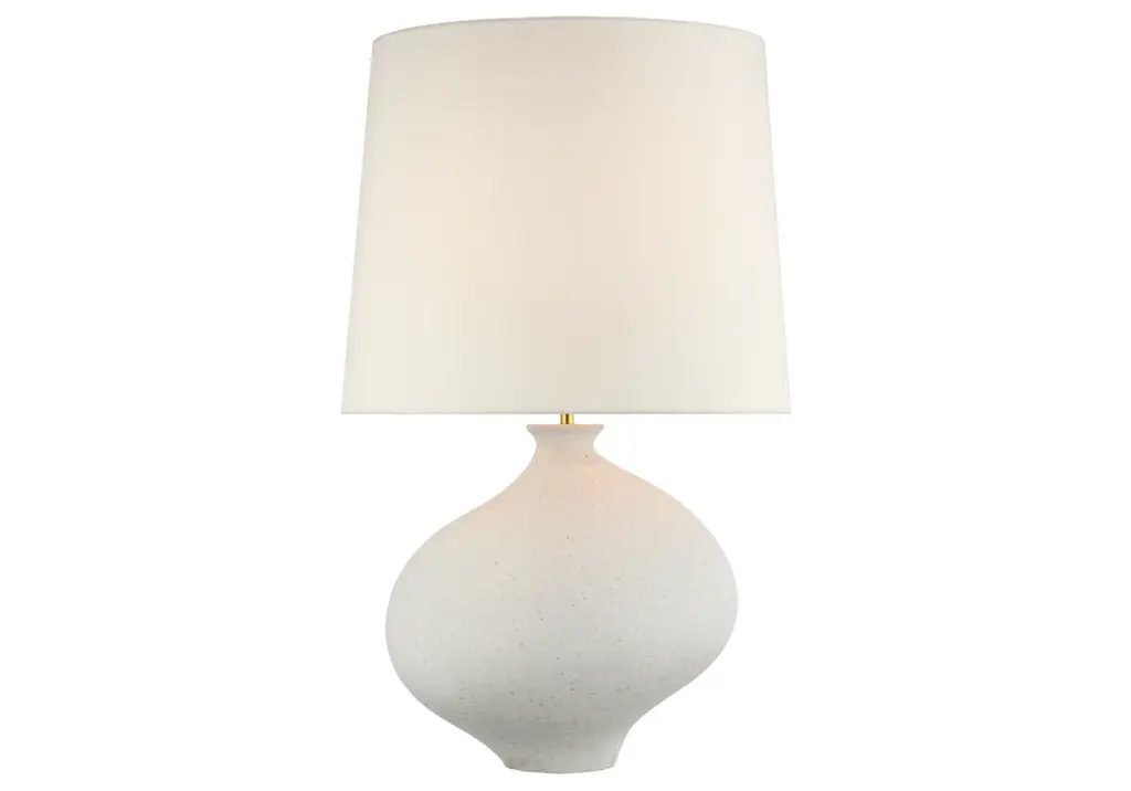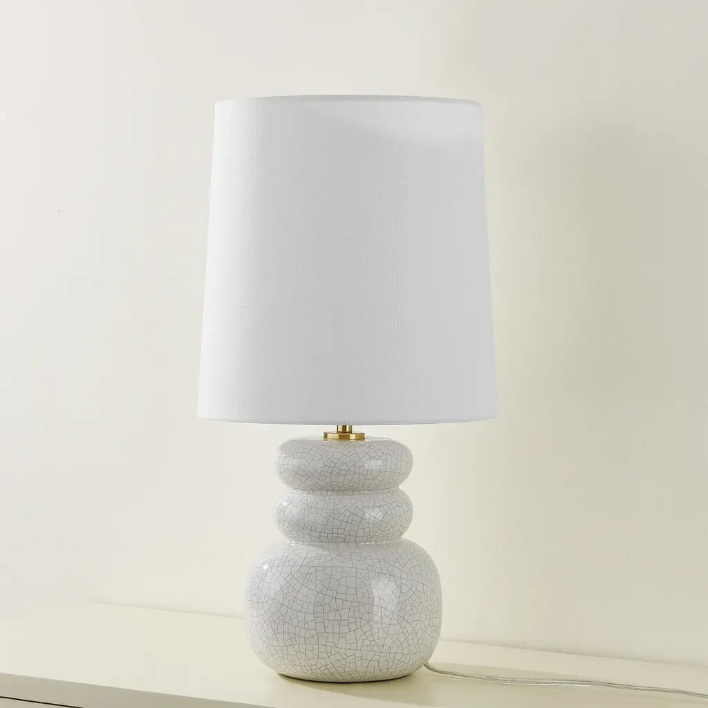 In a petite size, this playful, pillowy table lamp makes a charming statement with its stacked ceramic forms. The crackled nature of the finish and soft, blush-toned Peignoir hue create a sense of movement that draws the eye. A tall linen shade adds an unexpected sense of verticality, enhancing the whimsical feel of Corinne. Part of our Zoe Feldman collection.