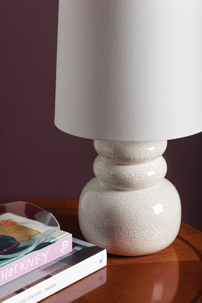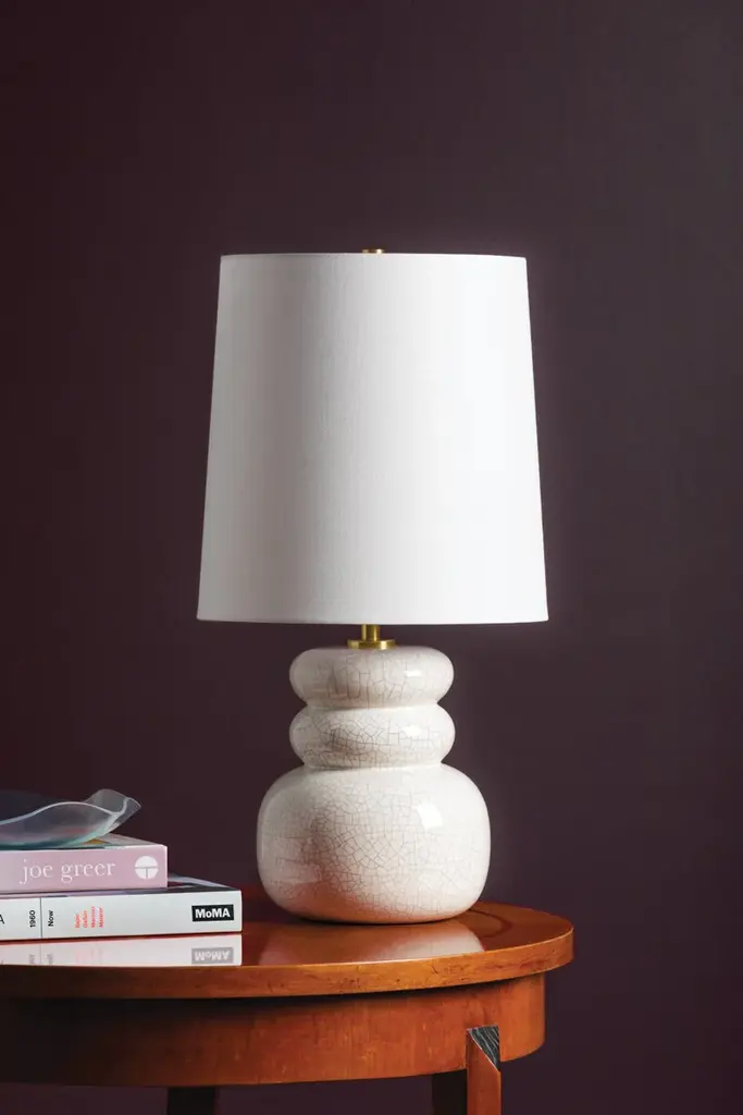In a petite size, this playful, pillowy table lamp makes a charming statement with its stacked ceramic forms. The crackled nature of the finish and soft, blush-toned hue create a sense of movement that draws the eye. A tall linen shade adds an unexpected sense of verticality, enhancing the whimsical feel of Corinne. Part of our Zoe Feldman collection.
