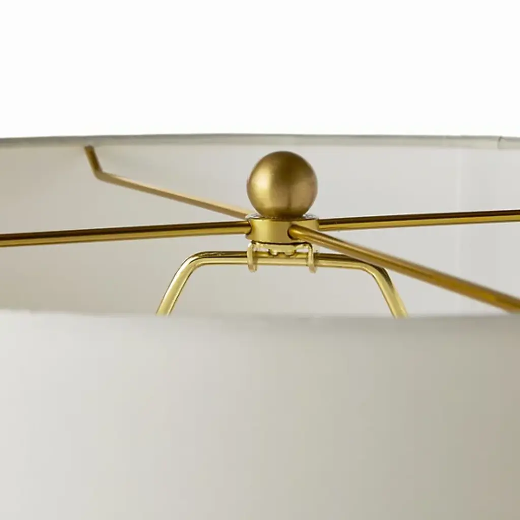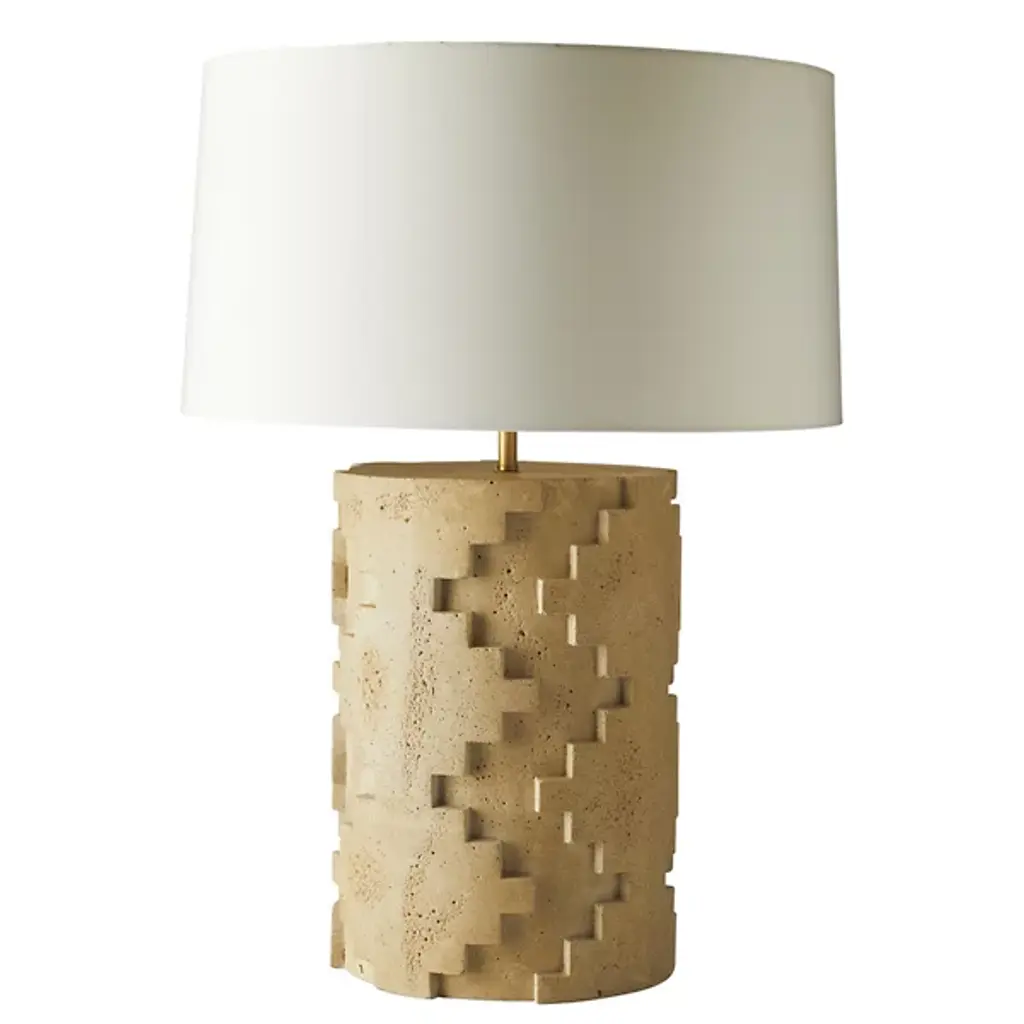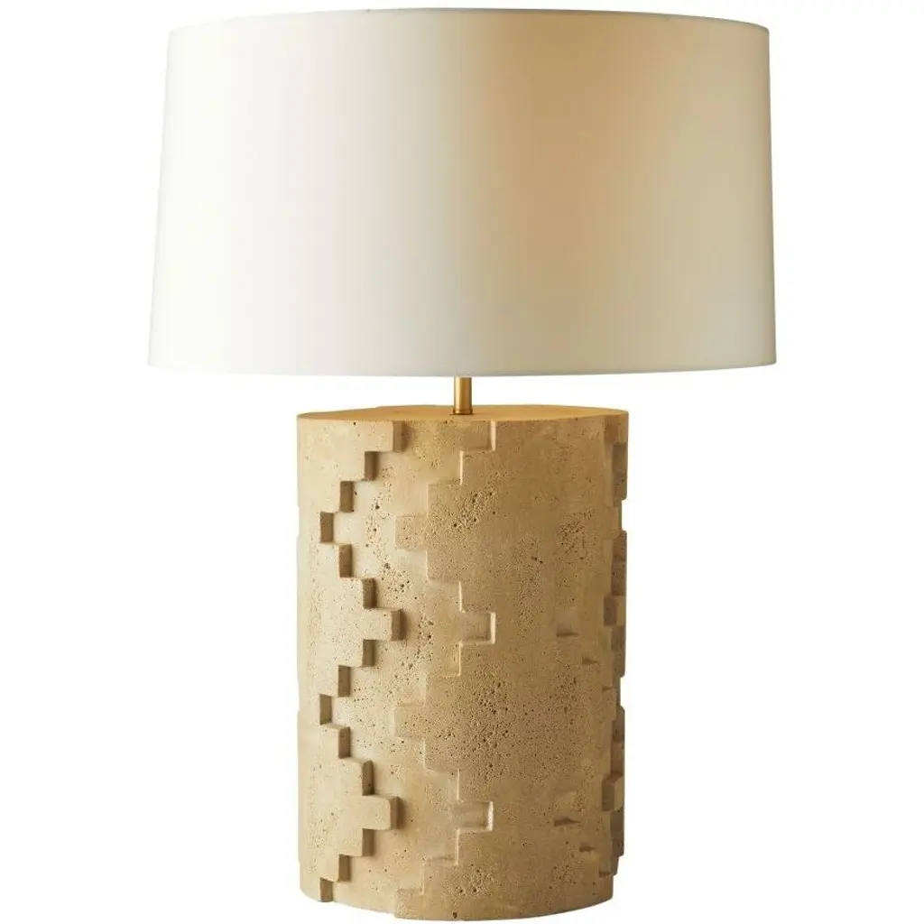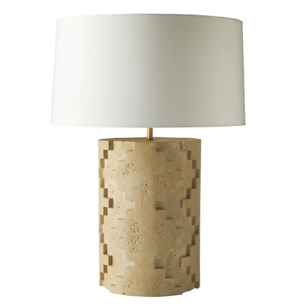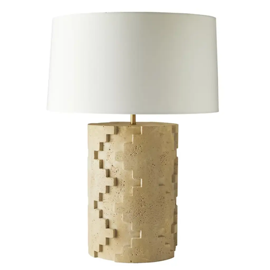 The Cornwall Texture Table Lamp from Arteriors is a cylindrical wonder, beautifully showcasing transitional style with its classical Greek-inspired design. The faux travertine resin column features a stair-stepped texture around its sides, creating intricate chevron details that form a herringbone pattern lit from above by the lamping set beneath the ivory microfiber drum shade. Complemented by antique brass-finished steel hardware, this lamp combines timeless elegance with direct contemporary design elements. Each piece features a unique finish, adding to its distinctive charm and making it a memorable addition to any surface.