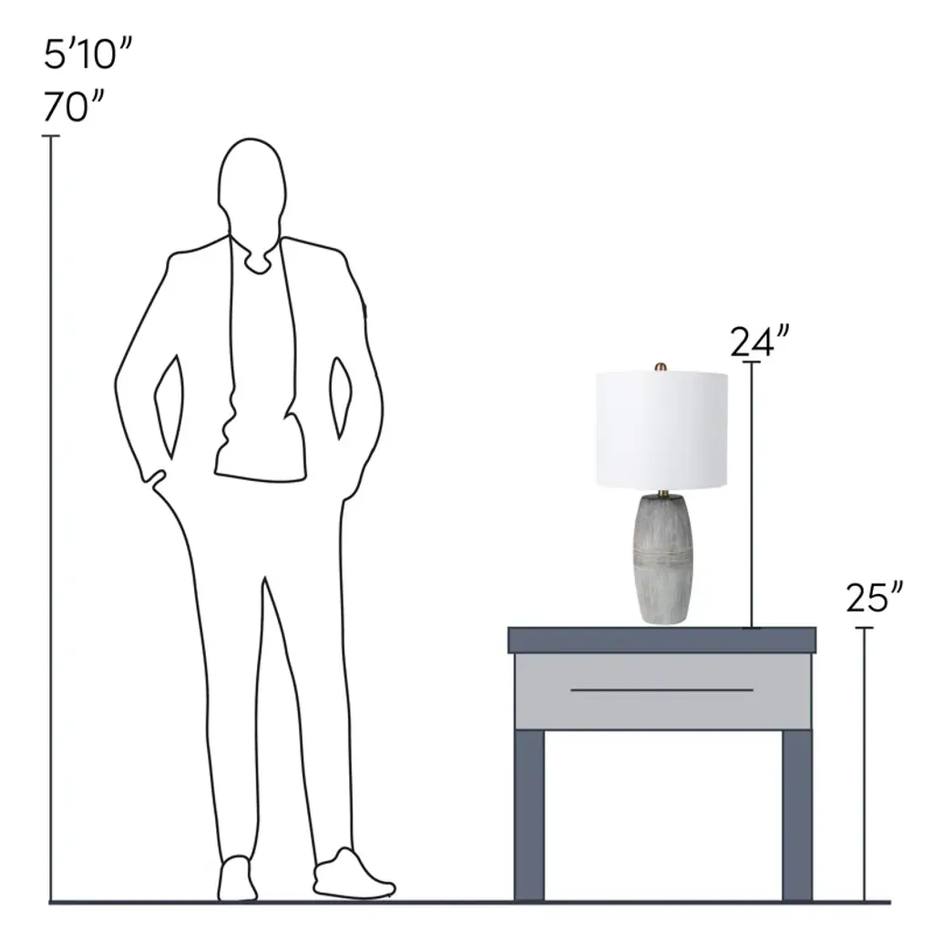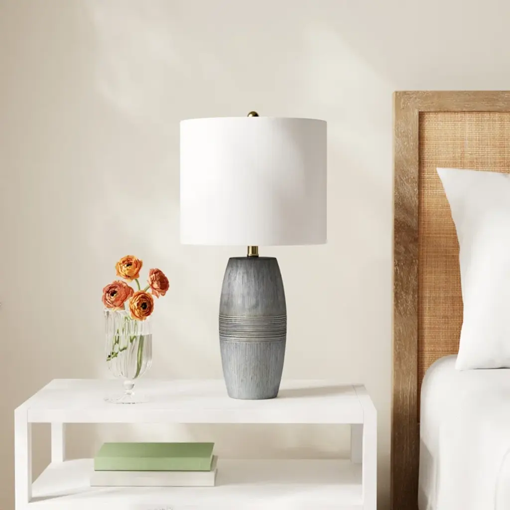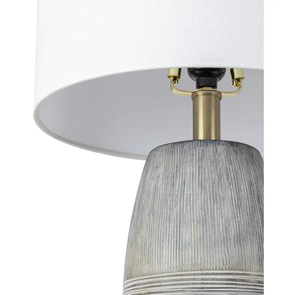 Earthy gray hues create an organic vibe in this tantalizing table lamp with etched horizontal and vertical line details. Perfect for contemporary interiors, this table lamp features a gray-glazed ceramic body topped with a white linen shade for a relaxed, down-to-earth appeal. Crafted in China from linen, ceramic, and metal. For optimal product care, wipe clean with a dry cloth as needed.