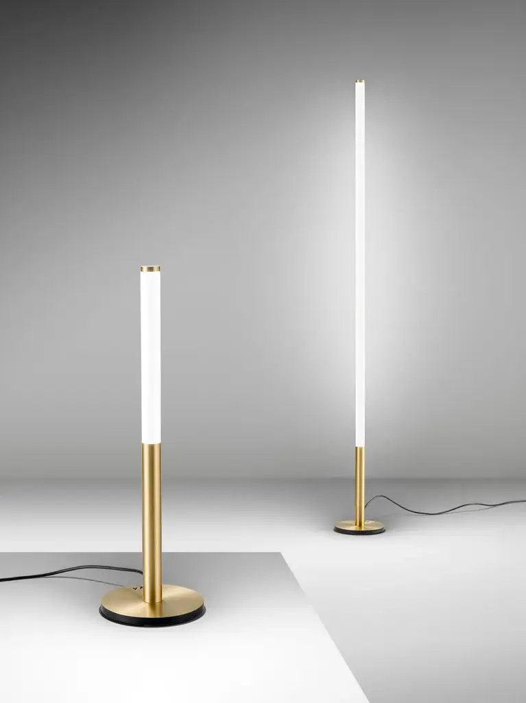 COSIMA is a table lamp made for methacrylate, brass and aluminium.A blade of light that draws spaces with its minimal lines, a luminous tube in opal plexiglass (available in different lengths) with the metal frame in brass or in painted metal. Cosima is an extremely flexible lamp that stimulates the designer’s creativity. It can be used individually but also allows you to create custom compositions on the walls or to imagine spectacular suspended solutions even in large environments.Light Source:-LED 5W - 3000K - 342 LmDimming:PUSH